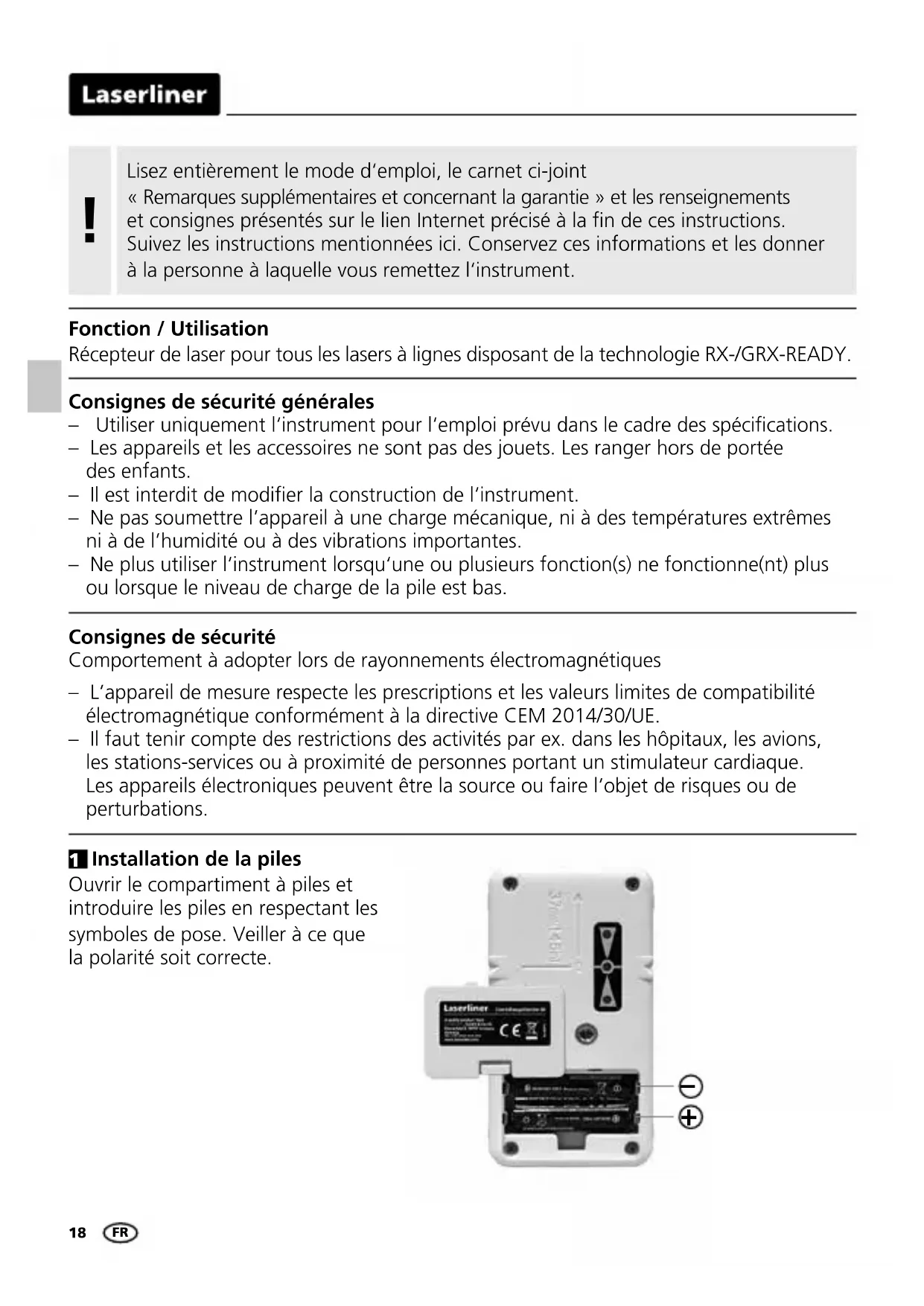 Consignes de sécurité générales – Utiliser uniquement l‘instrument pour l‘emploi prévu dans le cadre des spécications. – Les appareils et les accessoires ne sont pas des jouets. Les ranger hors de portée des enfants. – Il est interdit de modier la construction de l‘instrument. – Ne pas soumettre l’appareil à une charge mécanique, ni à des températures extrêmes ni à de l’humidité ou à des vibrations importantes. – Ne plus utiliser l‘instrument lorsqu‘une ou plusieurs fonction(s) ne fonctionne(nt) plus ou lorsque le niveau de charge de la pile est bas. Consignes de sécurité Comportement à adopter lors de rayonnements électromagnétiques – L’appareil de mesure respecte les prescriptions et les valeurs limites de compatibilité électromagnétique conformément à la directive CEM 2014/30/UE. – Il faut tenir compte des restrictions des activités par ex. dans les hôpitaux, les avions, les stations-services ou à proximité de personnes portant un stimulateur cardiaque. Les appareils électroniques peuvent être la source ou faire l‘objet de risques ou de perturbations. Fonction / Utilisation Récepteur de laser pour tous les lasers à lignes disposant de la technologie RX-/GRX-READY. Installation de la piles Ouvrir le compartiment à piles et introduire les piles en respectant les symboles de pose. Veiller à ce que la polarité soit correcte.