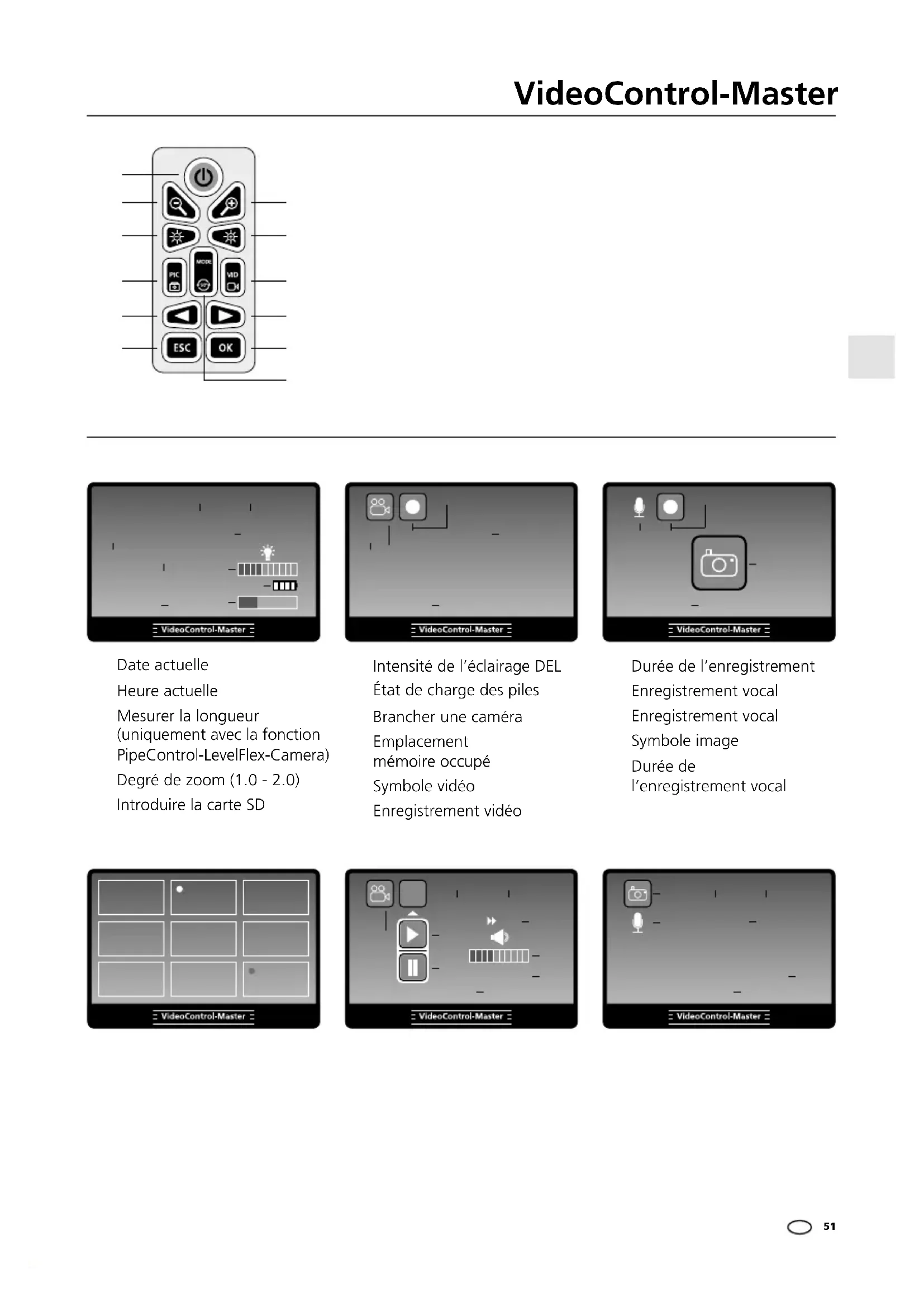 Date actuelle Heure actuelle Mesurer la longueur (uniquement avec la fonction PipeControl-LevelFlex-Camera) Degré de zoom (1.0 - 2.0) Introduire la carte SD Intensité de l’éclairage DEL État de charge des piles Brancher une caméra Emplacement mémoire occupé Symbole vidéo Enregistrement vidéo Durée de l‘enregistrement Enregistrement vocal Enregistrement vocal Symbole image Durée de l‘enregistrement vocal1 2