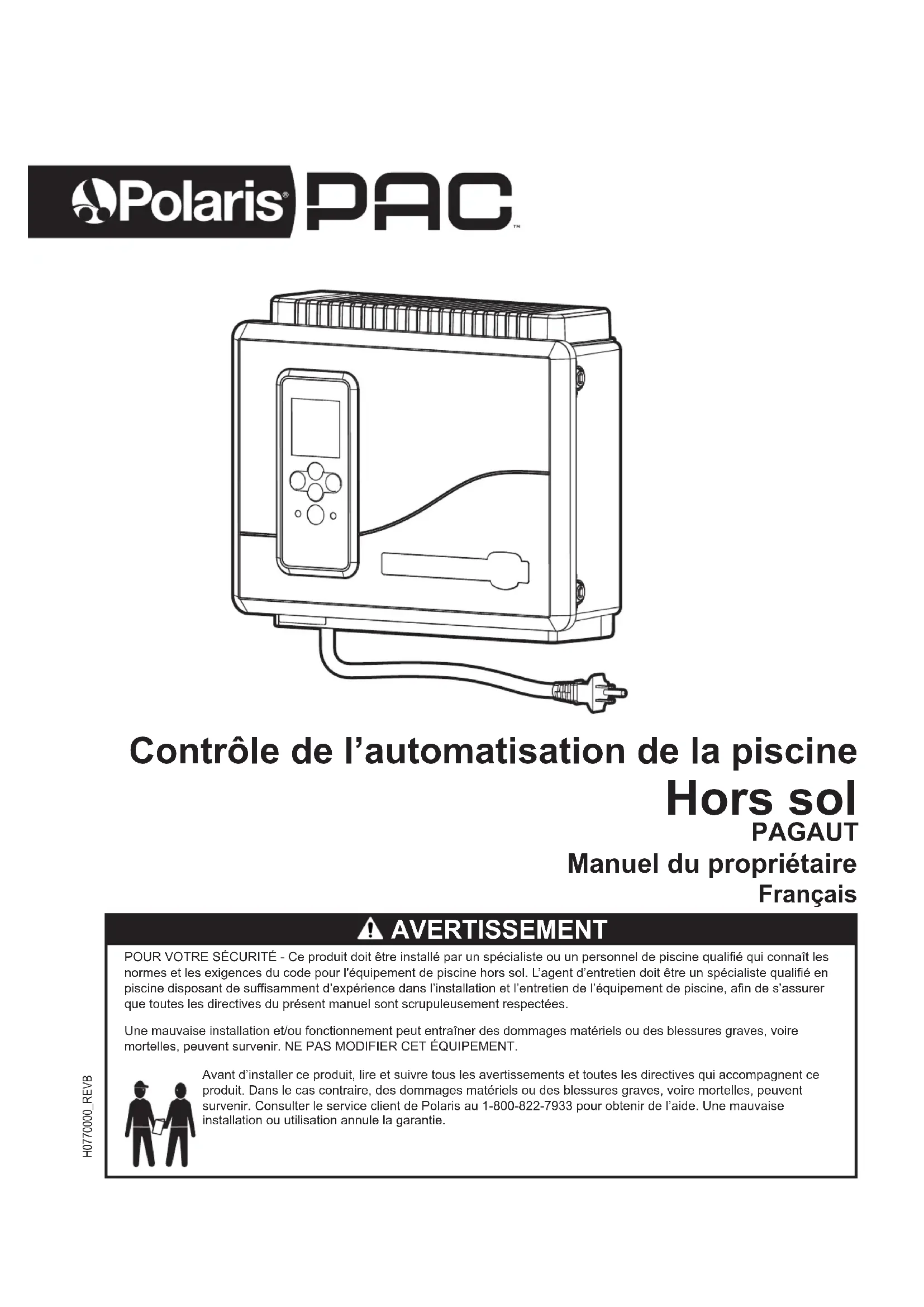 218.1H0770000_REVB Contrôle de l’automatisation de la piscine Hors sol PAGAUT Manuel du propriétaire Français AVERTISSEMENT POUR VOTRE SÉCURITÉ - Ce produit doit être installé par un spécialiste ou un personnel de piscine qualié qui connaît les normes et les exigences du code pour l'équipement de piscine hors sol. L’agent d’entretien doit être un spécialiste qualié en piscine disposant de susamment d’expérience dans l’installation et l’entretien de l’équipement de piscine, an de s’assurer que toutes les directives du présent manuel sont scrupuleusement respectées.Une mauvaise installation et/ou fonctionnement peut entraîner des dommages matériels ou des blessures graves, voire mortelles, peuvent survenir. NE PAS MODIFIER CET ÉQUIPEMENT. Avant d’installer ce produit, lire et suivre tous les avertissements et toutes les directives qui accompagnent ce produit. Dans le cas contraire, des dommages matériels ou des blessures graves, voire mortelles, peuvent survenir. Consulter le service client de Polaris au 1-800-822-7933 pour obtenir de l’aide. Une mauvaise installation ou utilisation annule la garantie.FRANÇAIS Polaris
