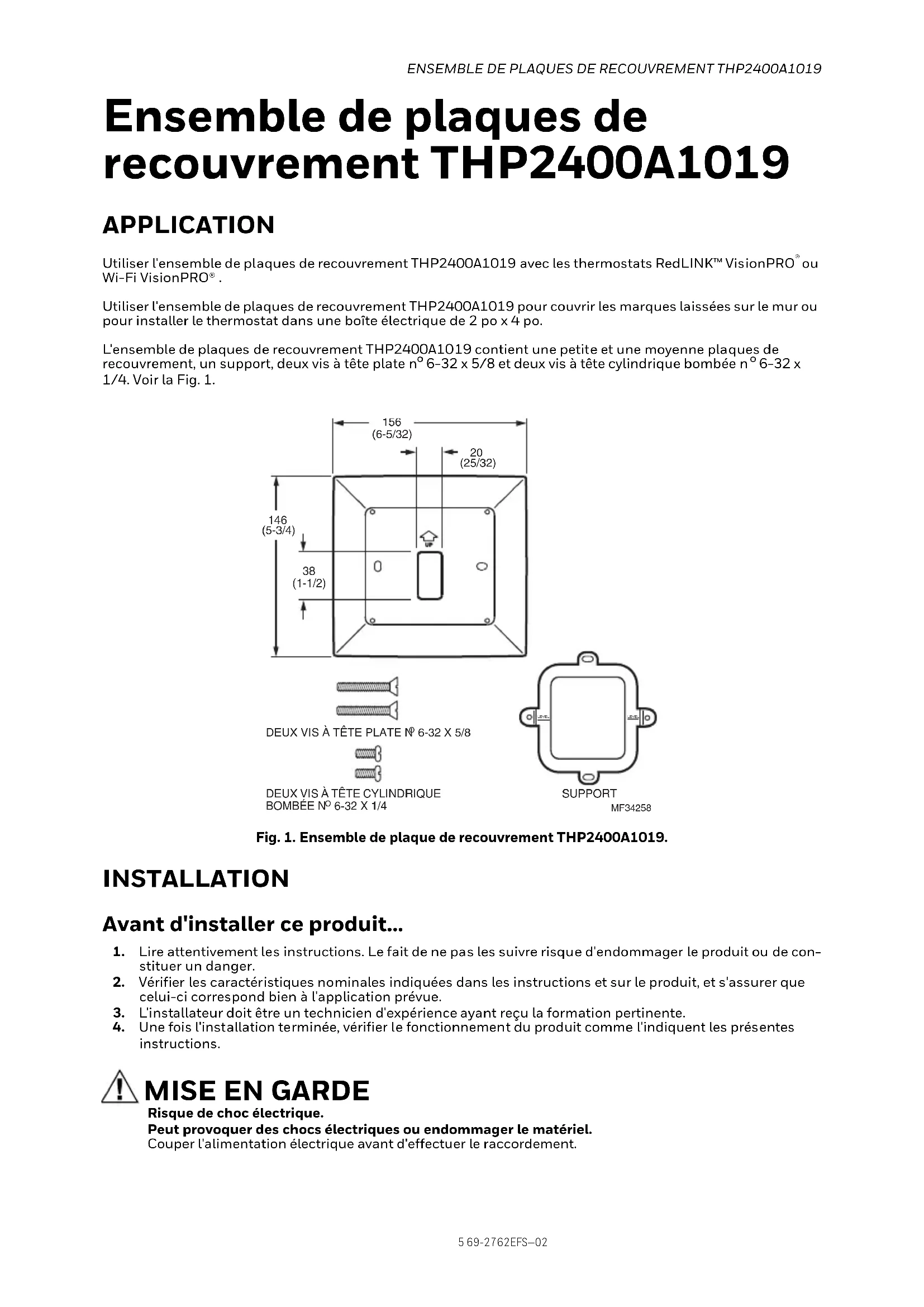 Wi-Fi VisionPRO® . Utiliser l'ensemble de plaques de recouvrement THP2400A1019 pour couvrir les marques laissées sur le mur ou pour installer le thermostat dans une boîte électrique de 2 po x 4 po. L'ensemble de plaques de recouvrement THP2400A1019 contient une petite et une moyenne plaques de recouvrement, un support, deux vis à tête plate n