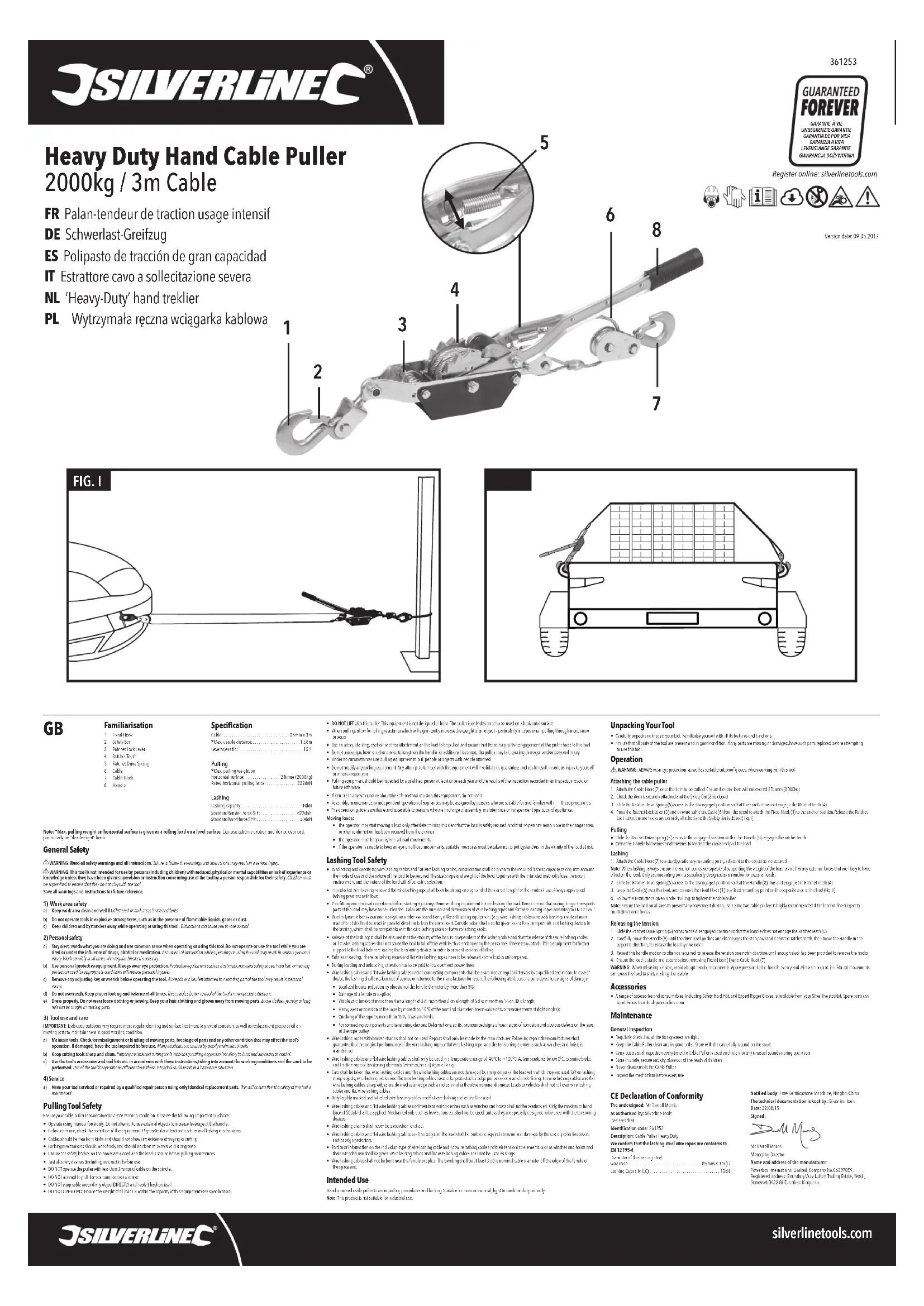 Organisme notié : EnteCerticazioneMacchine,Ningbo,ChinaLa documentation technique est conservée par : Silverline ToolsDate 22/08/15Signature : M. Darrell MorrisDirecteur général Nom et adresse du fabricant ou de son représentant agréé :PowerboxInternationalLimited,entrepriseenregistréesouslenuméro06897059.Siègesocial:Powerbox,BoundaryWay,LuftonTradingEstate,Yeovil,SomersetBA228HZ,RoyaumeUni. Caractéristiques techniques Câble:. . . . . . . . . . . . . . . . . . . . . . . . . . . . . . Ø 5 mm x 3 m *Utilisableàunedistancemax: .............. 1,68 m Rapport de levage : ............................15:1 Traction *Capacité de traction max. : ........2 tonnes (2 000 kg)Force de traction horizontale estimée :. . . . . . . . 822 daN Arrimage Capacité d’arrimage : .........................10 kNEffort de tension normalisé (STF) : ...........822 daNEffort manuel standard SHF: ................. 50 daN Descriptif du produit 1. Crochetxe2. Linguet3. Levier de verrouillage du cliquet 4. Dents du cliquet 5. Ressort du cliquet6. Câble7. Crochetsurcâble8. Poignée Remarque : la capacité de traction est donnée par rapport à une charge roulante sur une surface plane. Soyez extrêmement prudents et veillez à ne pas travailler en surcharge, particulièrement en cas de charge de « poids mort ». Avertissements généraux de sécurité AVERTISSEMENT : Veuillez lire l’intégralité des consignes de sécurité et des instructions. Le non-respect de ces consignes et instructions peut entraîner un risque de choc électrique, d’incendie et/ou se traduire par des blessures graves. AVERTISSEMENT : Cet appareil n’est pas conçu pour être utilisé par des personnes (enfants compris) ayant des capacités physiques ou mentales réduites, ou n’ayant pas la connaissance ou l’expérience requise, à moins d’être sous la supervision d’une personne responsable de leur sécurité ou d’avoir reçu les instructions nécessaires. Les enfants ne doivent pas s’approcher et jouer avec cet appareil. Veuillez conserver ces instructions et consignes de sécurité pour référence ultérieure.