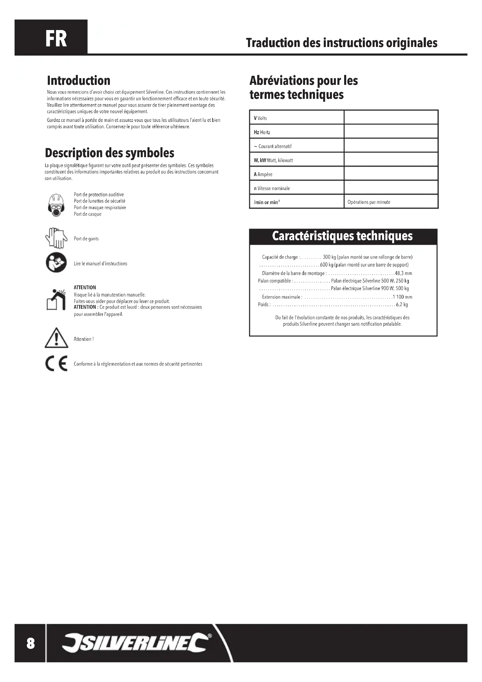 Capacité de charge :.......... 300 kg (palan monté sur une rallonge de barre) ............................600 kg (palan monté sur une barre de support) Diamètre de la barre de montage : ...............................48,3 mm Palan compatible : .................Palan électrique Silverline 500 W, 250 kg .................................Palan électrique Silverline 900 W, 500 kg Extension maximale : .........................................1 100 mm Poids : .........................................................6,2 kgDufaitdel’évolutionconstantedenosproduits,lescaractéristiquesdes produitsSilverlinepeuventchangersansnoticationpréalable. Introduction Nousvousremercionsd’avoirchoisicetéquipementSilverline.Cesinstructionscontiennentlesinformationsnécessairespourvousengarantirunfonctionnementefcaceetentoutesécurité.Veuillez lire attentivement ce manuel pour vous assurer de tirer pleinement avantage des caractéristiques uniques de votre nouvel équipement. Gardezcemanuelàportéedemainetassurez-vousquetouslesutilisateursl’aientluetbiencompris avant toute utilisation. Conservez-le pour toute référence ultérieure. Traduction des instructions originales Caractéristiques techniques V VoltsHz Hertz~ Courant alternatifW, kW Watt,kilowattA Ampèren Vitesse nominale/min or min Opérationsparminute 407455_Manual.indd 8 20/09/2018 10:40Bras de support pour palan407455