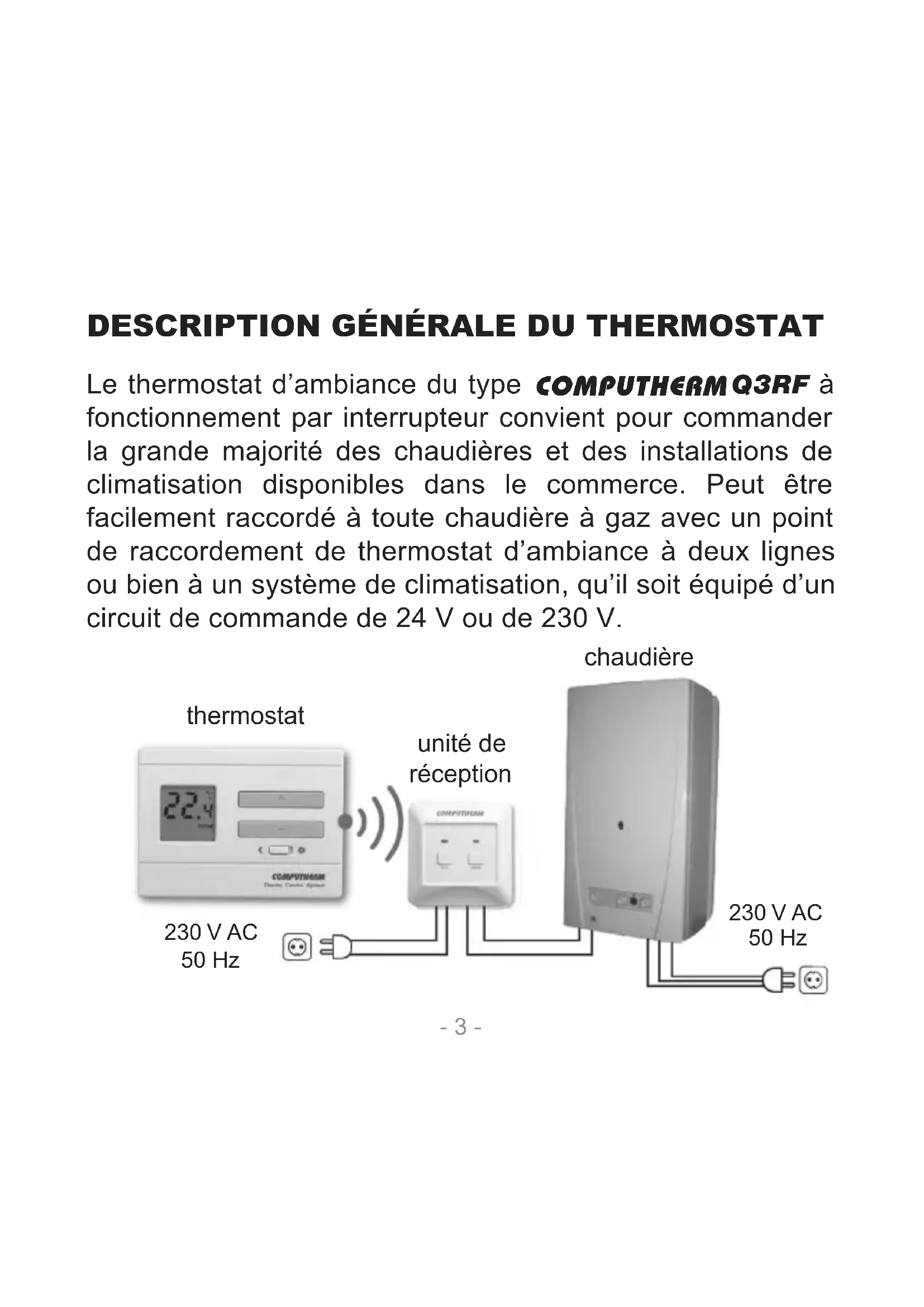 Le thermostat d’ambiance du type COMPUTHERM Q3RF à fonctionnement par interrupteur convient pour commander la grande majorité des chaudières et des installations de climatisation disponibles dans le commerce. Peut être facilement raccordé à toute chaudière à gaz avec un point de raccordement de thermostat d’ambiance à deux lignes ou bien à un système de climatisation, qu’il soit équipé d’un circuit de commande de 24 V ou de 230 V. 230 V AC 50 Hz230 V AC 50 Hz chaudière unité de réception thermostat- 4 - Son affichage numérique permet une mesure et un réglage de la température plus précis que les thermostats traditionnels. Le thermostat allume ou éteint la chaudière ou tout autre appareil en mode de chauffage en dessous ou au-dessus de la température de consigne selon la sensibilité de commutation choisie, et en assurant le confort contribue également à réduire les coûts énergétiques. En mode de refroidissement, le thermostat commute dans l’autre sens. Achage de la température Unité de la température Lieu de la température mesurée Achage de la température de consigne Signe du type de fonctionnement de la chaudière Signe de fonctionne- ment du climatiseur Informations apparaissant sur l’achage à cristaux liquides du thermostat :- 5 - L’appareil est composé de deux éléments. L’un est l’unité de contrôle mobile (le thermostat), l’autre est le récepteur qui eectue le contrôle de la chaudière. Il existe une connexion sans l (radio) entre les deux appareils, il n’est donc pas nécessaire de connecter physiquement le thermostat et la chaudière. Les deux unités sont réglées d’usine de manière à pouvoir fonctionner sur la même fréquence. Le thermostat et son récepteur ont leur propre code de sécurité, ce qui garantit le fonctionnement sûr de l’appareil. Pour l’installation, le raccordement et l’adaptation au thermostat, voir le chapitre 7. An d’augmenter la durée de vie des batteries, le thermostat ne rayonne pas en continu, mais l’ordre de commutation actuel est répété à intervalles de 5 minutes. Cela garantit le contrôle du chauage (ou du refroidissement) même après une panne de courant. La mobilité du thermostat présente les avantages suivants: – aucune ligne ne doit être construite, ce qui est avantageux particulièrement lors de la modernisation de vieux bâtiments.- 6 - - le positionnement optimal de l’appareil peut être sélectionné pendant l’utilisation, - son utilisation est également avantageuse si l’on souhaite placer le thermostat dans une pièce diérente en fonction de la période de la journée (par ex., pendant la journée dans le salon, mais pour la nuit dans la chambre). La portée de l’émetteur intégré dans le thermostat est d’environ 50 m dans les lieux publics. Cette portée peut être considérablement réduite à l’intérieur du bâtiment, en particulier si des structures métalliques, du béton armé ou des murs d’adobe se trouvent sur le trajet des ondes radio. Le thermostat sans l (par radiofréquence) que vous venez d’acheter peut être complété par la douille de type COMPUTHERM Q1RX si nécessaire, ce qui permet de commander facilement tout appareil électrique (par ex., chaudière, pompe, radiateur, etc.) fonctionnant sur 230 V (50 Hz, max. 10 A) de la température ambiante. (Vous pouvez trouver une description détaillée de la douille COMPUTHERM Q1RX et des suggestions d’utilisation sur notre site Web : www.computherm.info).- 7 - Le thermostat COMPUTHERM Q3RF peut également être utilisé pour l’extension des appareils multizones COMPUTHERM Q5RF ou Q8RF. L’utilisation simultanée de plusieurs thermostats d’ambiance COMPUTHERM et d’un contrôleur de zone COMPUTHERM Q4Z vous permet de contrôler une pompe ou une vanne de zone en outre de par ex., démarrer un appareil de chauage ou un refroidisseur. De cette manière, il est facile de diviser un système de chauage/refroidissement en zones, grâce à quoi le chauage/refroidissement de chaque pièce peut être contrôlé séparément, augmentant ainsi considérablement le confort. En outre, le zonage du système de chauage/refroidissement contribuera considérablement à la réduction des coûts énergétiques, car cela ne chauera/ne refroidira toujours que les pièces où cela est nécessaire. Ne l’utilisez pas dans des endroits humides, chimiquement agressifs ou poussiéreux.