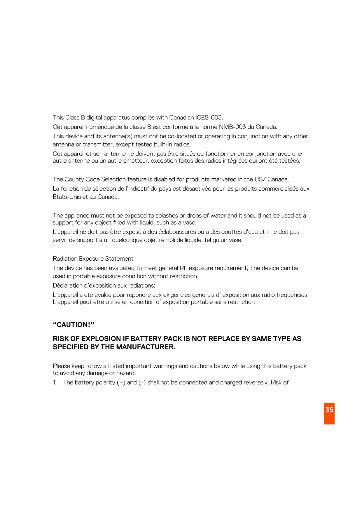 est susceptible d’en compromettre le fonctionnement.35 This Class B digital apparatus complies with Canadian ICES-003. Cet appareil numérique de la classe B est conforme à la norme NMB-003 du Canada. This device and its antenna(s) must not be co-located or operating in conjunction with any other antenna or transmitter, except tested built-in radios. Cet appareil et son antenne ne doivent pas être situés ou fonctionner en conjonction avec une autre antenne ou un autre émetteur, exception faites des radios intégrées qui ont été testées. The County Code Selection feature is disabled for products marketed in the US/ Canada. La fonction de sélection de l’indicatif du pays est désactivée pour les produits commercialisés aux États-Unis et au Canada. The appliance must not be exposed to splashes or drops of water and it should not be used as a support for any object lled with liquid, such as a vase. L’appareil ne doit pas être exposé à des éclaboussures ou à des gouttes d’eau et il ne doit pas servir de support à un quelconque objet rempli de liquide, tel qu’un vase. Radiation Exposure Statement The device has been evaluated to meet general RF exposure requirement, The device can be used in portable exposure condition without restriction. Déclaration d’exposition aux radiations: L’appareil a ete evalue pour repondre aux exigencies generals d’ exposition aux radio frequencies. L’appareil peut etre utilise en condition d’ exposition portable sans restriction “CAUTION!” RISK OF EXPLOSION IF BATTERY PACK IS NOT REPLACE BY SAME TYPE AS SPECIFIED BY THE MANUFACTURER. Please keep follow all listed important warnings and cautions below while using this battery pack to avoid any damage or hazard.