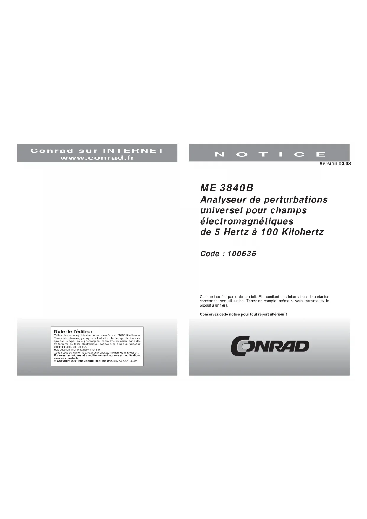 Note de l’éditeur Cette notice est une publication de la société Conrad, 59800 Lille/France.Tous droits réservés, y compris la traduction. Toute reproduction, quelque soit le type (p.ex. photocopies, microfilms ou saisie dans destraitements de texte électronique) est soumise à une autorisationpréalable écrite de l’éditeur.Reproduction, même partielle, interdite.Cette notice est conforme à l’état du produit au moment de l’impression.Données techniques et conditionnement soumis à modificationssans avis préalable.© Copyright 2001 par Conrad. Imprimé en CEE. XXX/04-08/JV ME 3840B Analyseur de perturbations universel pour champs électromagnétiques de 5 Hertz à 100 Kilohertz Code : 100636 Cette notice fait partie du produit. Elle contient des informations importantesconcernant son utilisation. Tenez-en compte, même si vous transmettez leproduit à un tiers.Conservez cette notice pour tout report ultérieur ! NOTICE Conrad sur INTERNET www.conrad.fr Version 04/08Manuel d’utilisation Il est impératif de consulter ce manuel avant la première utilisation. Il contient des remarques importantes concernant la sécurité, l’usage et l’entretien de l’appareil. Ces analyseurs d’intensité de champs électromagnétiques de la série de construction ME 3 des SOLUTIONS GIGAHERTZ imposent de nouveaux critères de grandeurs en ce qui concerne la technique de mesure de champs alternatifs de basses fréquences : Une technique de mesure professionnelle fut réalisée pour un rapport qualité-prix unique au monde. Ceci fut possible par la mise en place d’éléments de circuits pour lesquels on a déposé un brevet ainsi que par le procédé de fabrication le plus moderne. Cet appareil, dont vous avez fait l’acquisition, vous permettra d’obtenir une information qualifiée d’un indice de confiance sur l’exposition à des champs alternatifs électriques et magnétiques conformément à la procédure de mesure des directives des postes vidéo reconnues internationalement et de la biologie de construction (TCO/MPR) dans le champ de fréquences de 5 Hz à 100 KHz. Cet analyseur ME 3840B est conforme aux directives CE correspondantes : 98/336/EWG, 92/31/EWG, EN50082-1 et EN55011. Nous vous remercions de votre confiance que vous nous avez témoignée par l’achat de cet analyseur ME 3840B. Nous sommes persuadés qu’il conviendra à vos attentes et nous vous souhaitons beaucoup de plaisir dans l’utilisation de cet appareil. Consignes de sécurité Nous vous prions de lire attentivement cette notice avant la première mise en service de cet appareil. Elle vous donnera les consignes de sécurité, d’utilisation et d’entretien de cet appareil. La mise à la terre de l’appareil de mesure par le câble ci-joint, nécessaire pour la mesure du champ électrique, devrait être installée sur une conduite d’eau, de gaz ou de chauffage. S’il n’existe aucune autre possibilité de mise à la terre, l’électricien peut relier à la terre par le fil conducteur de protection de la mise à la terre. Dans ce cas, il peut y avoir un danger de chocs électriques, si la borne de terre entre en contact avec la phase conductrice. Ne mettez pas l’appareil en contact avec l’eau ou la pluie. Nettoyez l’appareil de l’extérieur avec un chiffon légèrement humide. N’utilisez pas de détergents ou sprays. Avant de procéder au nettoyage ou à l’ouverture du boîtier, il convient de débrancher l’appareil et de retirer tous ceux liés à l’appareil par le câble. Toutes pièces à l’intérieur de ce boîtier nécessitent un entretien par un spécialiste. 2 23On entend souvent parler de mesures de protections contre les sources de champs. C’est un sujet extrêmement délicat. Une protection doit absolument être installée par un professionnel expérimenté, car une mise à la terre défectueuse aura à peu près l’effet inverse : la protection servira d’antenne pour les champs de toutes les fréquences. Ne prenez en aucun cas des mesures sanitaires coûteuses et de grande ampleur ou ne planifiez pas de déménagement avant d’avoir consulté un expert qualifié en construction écobiologique. Vous trouverez des coordonnées dans le chapitre littérature ou sur notre site www.gigahertz-solutions.de. Vous y trouverez également un exposé sur les installations électriques écobiologiques utiles. Littérature Wolfgang Maes : Stress durch Strom und Strahlung, IBN Institut für Baubiologie + Okologie, Holzham 25, 83115 Neubeuern (à recommander aux non initiés grâce à beaucoup d’exemples pratiques facilement compréhensibles) Verbraucherzentrale Niedersachsen e.V : Wir reden von Elektrosmog, Hannover (actualisé tous les ans) Wohnung und Gesundheit, vierteljahrige Zeitschrifft, IBN (s.o) Elektrosmog-Report im Strahlentelex, Monatszeitschrifft, Verlag Thomas Dersee, Berlin Vous trouverez beaucoup d’autres sources dans les livres mentionnés ci dessus. Retrouvez de nombreux liens sur ce thème sur notre site www.gigahertz-solutions.de En raison de la haute résolution de cet appareil de mesure, l’électronique est sensible à la chaleur, aux secousses. C’est pourquoi il est recommandé de ne pas l’exposer au soleil ou à la chaleur, de ne pas le laisser tomber ou le manipuler à boîtier ouvert. N’utilisez cet appareil qu’à des fins prévues à cet effet et les pièces de rechange fournies et recommandées. Instruction concernant la mesure Remarque préliminaire Vous trouverez dans la brochure ci-jointe des informations de fond concernant l’impact des champs alternatifs électromagnétiques sur le corps humain, les instructions techniques et les actions correctives. Le dispositif de préparation à la mesure.