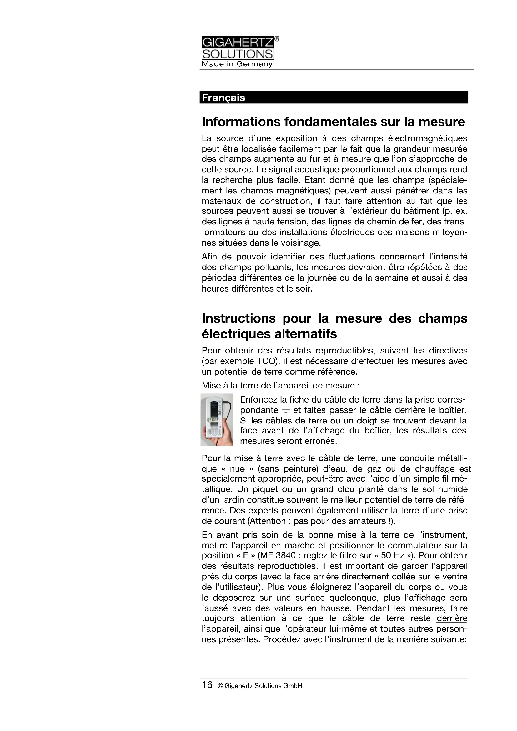 Batteria, Auto-Power-Off, Low batt. Lo strumento funziona con batterie a blocco da 9 V. Lo scompar- to batterie si trova in basso sul lato posteriore dello strumento. Lo strumento si spegne automaticamente dopo essere rimasto acceso per ca. 40 minuti per limitare il consumo della batteria. Se al centro del display compare il segnale verticale ‘‘Low Batt’’ tra i numeri, lo strumento si spegne automaticamente dopo 3 mi- nuti. Non è più possibile eseguire misurazioni attendibili.Made in Germany © Gigahertz Solutions GmbH 15 Cosa fare per ridurre l’esposizione Se possibile: aumentare la distanza dalla sorgente del campo! ‘‘Inserire nelle prese con le fasi giuste’’ Mettere lo strumento in posizione "E" e posizionarlo per esempio tra la lampada da letto e il cuscino. Spegnere la luce. Ricordarsi il valore indicato sul display. Estrarre la presa della lampada dalla spina, ruotarla di 180° e reinserirla. Logico: la presa va inserita nella posizione in cui il campo è minore. Questo trucco funziona al meglio se la lampada è dotata di disgiuntore di linea. Usare multiprese schermate con interruttore bipolare e linee di connessione schermate (si veda al nostro sito Internet!). Installazione di un disgiuntore di rete: Il disgiuntore di rete va inserito nella scatola dei fusibili e serve a staccare automaticamente il circuito elettrico dalla rete non appe- na viene spento l’ultimo apparecchio utilizzatore. Il circuito elettri- co così disgiunto dalla rete non è più in tensione e non può quindi più creare campi elettrici. Questa è spesso la misura che offre il miglior rapporto qualità-prezzo e per questo è spesso la prima misura adottata dagli esperti in bioedilizia nell’ambito del risana- mento di un oggetto --- e proprio gli innovativi disgiuntori di rete di Gigahertz Solutions sono nelle liste dei prodotti raccomandati da molti (si veda anche: www.gigahertz-solutions.de). Potete vedere da soli (meglio se in due) se un disgiuntore di rete è l’investimento migliore per la vostra situazione: Uno dei due legge lo strumento di misurazione posto in corri- spondenza della testiera del letto (strumento sulla posizione ‘‘E’’) L’altro accende i fusibili rilevanti ovvero spegne i circuiti elettrici nelle vicinanze. Nei circuiti elettrici che mostrano una riduzione dell’esposizione è consigliabile installare un disgiuntore di rete. Per ulteriori informazioni, letteratura e indirizzi di esperti di bioedilizia, consultare il nostro sito Internet www.gigahertz- solutions.deMade in Germany 16 © Gigahertz Solutions GmbH Français Informations fondamentales sur la mesure La source d’une exposition à des champs électromagnétiques peut être localisée facilement par le fait que la grandeur mesurée des champs augmente au fur et à mesure que l’on s’approche de cette source. Le signal acoustique proportionnel aux champs rend la recherche plus facile. Etant donné que les champs (spéciale- ment les champs magnétiques) peuvent aussi pénétrer dans les matériaux de construction, il faut faire attention au fait que les sources peuvent aussi se trouver à l’extérieur du bâtiment (p. ex. des lignes à haute tension, des lignes de chemin de fer, des trans- formateurs ou des installations électriques des maisons mitoyen- nes situées dans le voisinage. Afin de pouvoir identifier des fluctuations concernant l’intensité des champs polluants, les mesures devraient être répétées à des périodes différentes de la journée ou de la semaine et aussi à des heures différentes et le soir. Instructions pour la mesure des champs électriques alternatifs Pour obtenir des résultats reproductibles, suivant les directives (par exemple TCO), il est nécessaire d’effectuer les mesures avec un potentiel de terre comme référence. Mise à la terre de l’appareil de mesure : Enfoncez la fiche du câble de terre dans la prise corres- pondante et faites passer le câble derrière le boîtier. Si les câbles de terre ou un doigt se trouvent devant la face avant de l’affichage du boîtier, les résultats des mesures seront erronés. Pour la mise à terre avec le câble de terre, une conduite métalli- que « nue » (sans peinture) d’eau, de gaz ou de chauffage est spécialement appropriée, peut-être avec l’aide d’un simple fil mé- tallique. Un piquet ou un grand clou planté dans le sol humide d’un jardin constitue souvent le meilleur potentiel de terre de réfé- rence. Des experts peuvent également utiliser la terre d’une prise de courant (Attention : pas pour des amateurs !). En ayant pris soin de la bonne mise à la terre de l’instrument, mettre l’appareil en marche et positionner le commutateur sur la position « E » (ME 3840 : réglez le filtre sur « 50 Hz »). Pour obtenir des résultats reproductibles, il est important de garder l’appareil près du corps (avec la face arrière directement collée sur le ventre de l’utilisateur). Plus vous éloignerez l’appareil du corps ou vous le déposerez sur une surface quelconque, plus l’affichage sera faussé avec des valeurs en hausse. Pendant les mesures, faire toujours attention à ce que le câble de terre reste derrière l’appareil, ainsi que l’opérateur lui-même et toutes autres person- nes présentes. Procédez avec l’instrument de la manière suivante:Made in Germany © Gigahertz Solutions GmbH 17 - Traverser lentement la pièce, s’arrêter de temps en temps, et mesurer l’intensité de champ en pivotant l’appareil tout autour, vers le haut et vers le bas. - Continuer les mesures dans la direction de l’intensité la plus élevée pour identifier la source la plus intense. - Pour le lit ou la station de travail, effectuez les mesures très soigneusement et dans toutes directions, car en géné- ral les valeurs-ci sont les plus importantes en terme d’exposition. - Pour l’examen, il faudra procéder selon les conditions les plus proches de la réalité quotidienne, 
