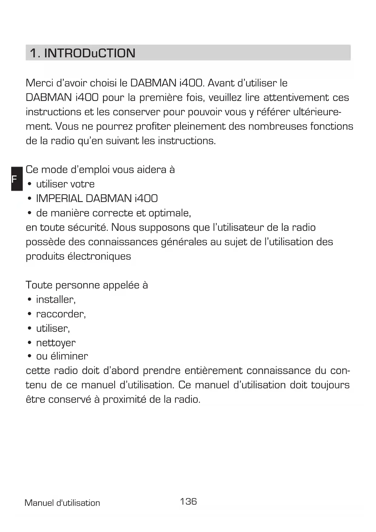 - ou éliminer cette radio doit d’abord prendre entièrement connaissance du con- tenu de ce manuel d’utilisation. Ce manuel d’utilisation doit toujours être conservé à proximité de la radio. IMPERIAL I 400_V2_12_16_DE_EN_NL_FR.indd 136 02.01.17 11:03137