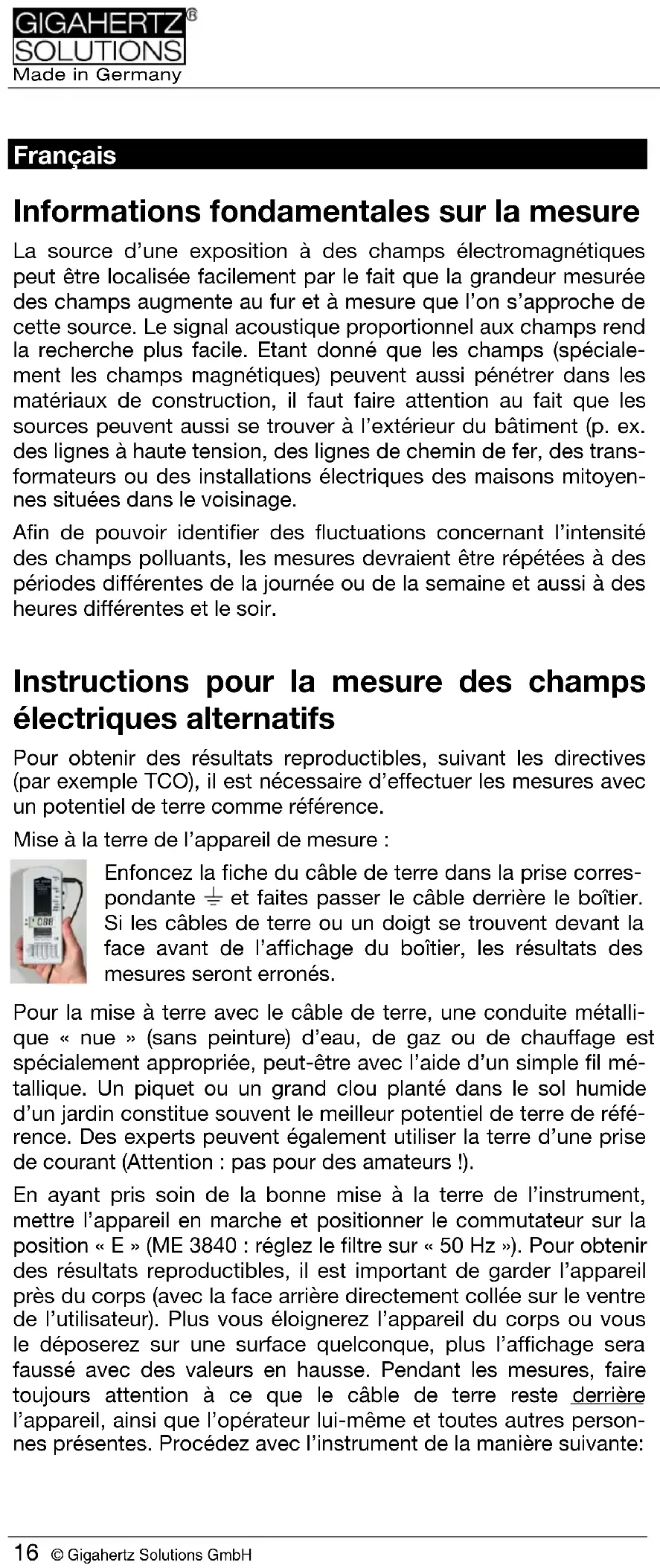 Batteria, Auto-Power-Off, Low batt. Lo strumento funziona con batterie a blocco da 9 V. Lo scompar- to batterie si trova in basso sul lato posteriore dello strumento. Lo strumento si spegne automaticamente dopo essere rimasto acceso per ca. 40 minuti per limitare il consumo della batteria. Se al centro del display compare il segnale verticale ‘‘Low Batt’’ tra i numeri, lo strumento si spegne automaticamente dopo 3 mi- nuti. Non è più possibile eseguire misurazioni attendibili.Made in Germany © Gigahertz Solutions GmbH 15 Cosa fare per ridurre l’esposizione Se possibile: aumentare la distanza dalla sorgente del campo! ‘‘Inserire nelle prese con le fasi giuste’’ Mettere lo strumento in posizione "E" e posizionarlo per esempio tra la lampada da letto e il cuscino. Spegnere la luce. Ricordarsi il valore indicato sul display. Estrarre la presa della lampada dalla spina, ruotarla di 180° e reinserirla. Logico: la presa va inserita nella posizione in cui il campo è minore. Questo trucco funziona al meglio se la lampada è dotata di disgiuntore di linea. Usare multiprese schermate con interruttore bipolare e linee di connessione schermate (si veda al nostro sito Internet!). Installazione di un disgiuntore di rete: Il disgiuntore di rete va inserito nella scatola dei fusibili e serve a staccare automaticamente il circuito elettrico dalla rete non appe- na viene spento l’ultimo apparecchio utilizzatore. Il circuito elettri- co così disgiunto dalla rete non è più in tensione e non può quindi più creare campi elettrici. Questa è spesso la misura che offre il miglior rapporto qualità-prezzo e per questo è spesso la prima misura adottata dagli esperti in bioedilizia nell’ambito del risana- mento di un oggetto --- e proprio gli innovativi disgiuntori di rete di Gigahertz Solutions sono nelle liste dei prodotti raccomandati da molti (si veda anche: www.gigahertz-solutions.de). Potete vedere da soli (meglio se in due) se un disgiuntore di rete è l’investimento migliore per la vostra situazione: Uno dei due legge lo strumento di misurazione posto in corri- spondenza della testiera del letto (strumento sulla posizione ‘‘E’’) L’altro accende i fusibili rilevanti ovvero spegne i circuiti elettrici nelle vicinanze. Nei circuiti elettrici che mostrano una riduzione dell’esposizione è consigliabile installare un disgiuntore di rete. Per ulteriori informazioni, letteratura e indirizzi di esperti di bioedilizia, consultare il nostro sito Internet www.gigahertz- solutions.deMade in Germany 16 © Gigahertz Solutions GmbH Français Informations fondamentales sur la mesure La source d’une exposition à des champs électromagnétiques peut être localisée facilement par le fait que la grandeur mesurée des champs augmente au fur et à mesure que l’on s’approche de cette source. Le signal acoustique proportionnel aux champs rend la recherche plus facile. Etant donné que les champs (spéciale- ment les champs magnétiques) peuvent aussi pénétrer dans les matériaux de construction, il faut faire attention au fait que les sources peuvent aussi se trouver à l’extérieur du bâtiment (p. ex. des lignes à haute tension, des lignes de chemin de fer, des trans- formateurs ou des installations électriques des maisons mitoyen- nes situées dans le voisinage. Afin de pouvoir identifier des fluctuations concernant l’intensité des champs polluants, les mesures devraient être répétées à des périodes différentes de la journée ou de la semaine et aussi à des heures différentes et le soir. Instructions pour la mesure des champs électriques alternatifs Pour obtenir des résultats reproductibles, suivant les directives (par exemple TCO), il est nécessaire d’effectuer les mesures avec un potentiel de terre comme référence. Mise à la terre de l’appareil de mesure : Enfoncez la fiche du câble de terre dans la prise corres- pondante et faites passer le câble derrière le boîtier. Si les câbles de terre ou un doigt se trouvent devant la face avant de l’affichage du boîtier, les résultats des mesures seront erronés. Pour la mise à terre avec le câble de terre, une conduite métalli- que « nue » (sans peinture) d’eau, de gaz ou de chauffage est spécialement appropriée, peut-être avec l’aide d’un simple fil mé- tallique. Un piquet ou un grand clou planté dans le sol humide d’un jardin constitue souvent le meilleur potentiel de terre de réfé- rence. Des experts peuvent également utiliser la terre d’une prise de courant (Attention : pas pour des amateurs !). En ayant pris soin de la bonne mise à la terre de l’instrument, mettre l’appareil en marche et positionner le commutateur sur la position « E » (ME 3840 : réglez le filtre sur « 50 Hz »). Pour obtenir des résultats reproductibles, il est important de garder l’appareil près du corps (avec la face arrière directement collée sur le ventre de l’utilisateur). Plus vous éloignerez l’appareil du corps ou vous le déposerez sur une surface quelconque, plus l’affichage sera faussé avec des valeurs en hausse. Pendant les mesures, faire toujours attention à ce que le câble de terre reste derrière l’appareil, ainsi que l’opérateur lui-même et toutes autres person- nes présentes. Procédez avec l’instrument de la manière suivante:Made in Germany © Gigahertz Solutions GmbH 17 - Traverser lentement la pièce, s’arrêter de temps en temps, et mesurer l’intensité de champ en pivotant l’appareil tout autour, vers le haut et vers le bas. - Continuer les mesures dans la direction de l’intensité la plus élevée pour identifier la source la plus intense. - Pour le lit ou la station de travail, effectuez les mesures très soigneusement et dans toutes directions, car en géné- ral les valeurs-ci sont les plus importantes en terme d’exposition. - Pour l’examen, il faudra procéder selon les conditions les plus proches de la réalité quotidienne, 