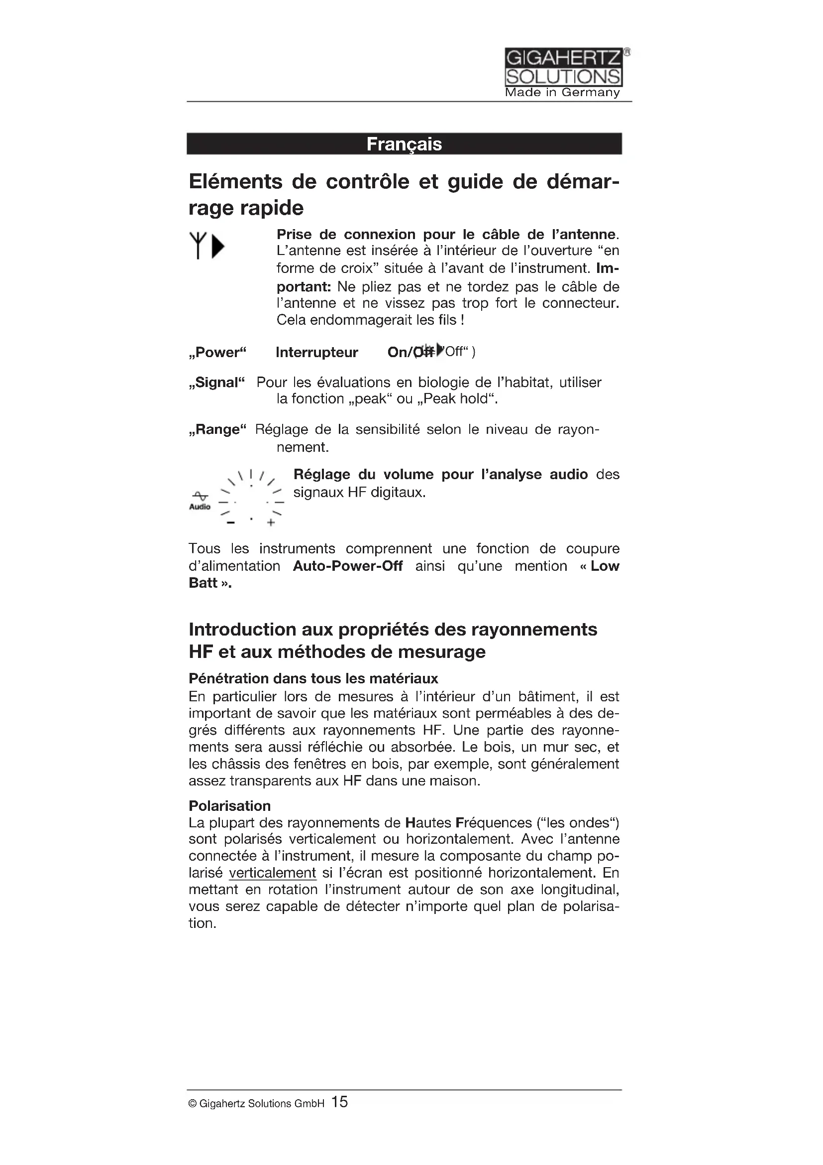 Français Eléments de contrôle et guide de démar- rage rapide Prise de connexion pour le câble de l’antenne. L’antenne est insérée à l’intérieur de l’ouverture “en forme de croix” située à l’avant de l’instrument. Im- portant: Ne pliez pas et ne tordez pas le câble de l’antenne et ne vissez pas trop fort le connecteur. Cela endommagerait les fils ! „Power“ Interrupteur On/Off ( = ”Off“ ) „Signal“ Pour les évaluations en biologie de l’habitat, utiliser la fonction „peak“ ou „Peak hold“. „Range“ Réglage de la sensibilité selon le niveau de rayon- nement. Réglage du volume pour l’analyse audio des signaux HF digitaux. Tous les instruments comprennent une fonction de coupure d’alimentation Auto-Power-Off ainsi qu’une mention « Low Batt ». Introduction aux propriétés des rayonnements HF et aux méthodes de mesurage Pénétration dans tous les matériaux En particulier lors de mesures à l’intérieur d’un bâtiment, il est important de savoir que les matériaux sont perméables à des de- grés différents aux rayonnements HF. Une partie des rayonne- ments sera aussi réfléchie ou absorbée. Le bois, un mur sec, et les châssis des fenêtres en bois, par exemple, sont généralement assez transparents aux HF dans une maison. Polarisation La plupart des rayonnements de Hautes Fréquences (“les ondes“) sont polarisés verticalement ou horizontalement. Avec l’antenne connectée à l’instrument, il mesure la composante du champ po- larisé verticalement si l’écran est positionné horizontalement. En mettant en rotation l’instrument autour de son axe longitudinal, vous serez capable de détecter n’importe quel plan de polarisa- tion.Made in Germany