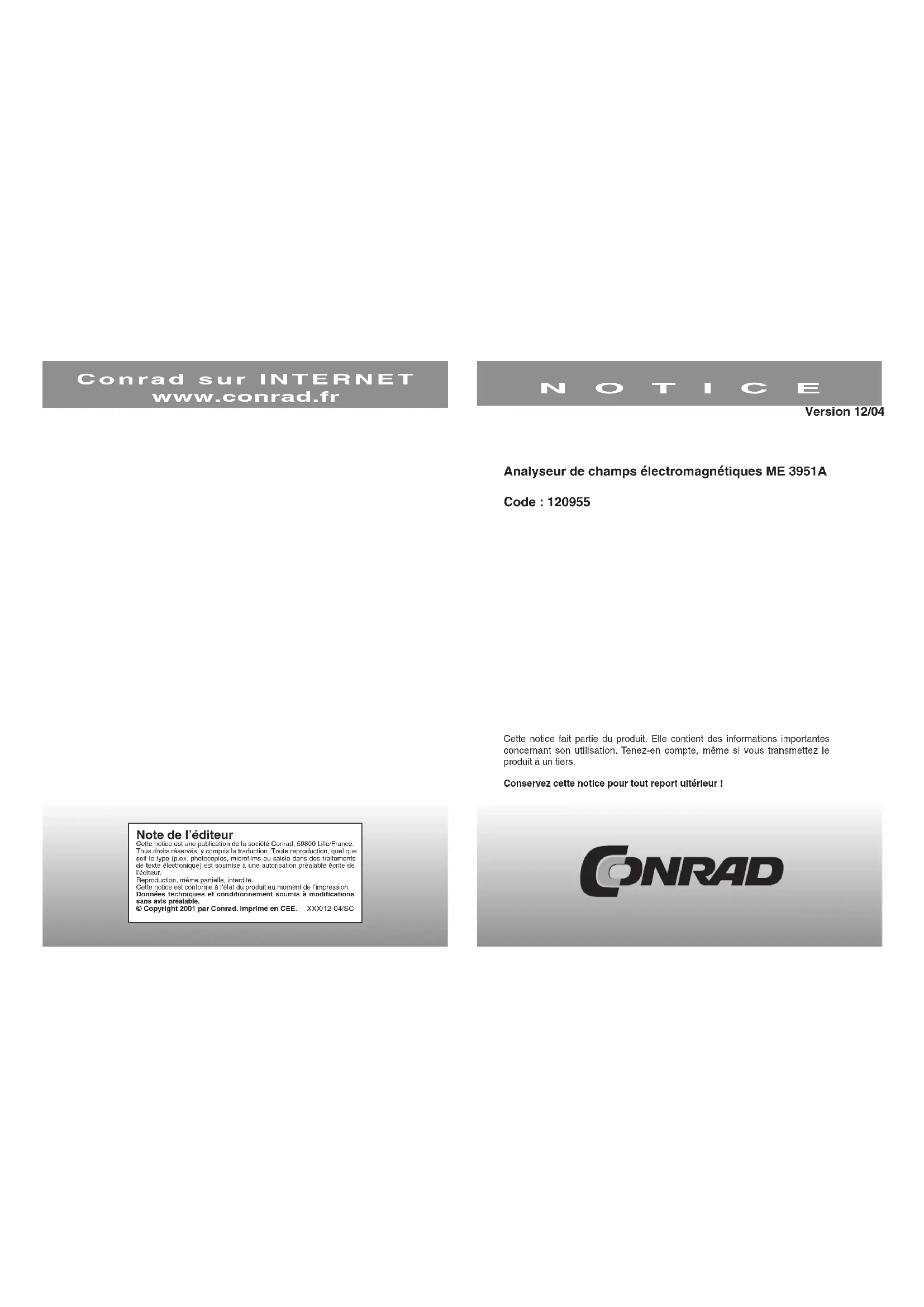 Note de l’éditeur Cette notice est une publication de la société Conrad, 59800 Lille/France.Tous droits réservés, y compris la traduction. Toute reproduction, quel quesoit le type (p.ex. photocopies, microfilms ou saisie dans des traitementsde texte électronique) est soumise à une autorisation préalable écrite del’éditeur.Reproduction, même partielle, interdite.Cette notice est conforme à l’état du produit au moment de l’impression. Données techniques et conditionnement soumis à modifications sans avis préalable. © Copyright 2001 par Conrad. Imprimé en CEE. XXX/12-04/SC Analyseur de champs électromagnétiques ME 3951A Code : 120955 Cette notice fait partie du produit. Elle contient des informations importantes concernant son utilisation. Tenez-en compte, même si vous transmettez le produit à un tiers. Conservez cette notice pour tout report ultérieur ! NOTICE Conrad sur INTERNET www.conrad.fr Version 12/04Référence technique - Fonctions - Utilisation et Entretien - Instructions relatives à la réalisation de mesures - Théorie des champs Lisez attentivement ce mode d’emploi avant la première mise en service. Il donne des indications importantes pour la sécurité, l’utilisation et l’entretien de cet appareil. Les analyseurs de champs électromagnétiques de la série ME 3 de GIGAHERTZ SOLUTIONS