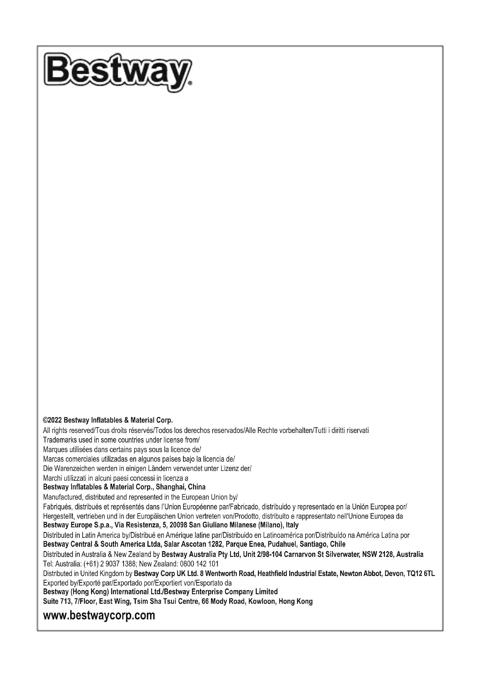 Attention: Les enfants doivent rester constamment sous la supervision d’un adulte quand ils utilisent ce produit. REMARQUE: Cet équipement vous permet de voir sous l’eau et de respirer à la surface sans avoir besoin de sortir le visage de l’eau. Utilisez-le correctement pour des performances optimales. REMARQUE: Garder bien à l'esprit la distance que vous avez parcourue à la nage, car le retour peut être épuisant. REMARQUE: Si vous voulez vous aventurer à plus de 3 mètres de profondeur (3-10 pieds) cherchez conseil auprès d'un instructeur qualifié (i.e. un membre de l’Association Nationale des Moniteurs de Plongée) ou auprès d’une des branches du Club Britannique de Plongée) ou de toute autre organisation similaire. REMARQUE: ATTENTION car au fur et à mesure que vous descendez, votre flottabilité naturelle diminue, ce qui signifie que vous êtes susceptible de devoir nager pour pouvoir flotter de nouveau à la surface. Le masque (si inclu) Assurez-vous que le masque est propre. Tournez la tête à 45°. Vérifiez que la lanière se trouve en face du verre avant de placer le masque sur votre visage. Retenez votre respiration et expulsez l’air présent dans le masque, en vous assurant que le masque colle bien à votre visage. Tournez la tête vers le bas et secouez la tête de l’arrière vers l’avant afin de vous assurer que le masque est bien en place. Mettez le masque au-dessus de vos yeux et de votre nez (jamais sur la bouche) et réglez la sangle pour que la jupe s’adapte confortablement à votre visage. Attention: Ne plongez jamais dans l’eau avec votre masque ! Un impact brusque pourrait endommager le masque ou casser les verres, ainsi que provoquer des blessures. Évitez les impacts violents sur les verres du masque et ne plongez jamais dans l’eau le visage en avant. REMARQUE: Pour éviter que la visière ne se recouvre de buée, passer de la salive à l’intérieur puis rincer avec à l’eau ou, pour de meilleurs résultats, laisser une petite quantité d’eau dans le masque et utiliser la pour laver le tour de la visière en secouant la tête lorsque le masque est embué. REMARQUE: Souffler un peu par le nez si vous sentez que le masque s’applatit contre votre visage à cause de la pression de l’eau. Le tuba (si inclu) ATTENTION: Les tubas de classe A ne doivent pas être utilisés par des personnes ≤ 150 cm. Utilisation uniquement par un adulte. N’utilisez le tuba que dans l’eau. ATTENTION : les tubas de classe B ne doivent pas être utilisés par des personnes > 150 cm. Utilisation uniquement par un enfant. N’utilisez le tuba que dans l’eau. Le tuba est utilisé par le plongeur ou par le nageur pour respirer quand le visage est immergé. La taille du tuba dépend de la capacité pulmonaire de l’usager. Avant d’entrer dans l’eau, assurez-vous que le tube est correctement placé dans l’embout et que le tuba est bien fixé à la sangle du masque par le support. REMARQUE: Notez que l’embout est conçu pour être positionné entre les lèvres et les dents. REMARQUE: Entraînez-vous là où vous avez pied. De temps en temps ou en plongeant, l’eau entrera dans votre tuba. C’est normal, il faut seulement s’entraîner à la faire ressortir en soufflant d’un coup sec. REMARQUE: N’EFFECTUEZ PAS PLUS de 3 respirations profondes avant de descendre sous la surface de l’eau. Une respiration excessive pourrait vous amener à perdre connaissance sous l’eau. REMARQUE: Si le tuba est équipé d'une soupape, celle-ci a peu d'utilité sauf pour la personne qui souhaite rester à la surface. Après un peu de pratique, vous pouvez souhaiter utiliser le tuba pour respirer entre les excursions sous la surface de l’eau. Vous vous apercevrez que c’est à la fois plus sûr et plus simple d’éliminer la soupape et d’expulser l’eau qui a pénétré dans le tube en la rejetant rapidement et brusquement quand vous atteignez la surface de l'eau. Attention: l’AJOUT de tout objet étranger sur ce produit (par exemple, pour prolonger sa longueur) peut mettre votre vie en danger. Ne l’utilisez que sous une surveillance expérimentée. Le haut coloré du tube rend le plongeur plus visible quand il revient à la surface, il doit donc être remplacé en cas de perte ou de décoloration. La surface extérieure des 30 mm supérieurs du tube sera marquée en rouge, jaune ou rose fluorescent. Entretien et rangement Évitez de les exposer inutilement en plein soleil et à l’air. Évitez tout contact avec des huiles et des graisses. Certaines crèmes et lotions solaires ont une composition huileuse. Évitez l’exposition à la chaleur et le contact avec des surfaces chaudes. Rangez le produit au frais et au sec, dans l’obscurité, à l’intérieur d’une boîte ou d’un sac. Ne le tordez pas quand vous le rangez. Veuillez chercher et télécharger la déclaration de conformité du produit sur le site www.bestwaycorp.com