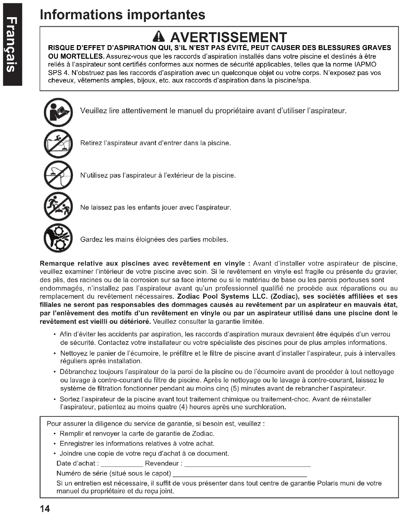 - Joindre une copie de votre reçu d’achat à ce document. Date d’achat : ___________ Revendeur : _________________________________ Numéro de série (situé sous le capot) ___________________________________ Si un entretien est nécessaire, il suffit de vous présenter dans tout centre de garantie Polaris muni de votre manuel du propriétaire et du reçu joint. Remarque relative aux piscines avec revêtement en vinyle : Avant d’installer votre aspirateur de piscine, veuillez examiner l’intérieur de votre piscine avec soin. Si le revêtement en vinyle est fragile ou présente du gravier, des plis, des racines ou de la corrosion sur sa face interne ou si le matériau de base ou les parois porteuses sont endommagés, n’installez pas l’aspirateur avant qu’un professionnel qualifié ne procède aux réparations ou au remplacement du revêtement nécessaires. Zodiac Pool Systems LLC. (Zodiac), ses sociétés affiliées et ses filiales ne seront pas responsables des dommages causés au revêtement par un aspirateur en mauvais état, par l’enlèvement des motifs d’un revêtement en vinyle ou par un aspirateur utilisé dans une piscine dont le revêtement est vieilli ou détérioré. Veuillez consulter la garantie limitée.