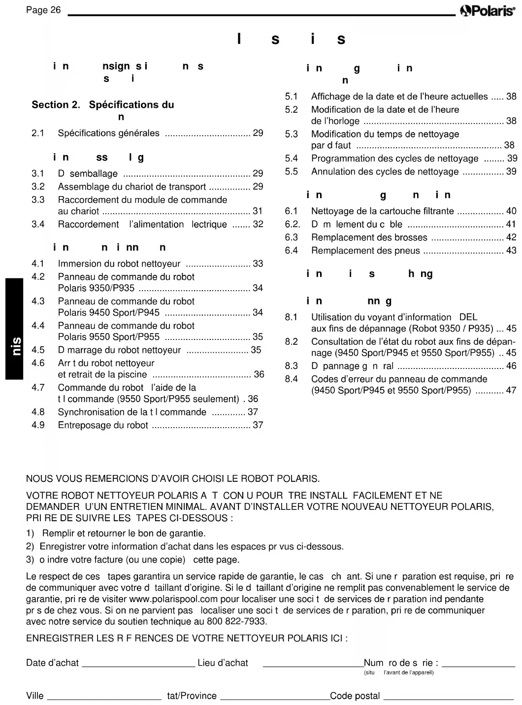 Le respect de ces é tapes garantira un service rapide de garantie, le cas é ché ant. Si une ré paration est requise, priè re de communiquer avec votre dé taillant d’origine. Si le dé taillant d’origine ne remplit pas convenablement le service de garantie, priè re de visiter www.polarispool.com pour localiser une socié té de services de ré paration indé pendante prè s de chez vous. Si on ne parvient pas à localiser une socié té de services de ré paration, priè re de communiquer avec notre service du soutien technique au 800 822-7933. ENREGISTRER LES RÉ FÉ RENCES DE VOTRE NETTOYEUR POLARIS ICI : Date d’achat Lieu d’achat Numé ro de sé rie : (situé à l’avant de l’appareil) Ville É tat/Province Code postal t a b le d e s m a t iè r e s S e c t io n 1 . C o nsigne s im p o r t a nt e s d e sé c u r it é . . . . . . . . . . . . . . . . . . . . . . . . . . . . . . . . . . . . 2 8