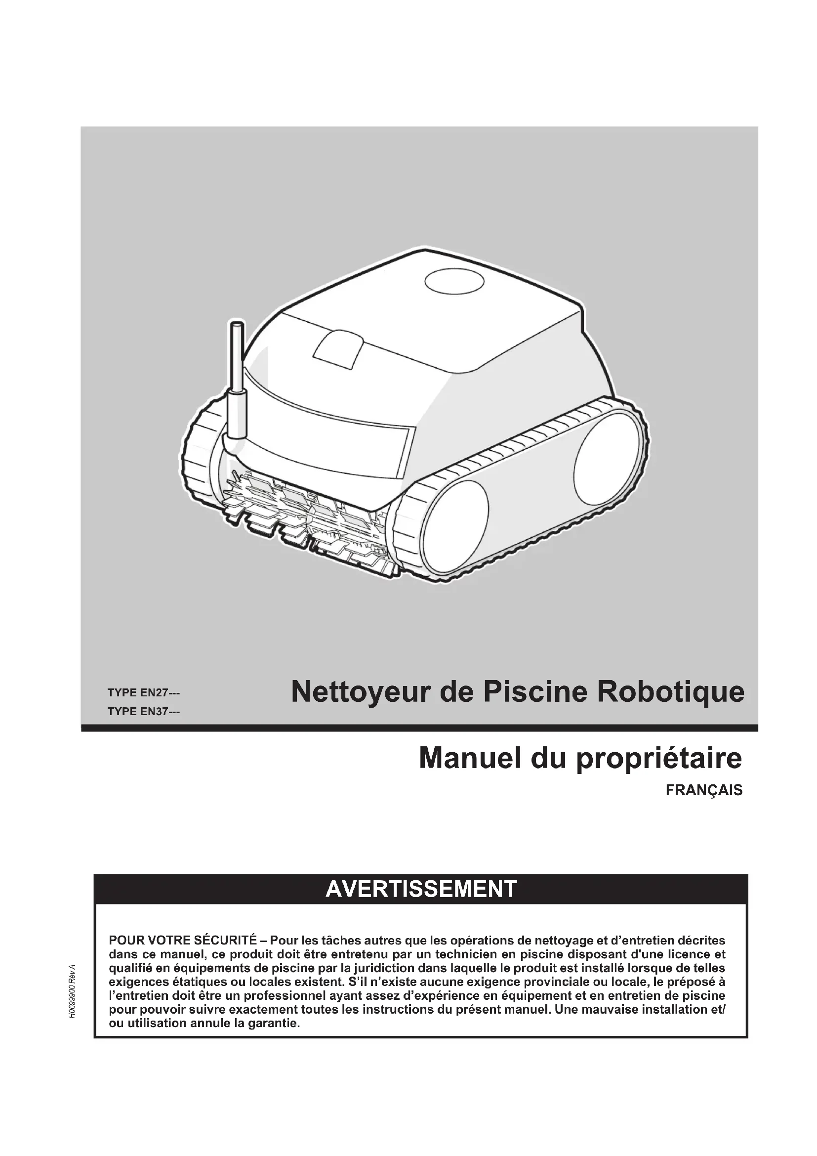 Nettoyeur de piscine robotique Manuel du propriétaireNettoyeur de piscine robotique Manuel du propriétaire Français1 Consignes de sécurité importantes Veuillez lire l'intégralité du manuel avant d'installer votre nouveau robot nettoyeur de piscine. Le nettoyeur doit être installé et utilisé comme spécié. AVERTISSEMENT Le non-respect des avertissements ci-dessous peut entraîner des dommages permanents, l’électrocution ou la mort.PRÉVENIR LES CHOCS ÉLECTRIQUESPour réduire les risques de chocs électriques :• Brancher l'unité à une prise protégée par un disjoncteur différentiel de fuite à la terre (DDFT). Une telle prise DDFT doit être fournie par un installateur qualié et doit être testée régulièrement. Pour tester le différentiel, appuyer sur le bouton de test. Le différentiel doit couper l’alimentation. Appuyer sur le bouton de remise en route. L’alimentation doit être rétablie. Si le différentiel ne fonctionne pas comme indiqué, c’est qu’il est défectueux. Si le différentiel coupe l'alimentation de la pompe sans qu'on ait appuyé sur le bouton de test, un courant à la terre circule, indiquant la possibilité d'une décharge électrique. Ne pas utiliser ce produit. Débrancher le nettoyeur et faire corriger le problème par un technicien qualié avant de l'utiliser.