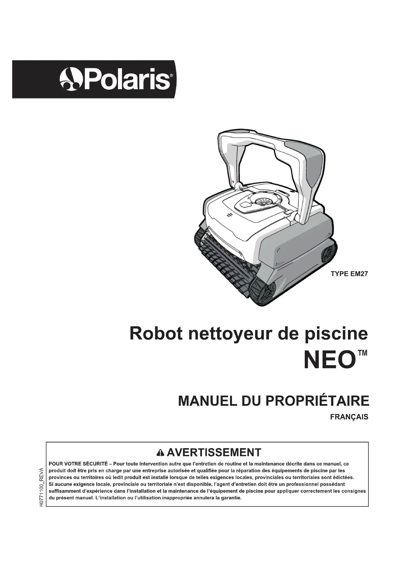 POUR VOTRE SÉCURITÉ – Pour toute intervention autre que l’entretien de routine et la maintenance décrite dans ce manuel, ce produit doit être pris en charge par une entreprise autorisée et qualifiée pour la réparation des équipements de piscine par les provinces ou territoires où ledit produit est installé lorsque de telles exigences locales, provinciales ou territoriales sont édictées. Si aucune exigence locale, provinciale ou territoriale n’est disponible, l’agent d’entretien doit être un professionnel possédant suffisamment d’expérience dans l’installation et la maintenance de l’équipement de piscine pour appliquer correctement les consignes du présent manuel. L’installation ou l’utilisation inappropriée annulera la garantie. H0771100_REVA