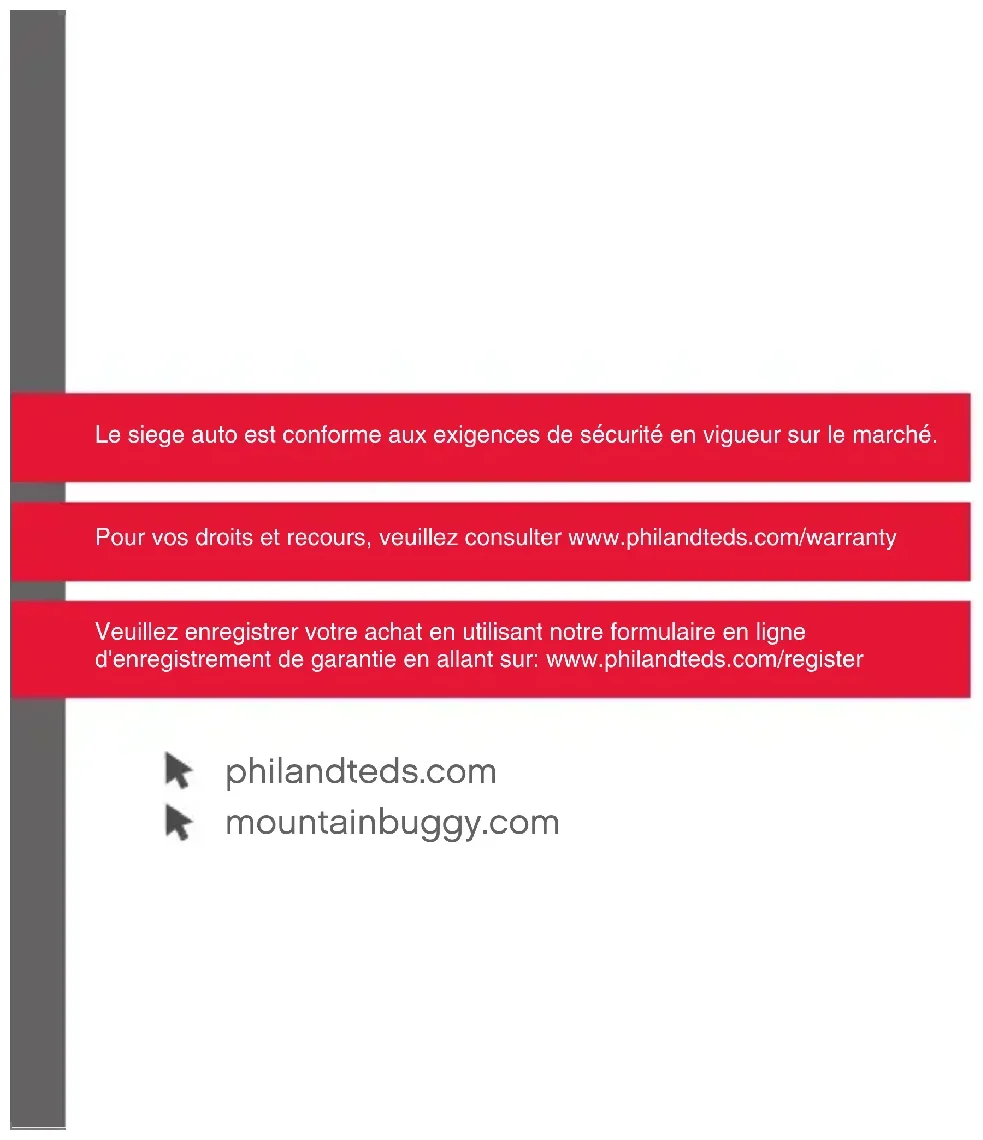 9dREMOVING THE CANOPY AND COVER 9a/9bOn the side of canopy, pull the tab and detach the canopy frame. 9c/9d Pull out the cover from shell front.FRENCH FOLLOWS Françaismountainbuggy.com Veuillez enregistrer votre achat en utilisant notre formulaire en ligne d'enregistrement de garantie en allant sur: www.philandteds.com/register Pour vos droits et recours, veuillez consulter www.philandteds.com/warranty Le siege auto est conforme aux exigences de sécurité en vigueur sur le marché. philandteds.comFélicitations pour le choix de votre nouveau siège auto! Entretien du produit Avertissement de sécurité Caractéristiques NoticeEntretien du produit IMPORTANT