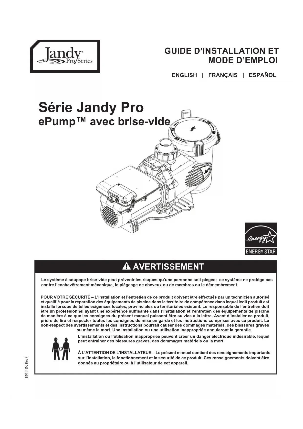 Pro avec brise-vide | Guide d’installation et mode d’emploiAVERTISSEMENT La pompe ePump de la série Jandy Pro avec brise-vide a été conçue pour être commandée par les systèmes de contrôle Jandy.Toutetentativedecommanderlapompeàl’aidedurégulateurd’unautrefabricantpourraitengendrerunepanne logicielle dans la pompe, le moteur ou d’autres composants du système. Une telle panne pourrait engendrer des blessures graves (p. ex., échec du système brise-vide, décharge électrique) ou la mort. DANGER Avis concernant les risques de piégeage : Lescouverclesdecanalisationsd’évacuationdoiventêtrecertiésparladernière édition publiée de la norme ANSI