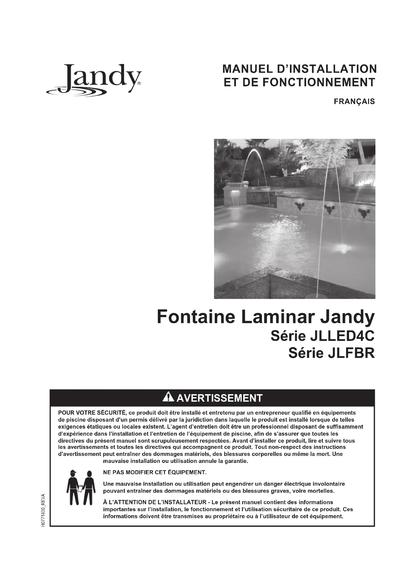 ainsi qu’aux codes et ordonnances locaux en vigueur. Au Canada, le Code canadien de l’électricité, les règlements et les ordonnances doivent être respectés. Une installation inadéquate créera des risques électriques qui pourraient entraîner la mort ou des blessures corporelles graves aux utilisateurs de la piscine ou du spa, aux installateurs ou à d’autres en raison d’une décharge électrique, en plus de causer des dommages à la propriété. Veuillez lire et suivre les instructions précises ci-dessous. AVERTISSEMENT Avant d’installer cette fontaine Laminar avec éclairage DEL, veuillez lire et suivre tous les avertissements et toutes les directives qui accompagnent ce produit. Omettre de suivre les mises en garde et les instructions pourrait entraîner des blessures corporelles graves, la mort ou des dommages à la propriété. Visitez www.jandy.com ou composez (800) 822-7933/ (888) 647-4004 (Canada) pour obtenir des exemplaires gratuits de ces directives. AVERTISSEMENT AVERTISSEMENT À L’ATTENTION DE L’INSTALLATEUR : le présent manuel contient d’importantes informations sur l’installation, le fonctionnement et l’utilisation sécuritaires de ce produit. Ces informations doivent être transmises au propriétaire ou à l’utilisateur de cet équipement.