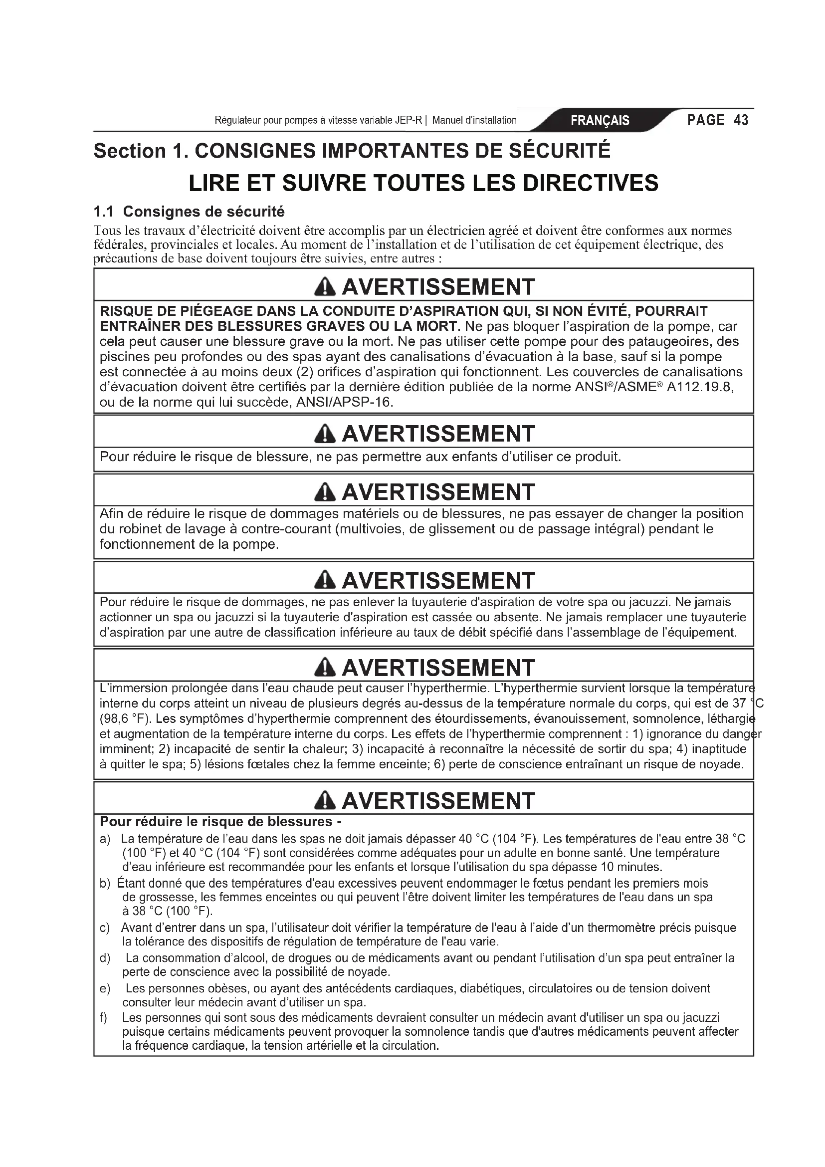 PAGE 45 FRANÇAIS Régulateur pour pompes à vitesse variable JEP-R | Manuel d’installation1.2 Normes de prévention du piégeage par aspiration de la pompe de piscine. AVERTISSEMENT DANGER D'ASPIRATION. Peut provoquer de graves blessures ou la mort. Ne pas utiliser cette pompe pour des pataugeoires ou des piscines peu profondes ou des spas ayant des canalisations d’évacuation à la base, sauf si la pompe est connectée à au moins deux (2) orifices d’aspiration qui fonctionnent. AVERTISSEMENT L’aspiration de la pompe est dangereuse et peut piéger, noyer ou éviscérer les baigneurs. Ne pas utiliser ni faire fonctionner les piscines, les spas ou les jacuzzis si un couvercle de sortie d’aspiration est absent, brisé ou instable. Lesdirectivessuivantesfournissentl’information d’installationdelapompe quipermetderéduirelepluspossiblelesrisquesdeblessuresauxutilisateursdespiscines,desspaset desjacuzzis: Protection contre le piégeage -Lesystèmed’aspirationdelapompedoitfourniruneprotectioncontre les dangers de piégeage par aspiration. Couvercles de bouches d’aspiration -Touteslesbouchesd’aspirationdoiventêtrecorrectement installées,etlescouverclesbienvissésenplace.Touslescouverclesdebouched’aspiration (canalisationd’évacuation)doiventêtreentretenusadéquatement.Ilsdoiventêtreremplacéss’ilssont fissurés,cassésouabsents.Lescouverclesdecanalisationsd’évacuationdoiventêtrelistés/certifiés parladernièreéditionpubliéed’ANSI/ASME