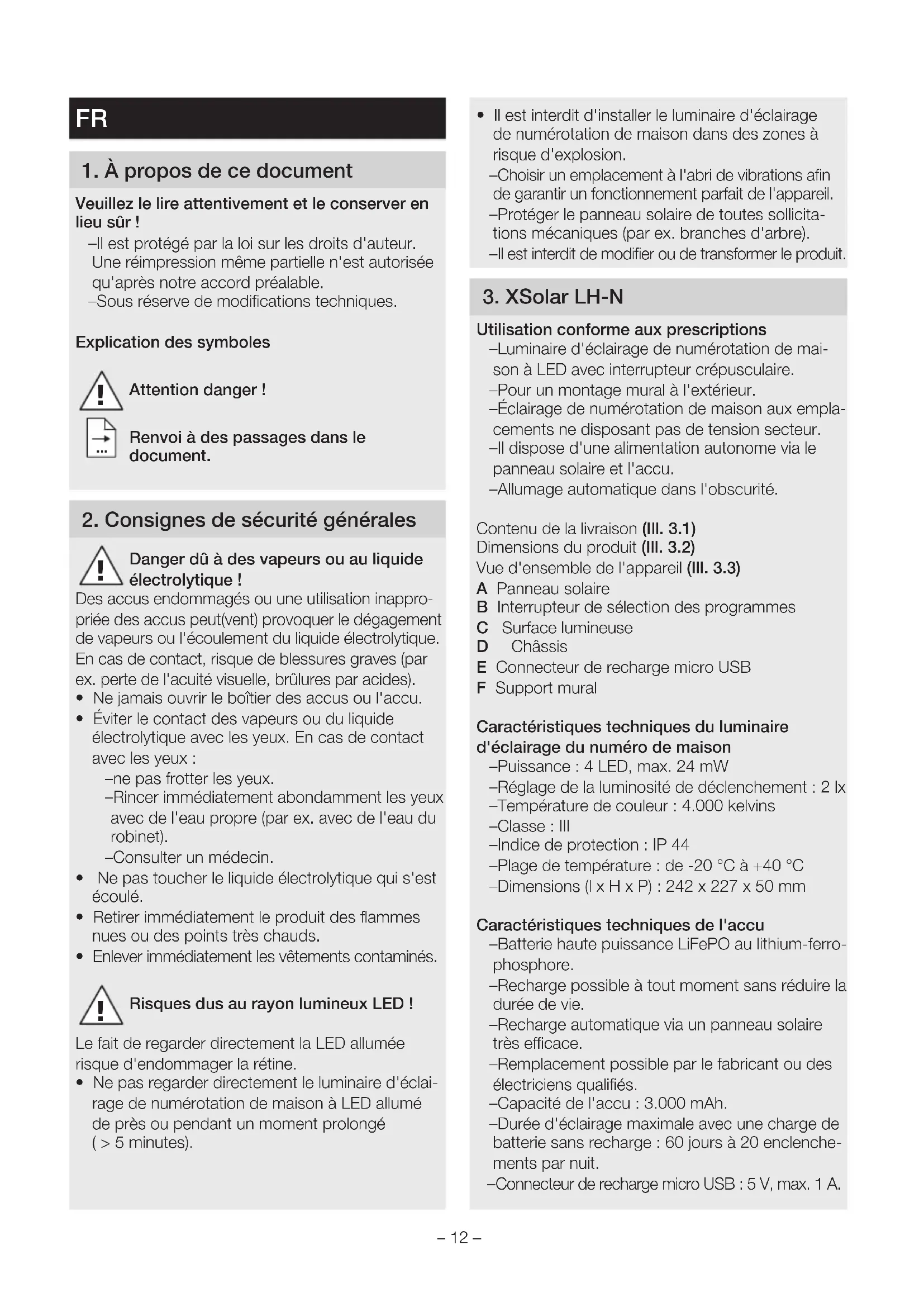 - Il est interdit d'installer le luminaire d'éclairage de numérotation de maison dans des zones à risque d'explosion. – Choisir un emplacement à l'abri de vibrations afin de garantir un fonctionnement parfait de l'appareil. – Protéger le panneau solaire de toutes sollicita- tions mécaniques (par ex. branches d'arbre). – Il est interdit de modifier ou de transformer le produit. 3 XSolar LH-N Utilisation conforme aux prescriptions – Luminaire d'éclairage de numérotation de mai- son à LED avec interrupteur crépusculaire. – Pour un montage mural à l'extérieur. – Éclairage de numérotation de maison aux empla- cements ne disposant pas de tension secteur. – Il dispose d'une alimentation autonome via le panneau solaire et l'accu. – Allumage automatique dans l'obscurité. Contenu de la livraison (Ill 31) Dimensions du produit (Ill 32) Vue d'ensemble de l'appareil (Ill 33) A Panneau solaire B Interrupteur de sélection des programmes C Surface lumineuse D Châssis E Connecteur de recharge micro USB F Support mural Caractéristiques techniques du luminaire d'éclairage du numéro de maison – Puissance : 4 LED, max. 24 mW – Réglage de la luminosité de déclenchement : 2 lx – Température de couleur : 4.000 kelvins – Classe : III – Indice de protection : IP 44 – Plage de température : de -20 °C à +40 °C – Dimensions (l x H x P) : 242 x 227 x 50 mm Caractéristiques techniques de l'accu – Batterie haute puissance LiFePO au lithium-ferro- phosphore. – Recharge possible à tout moment sans réduire la durée de vie. – Recharge automatique via un panneau solaire très ecace. – Remplacement possible par le fabricant ou des électriciens qualifiés. – Capacité de l'accu : 3.000 mAh. – Durée d'éclairage maximale avec une charge de batterie sans recharge : 60 jours à 20 enclenche- ments par nuit. – Connecteur de recharge micro USB : 5 V, max. 1 A.– 13 – Le temps de charge dépend du lieu de montage (lumière directe du soleil). Prévoyez une charge net- tement plus longue en hiver ou par temps de pluie. 4 Montage