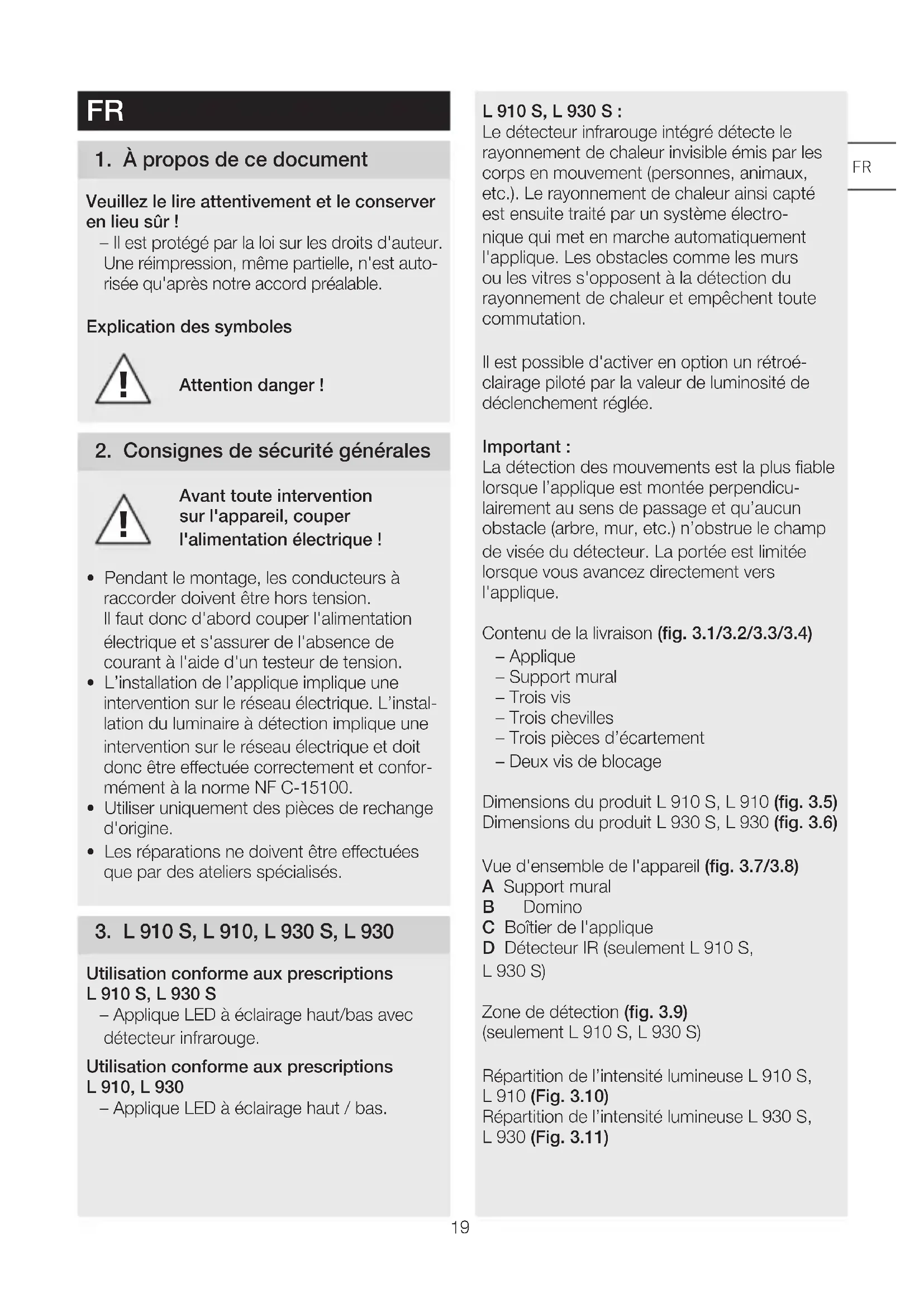 12016090°90°180° 30°30°150°150°60°120°60°120°cd / 1000 lmC0 / C180 C90 / C270 Portée du détecteur L 910 S, L 930S : 12m Angle de détection L 910 S: 180° L 930 S: 140° Temporisation L 910 S, L 930 S : 120 s - 15 min Réglage du seuil de déclen- chement L 910 S, L 930 S : 2 - 20lx Rétroéclairage L910S, L930S : en option via le commutateur DIP Source LED Indice de protection IP 44 Classe de protection L910S, L910 : II L930S, L930 : I Température ambiante de -20°C à +40°C24 Classe d'efficacité énergétique Ce produit contient une source de classe d’efficacité énergé- tique L910S, L910 : « E ». L930S, L930 : « D ». 11 Dysfonctionnements Problèmes Causes Solutions L’applique n’est pas sous tension n Fusible a sauté, appareil hors circuit, câble coupé n Court-circuit dans le câble secteur n L’interrupteur secteur éventuellement présent en position arrêt n Enclencher le fusible, le rem- placer ; mettre l’interrupteur secteur en circuit, vérifier le câble à l'aide d'un testeur de tension n Vérifier le branchement n Mettre l’interrupteur secteur en circuit L’applique ne s’allume pas n Mauvais choix du réglage du seuil de déclenchement n Interrupteur en position ARRÊT n Fusible a sauté n Régler à nouveau n Mettre en circuit n Enclencher le fusible, le rem- placer ; éventuellement vérifier le branchement L’applique ne s’éteint pas n Mouvement continu dans la zone de détection n Contrôler la zone de détection L’applique ne s’éteint pas complètement n Balisage sélectionné n Vérifier DIP 1 et DIP 2 L’applique s’allume sans mouvement décelable n L'applique est mal fixée et bouge n Un mouvement a eu lieu, l'observateur ne l'a cependant pas remarqué (mouvement derrière le mur, mouvement d'un petit objet à proximité im- médiate de l'applique, etc.) n Monter le boîtier de manière fixe n Contrôler la zone de détection25