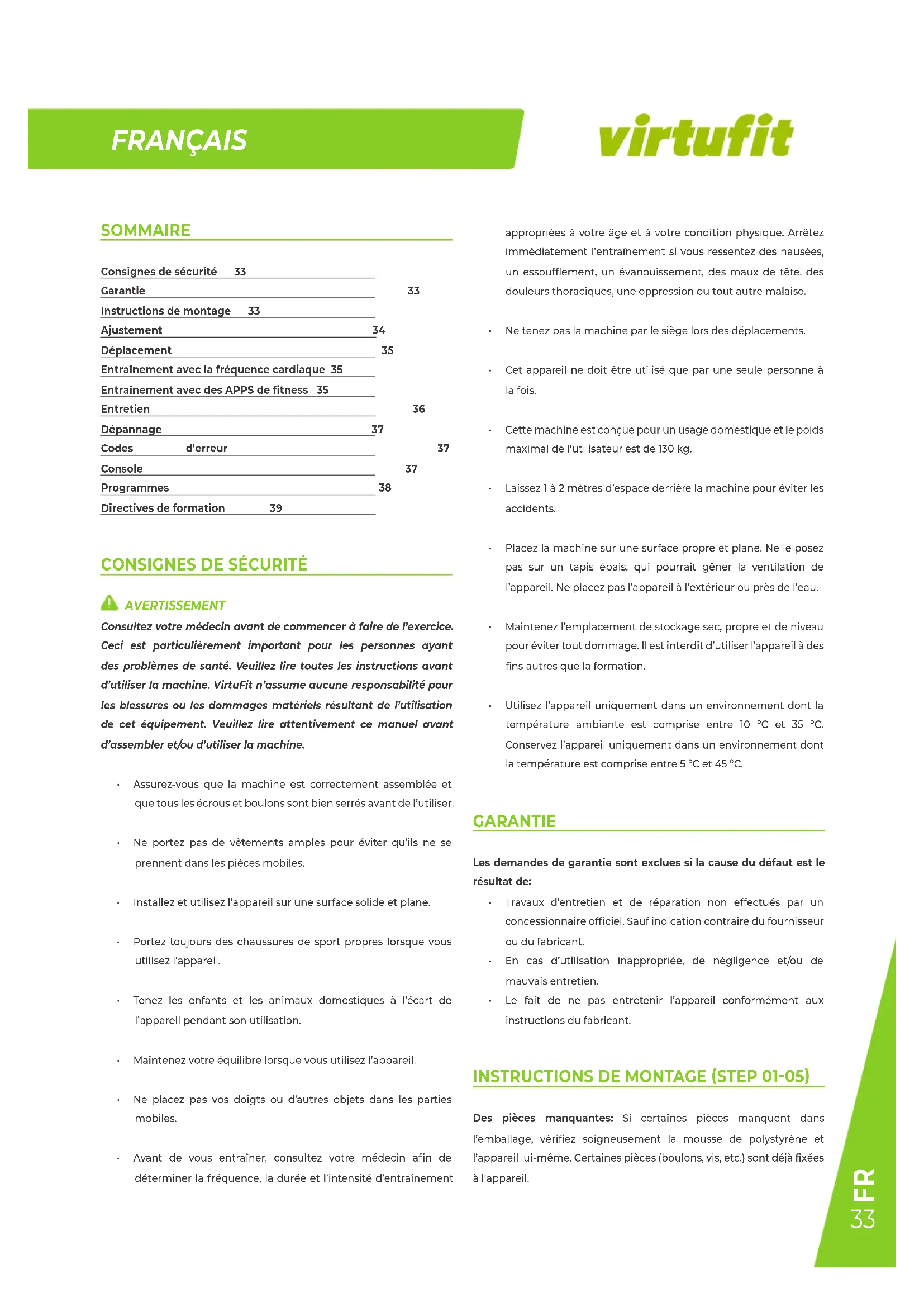 SOMMAIRE Consignes de sécurité 33 Garantie 33 Instructions de montage 33 Ajustement 34 Déplacement 35 Entraînement avec la fréquence cardiaque 35 Entraînement avec des APPS de fitness 35 Entretien 36 Dépannage 37 Codes d'erreur 37 Console 37 Programmes 38 Directives de formation 39