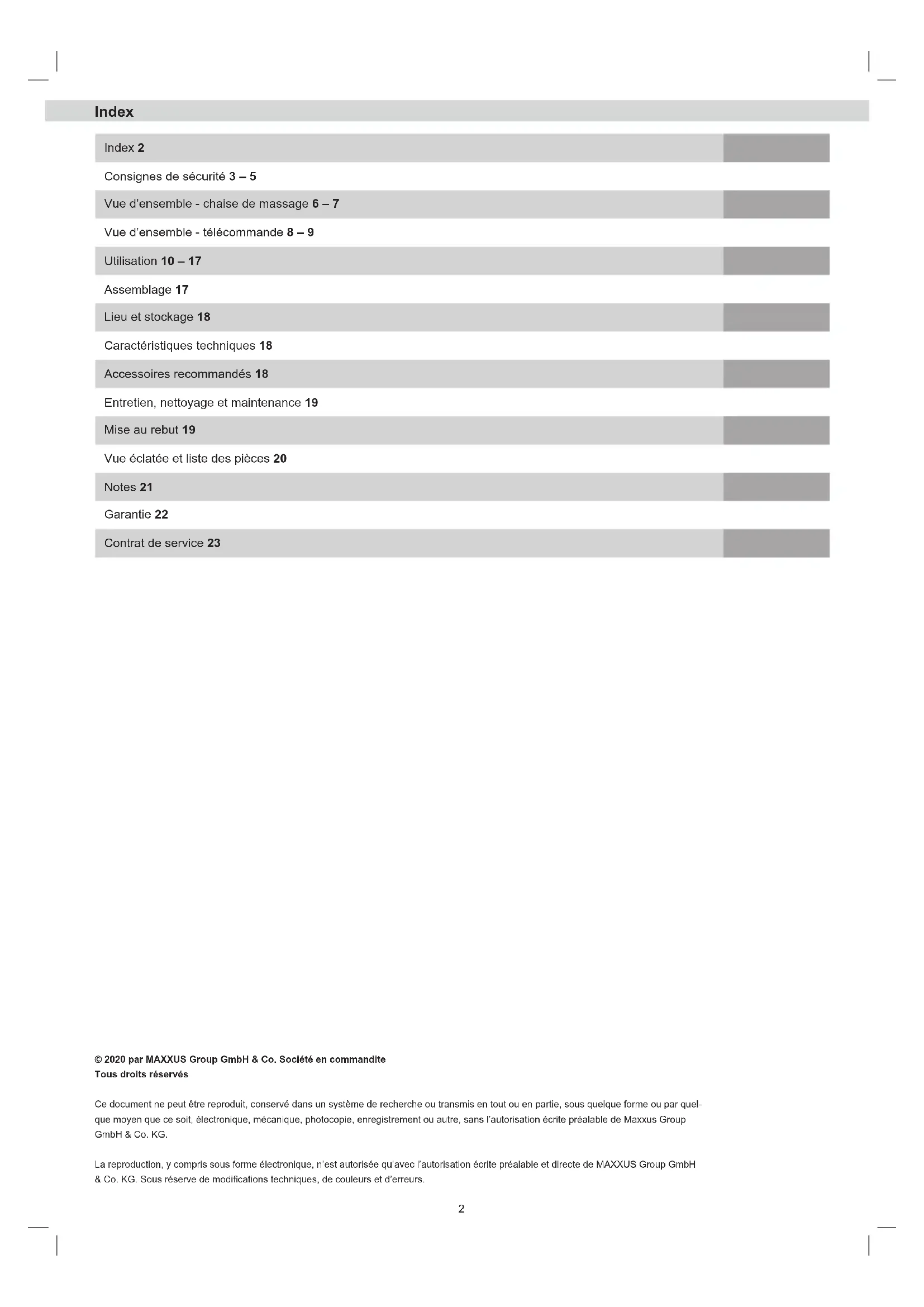 Index 2 Consignes de sécurité 3 – 5 Vue d’ensemble - chaise de massage 6 – 7 Vue d’ensemble - télécommande 8 – 9 Utilisation 10 – 17 Assemblage 17 Lieu et stockage 18 Caractéristiques techniques 18 Accessoires recommandés 18 Entretien, nettoyage et maintenance 19 Mise au rebut 19 Vue éclatée et liste des pièces 20 Notes 21 Garantie 22 Contrat de service 23 Index © 2020 par MAXXUS Group GmbH & Co. Société en commandite Tous droits réservés Ce document ne peut être reproduit, conservé dans un système de recherche ou transmis en tout ou en partie, sous quelque forme ou par quel- que moyen que ce soit, électronique, mécanique, photocopie, enregistrement ou autre, sans l’autorisation écrite préalable de Maxxus Group GmbH & Co. KG. La reproduction, y compris sous forme électronique, n’est autorisée qu’avec l’autorisation écrite préalable et directe de MAXXUS Group GmbH & Co. KG. Sous réserve de modications techniques, de couleurs et d’erreurs.3 FRA Consignes de sécurité Avant d’utiliser cette chaise de massage, assurez-vous d’avoir lu le manuel d’utilisation en entier. Une attention particulière doit être accordée aux consignes de sécurité, de maintenance et d’entretien, et d’entraînement. Assurez-vous également que toute personne utilisant l’appareil d’entraînement se soit familiarisée avec ces consignes. Il est essentiel de suivre toujours soigneusement les consignes de sécurité et de maintenance contenues dans ce manuel. Cet équipement sportif ne doit être utilisé qu’à ses ns prévues. Une utilisation de cette chaise de massage à d’autres ns que celles prévues peut entraîner un risque d’accident, une atteinte à la santé ou un endommage- ment de l’appareil, pour lesquels le fournisseur ne pourra être tenu responsable. Raccordement électrique − Une tension de secteur de 220-230V est nécessaire pour utiliser cet appareil. − La chaise de massage ne doit être branchée au secteur qu’avec les câbles électriques fournis en utilisant une prise 16A individuellement munie d’un fusible et mise à la masse, et installée par un électricien quali-