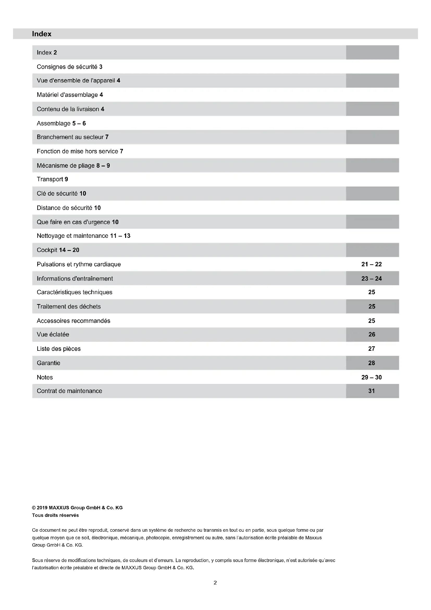 Index Index 2 Consignes de sécurité 3 Vue d'ensemble de l'appareil 4 Matériel d'assemblage 4 Contenu de la livraison 4 Assemblage 5 – 6 Branchement au secteur 7 Fonction de mise hors service 7 Mécanisme de pliage 8 – 9 Transport 9 Clé de sécurité 10 Distance de sécurité 10 Que faire en cas d'urgence 10 Nettoyage et maintenance 11 – 13 Cockpit 14 – 20 Pulsations et rythme cardiaque 21 – 22 Informations d'entraînement 23 – 24 Caractéristiques techniques 25 Traitement des déchets 25 Accessoires recommandés 25 Vue éclatée 26 Liste des pièces 27 Garantie 28 Notes 29 – 30 Contrat de maintenance 31 © 2019 MAXXUS Group GmbH & Co. KG Tous droits réservés Ce document ne peut être reproduit, conservé dans un système de recherche ou transmis en tout ou en partie, sous quelque forme ou par quelque moyen que ce soit, électronique, mécanique, photocopie, enregistrement ou autre, sans l’autorisation écrite préalable de Maxxus Group GmbH & Co. KG. Sous réserve de modications techniques, de couleurs et d’erreurs. La reproduction, y compris sous forme électronique, n’est autorisée qu’avec l’autorisation écrite préalable et directe de MAXXUS Group GmbH & Co. KG.3 FRA Consignes de sécurité Avant de commencer à vous entraîner, assurez-vous d’avoir lu le manuel d’utilisation en entier, notamment les consignes de sécurité, de maintenance et d’entretien, et d’entraînement. Assurez-vous également que toute personne utilisant l’appareil d’entraînement se soit familiarisée avec ces consignes et les applique. Suivez toujours soigneusement les consignes de maintenance et de sécu- rité de ce manuel. Cet équipement sportif ne doit être utilisé qu’à ses ns prévues. Une utilisation de cet équipement à d’autres ns que celles prévues peut entraîner un risque d’accident, une atteinte à la santé ou un endommagement de l’appareil. Le fournisseur ne pourra être tenu responsable en ce cas. Raccordement électrique : (ne s’applique qu’aux appareils possédant un raccordement électrique externe) − Une tension de secteur de 220-230V est nécessaire pour utiliser cet appareil d’entraînement. − L’appareil d’entraînement ne doit être branché au secteur qu’avec les câbles électriques fournis, en utilisant une prise 16A indivi- duellement munie d’un fusible et mise à la masse, et installée par un électricien qualié. − L’appareil d’entraînement ne peut être allumé et éteint qu’avec l’interrupteur ON/OFF. − Débranchez toujours le câble d’alimentation de la prise avant de déplacer l’appareil. − Débranchez le câble d’alimentation de la prise avant de commencer tout travail d’entretien, de maintenance ou autre. − Ne branchez pas le câble d’alimentation sur une multiprise ou un enrouleur de câble. − Si vous utilisez une rallonge, assurez-vous qu’elle soit conforme aux standards DIN, aux règlements et directives VDE, et aux règlements techniques établis par les autres Etats de l’Union Européenne. − Placez le câble de manière à ce qu’il ne puisse pas être endommagé ou causer un risque de trébuchement. − En mode de fonctionnement ou de veille, les appareils électriques, comme les téléphones portables, les PC, les télévisions (LCD, plasma, cathodiques, etc.), les consoles de jeu, etc. émettent des ondes électro-magnétiques. Pour cette raison, tous ces types d’appareil doivent être éloignés de votre appareil d’entraînement car ils pourraient entraîner un mauvais fonctionnement, des interférences ou des résultats erronés du cardio fréquencemètre. − Pour des raisons de sécurité, débranchez toujours la che électrique de la prise quand l’appareil n’est pas utilisé. Environnement d’entraînement − Choisissez un emplacement adéquat pour votre appareil sportif, orant un espace optimal et une sécurité maximale. Vous devez disposer d’un espace libre d’au moins 200 cm de long et de la largeur du tapis de course derrière. Un espace libre d’au moins 50 cm de long et de la largeur du tapis de course doit être laissé devant l’appareil. − Assurez-vous que l’endroit soit bien aéré et que l’apport en oxygène lors de l’entraînement soit susant. Evitez les courants d’air. − Votre appareil ne convient pas pour une utilisation en extérieur. Il doit être utilisé et rangé uniquement dans un environnement tempéré, sec et propre. − L’intervalle de température pour utiliser ou stocker cet appareil se situe entre un minimum de 10° et un maximum de 30° − L’appareil ne peut être utilisé ou rangé dans un endroit humide, comme une piscine, un sauna, etc. − Assurez-vous que votre appareil soit sur un sol xe, plat et propre, qu’il soit utilisé ou non. Toute inégalité du sol doit être enlevée ou compensée. − An de protéger les sols fragiles tels que le parquet, le stratié, le carrelage, etc., il est recommandé de toujours placer une pro- tection sur le sol (morceau de moquette, tapis, etc.) sous l’appareil. Assurez-vous que cette couche ne puisse pas glisser. − Ne placez pas l’appareil sur une moquette ou un tapis de couleurs claires car les pieds de celui-ci peuvent laisser des traces. − Assurez-vous que votre appareil ainsi que le câble secteur ne soient pas en contact avec des objets chauds et qu’ils soient placés à une distance sûre de toute source de chaleur, telle qu’un radiateur, un poêle, une cheminée ouverte, etc. Consignes de sécurité de la personne lors de l’entraînement − La clé de sécurité doit être insérée correctement avant de débuter chaque session d’entraînement. − Retirez le câble d’alimentation de l’appareil lorsque celui-ci n’est pas utilisé an de prévenir une utilisation inappropriée ou incon- trôlée par un tiers, par exemple un enfant. − Il est conseillé d’eectuer une visite médicale avant de commencer l’entraînement.