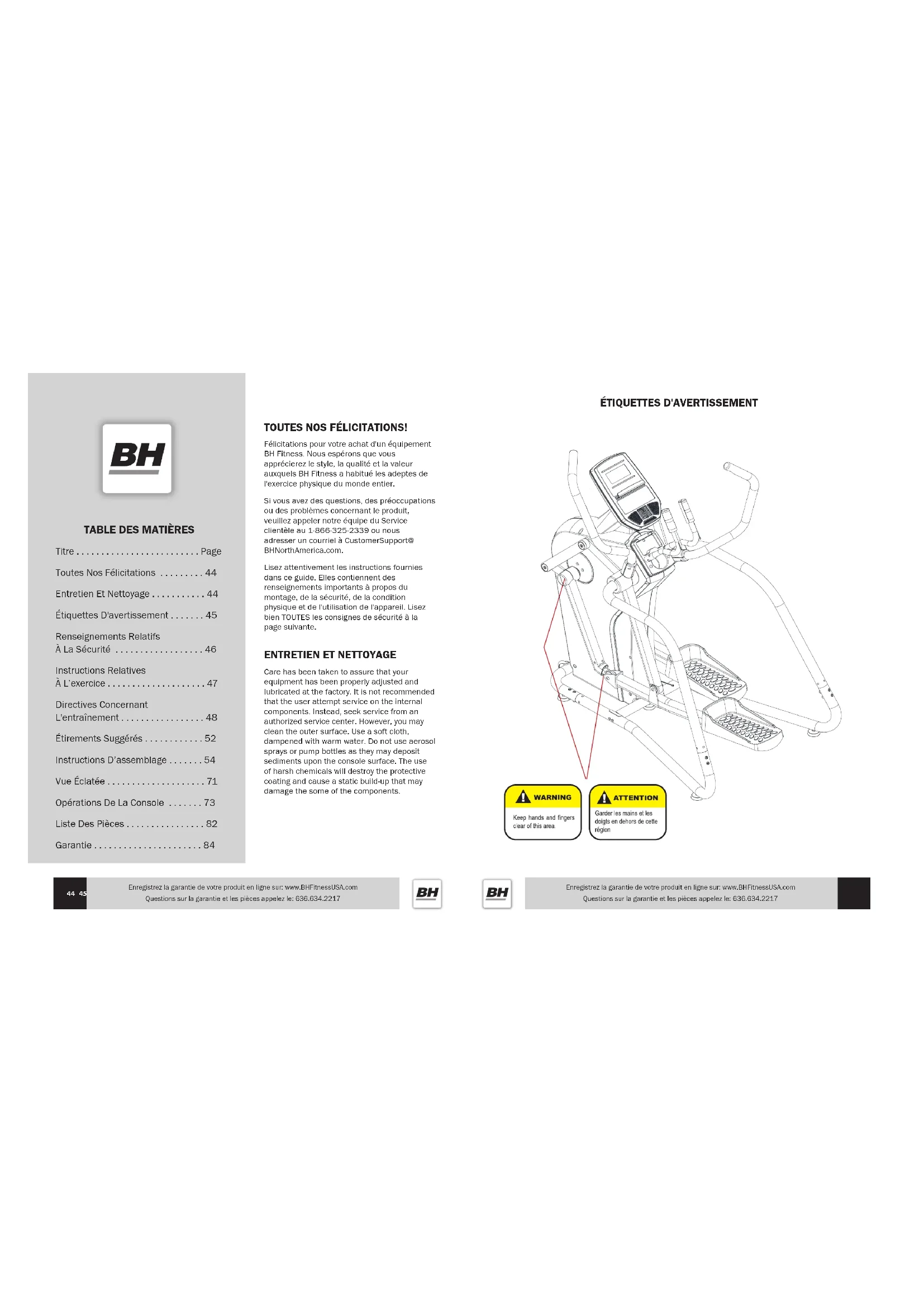 Titre . . . . . . . . . . . . . . . . . . . . . . . . . Page Toutes Nos Félicitations . . . . . . . . . 44 Entretien Et Nettoyage . . . . . . . . . . . 44 Étiquettes D'avertissement . . . . . . . 45 Renseignements Relatifs À La Sécurité . . . . . . . . . . . . . . . . . . 46 Instructions Relatives À L’exercice . . . . . . . . . . . . . . . . . . . . 47 Directives Concernant L'entraînement . . . . . . . . . . . . . . . . . 48 Étirements Suggérés . . . . . . . . . . . . 52 Instructions D’assemblage . . . . . . . 54 Vue Éclatée . . . . . . . . . . . . . . . . . . . . 71 Opérations De La Console . . . . . . . 73 Liste Des Pièces . . . . . . . . . . . . . . . . 82 Garantie . . . . . . . . . . . . . . . . . . . . . . 84 TOUTES NOS FÉLICITATIONS! Félicitations pour votre achat d'un équipement BH Fitness. Nous espérons que vous apprécierez le style, la qualité et la valeur auxquels BH Fitness a habitué les adeptes de l'exercice physique du monde entier. Si vous avez des questions, des préoccupations ou des problèmes concernant le produit, veuillez appeler notre équipe du Service clientèle au 1-866-325-2339 ou nous adresser un courriel à CustomerSupport@ BHNorthAmerica.com. Lisez attentivement les instructions fournies dans ce guide. Elles contiennent des renseignements importants à propos du montage, de la sécurité, de la condition physique et de l'utilisation de l'appareil. Lisez bien TOUTES les consignes de sécurité à la page suivante.