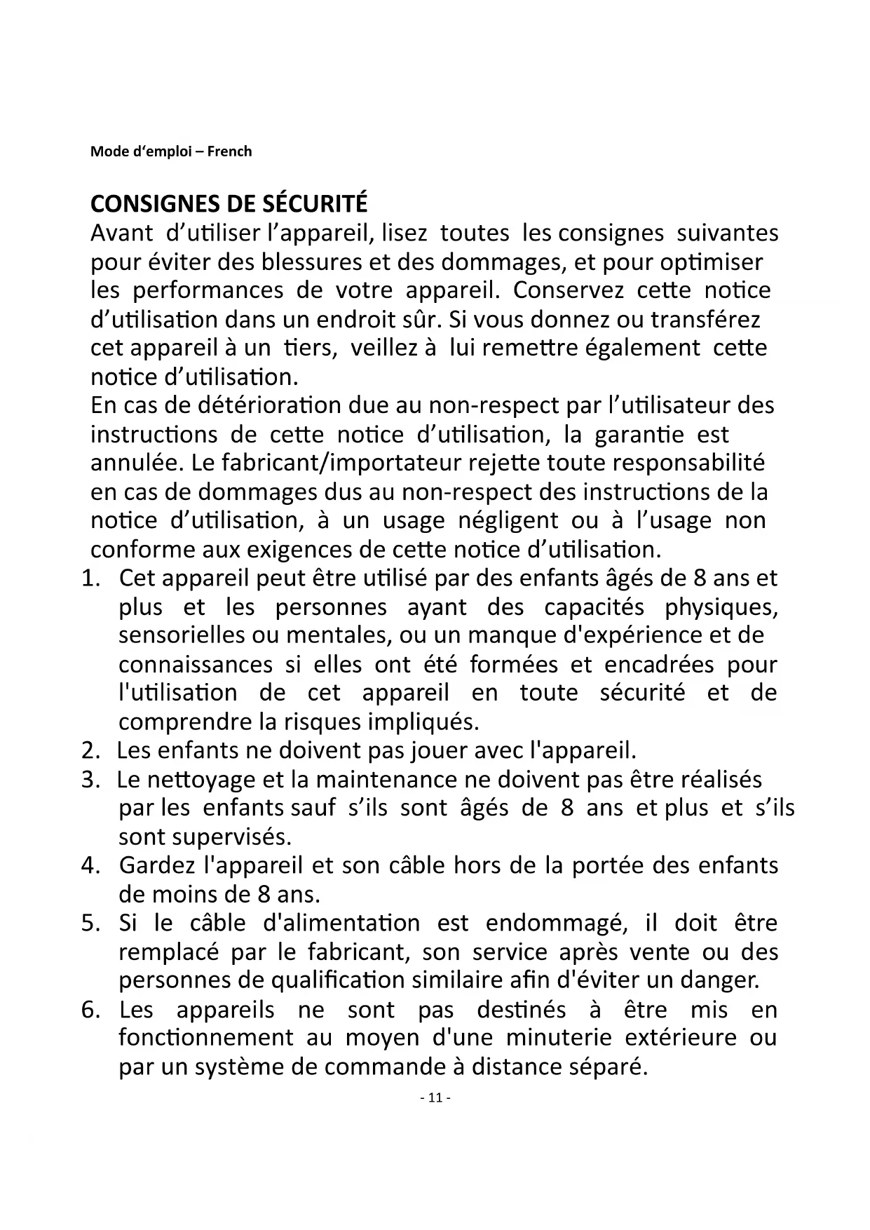 Avant d’utiliser l’appareil, lisez toutes les consignes suivantes pour éviter des blessures et des dommages, et pour optimiser les performances de votre appareil. Conservez cette notice d’utilisation dans un endroit sûr. Si vous donnez ou transférez cet appareil à un tiers, veillez à lui remettre également cette notice d’utilisation. En cas de détérioration due au non-respect par l’utilisateur des instructions de cette notice d’utilisation, la garantie est annulée. Le fabricant/importateur rejette toute responsabilité en cas de dommages dus au non-respect des instructions de la notice d’utilisation, à un usage négligent ou à l’usage non conforme aux exigences de cette notice d’utilisation.