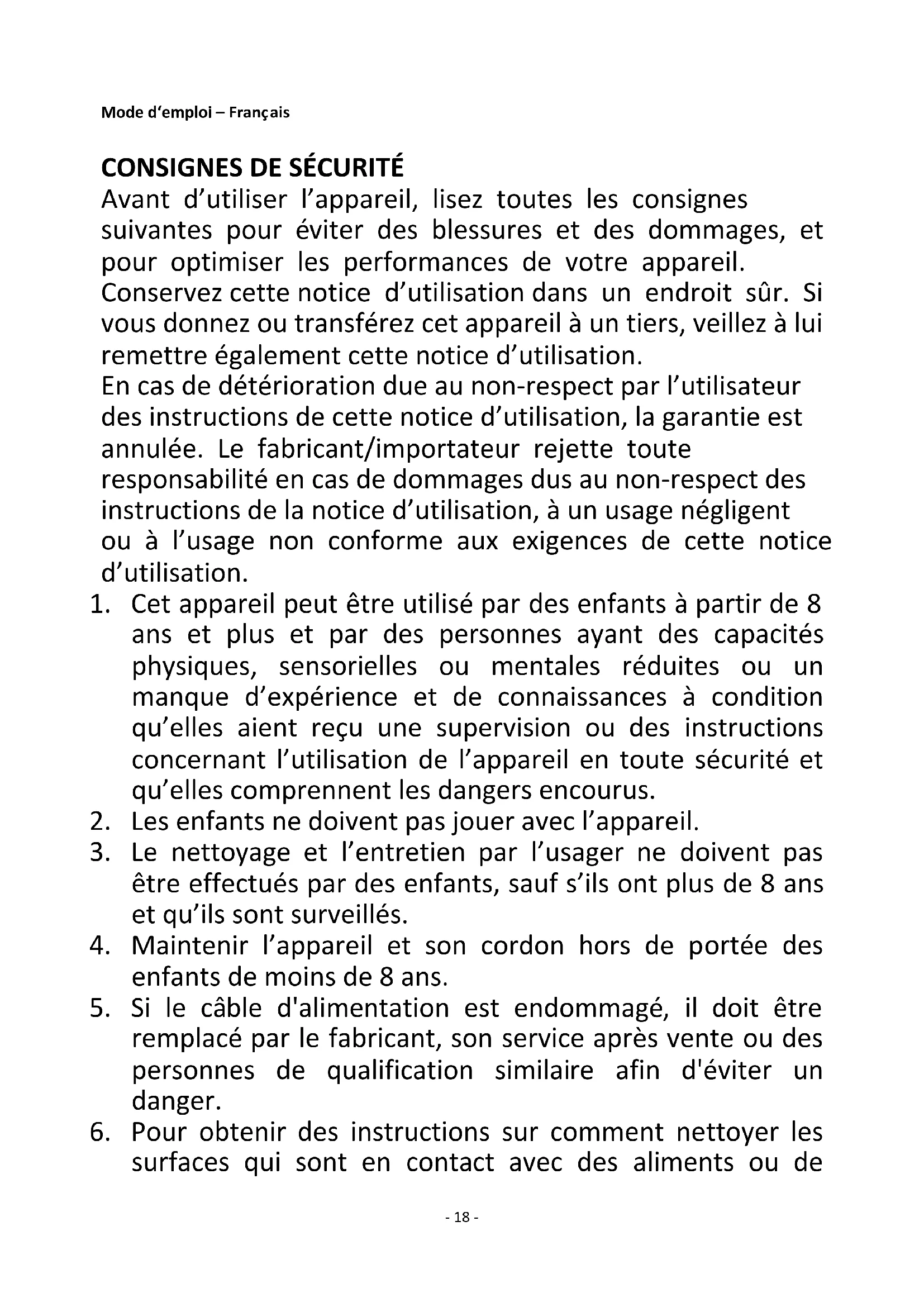 Avant d’utiliser l’appareil, lisez toutes les consignes suivantes pour éviter des blessures et des dommages, et pour optimiser les performances de votre appareil. Conservez cette notice d’utilisation dans un endroit sûr. Si vous donnez ou transférez cet appareil à un tiers, veillez à lui remettre également cette notice d’utilisation. En cas de détérioration due au non-respect par l’utilisateur des instructions de cette notice d’utilisation, la garantie est annulée. Le fabricant/importateur rejette toute responsabilité en cas de dommages dus au non-respect des instructions de la notice d’utilisation, à un usage négligent ou à l’usage non conforme aux exigences de cette notice d’utilisation.