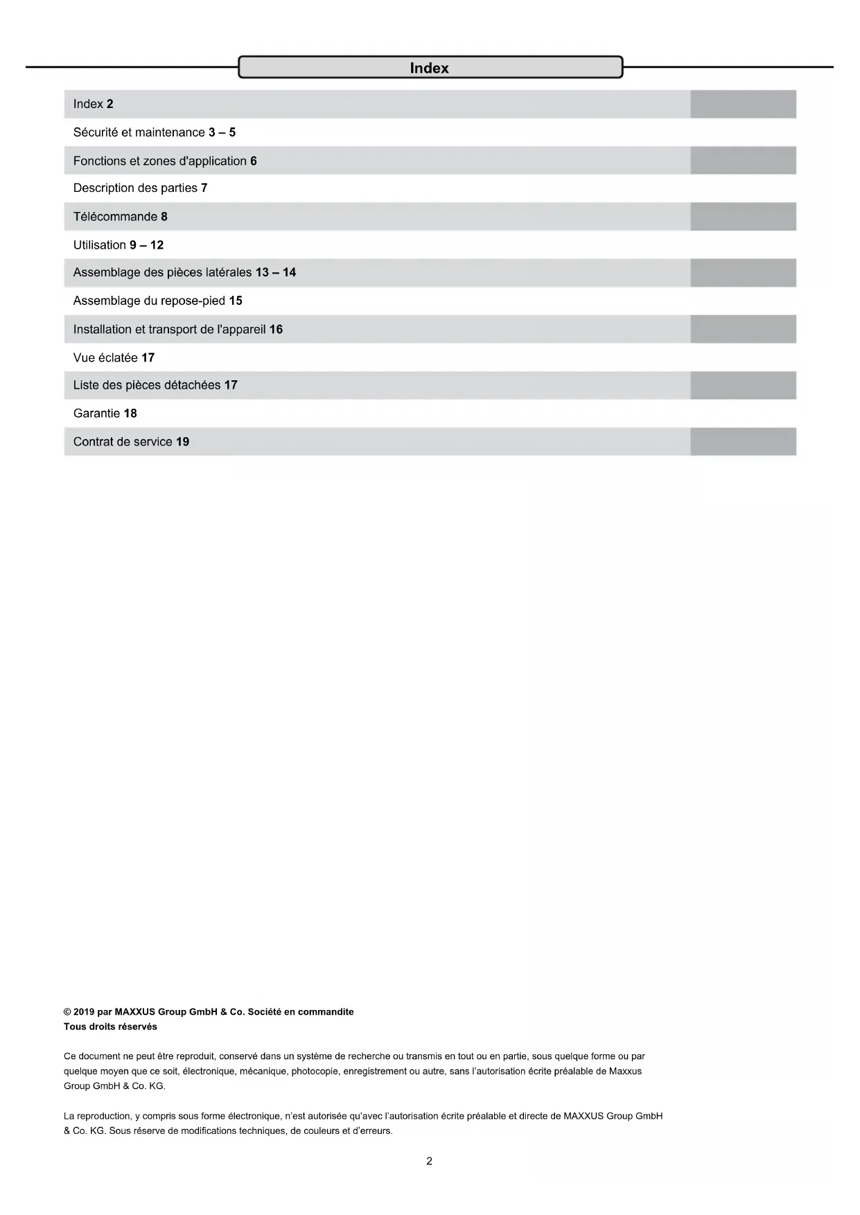 Index Index 2 Sécurité et maintenance 3 – 5 Fonctions et zones d'application 6 Description des parties 7 Télécommande 8 Utilisation 9 – 12 Assemblage des pièces latérales 13 – 14 Assemblage du repose-pied 15 Installation et transport de l'appareil 16 Vue éclatée 17 Liste des pièces détachées 17 Garantie 18 Contrat de service 19 © 2019 par MAXXUS Group GmbH & Co. Société en commandite Tous droits réservés Ce document ne peut être reproduit, conservé dans un système de recherche ou transmis en tout ou en partie, sous quelque forme ou par quelque moyen que ce soit, électronique, mécanique, photocopie, enregistrement ou autre, sans l’autorisation écrite préalable de Maxxus Group GmbH & Co. KG. La reproduction, y compris sous forme électronique, n’est autorisée qu’avec l’autorisation écrite préalable et directe de MAXXUS Group GmbH & Co. KG. Sous réserve de modications techniques, de couleurs et d’erreurs.3 FRA