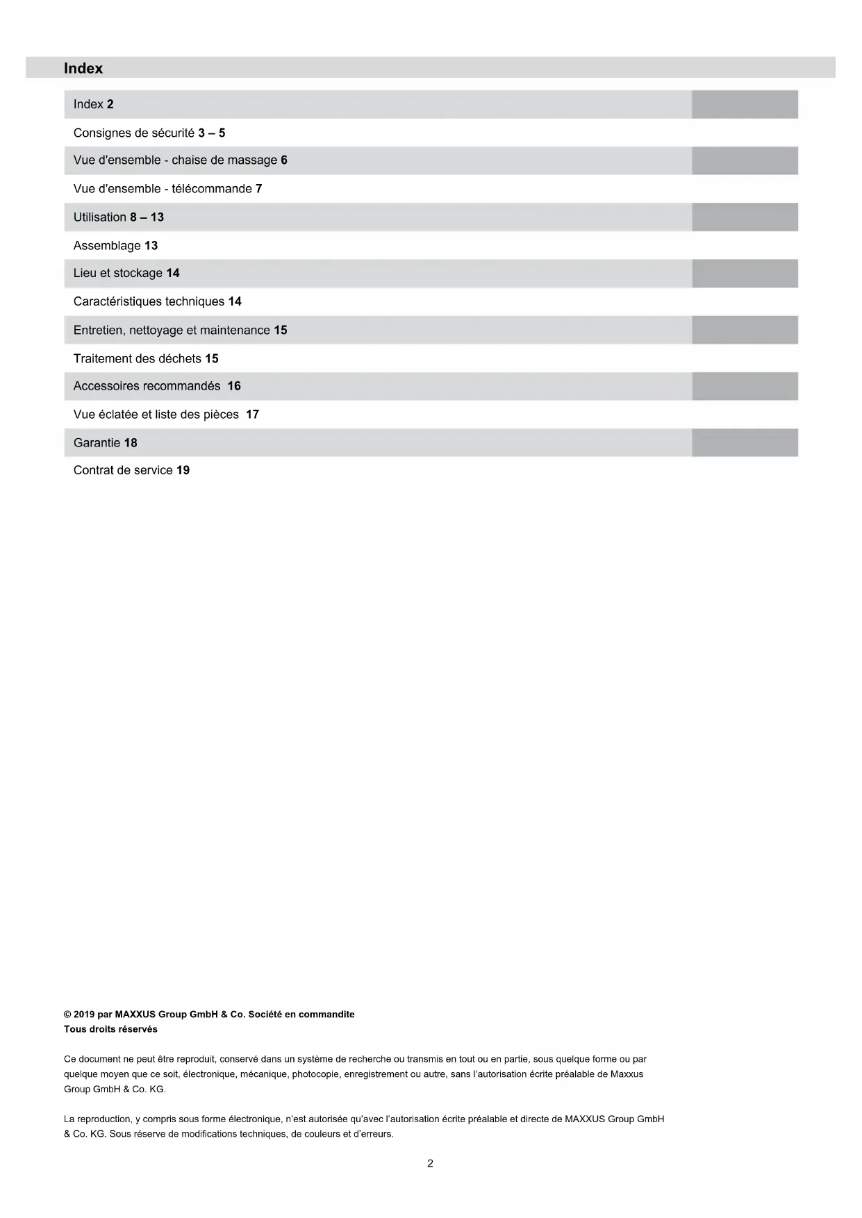 Index Index 2 Consignes de sécurité 3 – 5 Vue d'ensemble - chaise de massage 6 Vue d'ensemble - télécommande 7 Utilisation 8 – 13 Assemblage 13 Lieu et stockage 14 Caractéristiques techniques 14 Entretien, nettoyage et maintenance 15 Traitement des déchets 15 Accessoires recommandés 16 Vue éclatée et liste des pièces 17 Garantie 18 Contrat de service 19 © 2019 par MAXXUS Group GmbH & Co. Société en commandite Tous droits réservés Ce document ne peut être reproduit, conservé dans un système de recherche ou transmis en tout ou en partie, sous quelque forme ou par quelque moyen que ce soit, électronique, mécanique, photocopie, enregistrement ou autre, sans l’autorisation écrite préalable de Maxxus Group GmbH & Co. KG. La reproduction, y compris sous forme électronique, n’est autorisée qu’avec l’autorisation écrite préalable et directe de MAXXUS Group GmbH & Co. KG. Sous réserve de modications techniques, de couleurs et d’erreurs.3 FRA Consignes de sécurité Avant d’utiliser cette chaise de massage, assurez-vous d’avoir lu le manuel d’utilisation en entier. Une attention particulière doit être accordée aux consignes de sécurité, de maintenance et d’entretien, et d’entraînement. Assurez-vous également que toute personne utilisant l’appareil d’entraînement se soit familiarisée avec ces consignes. Il est essentiel de suivre toujours soigneusement les consignes de sécurité et de maintenance contenues dans ce manuel. Cet équipement sportif ne doit être utilisé qu’à ses ns prévues. Une utilisation de cette chaise de massage à d’autres ns que celles prévues peut entraîner un risque d’accident, une atteinte à la santé ou un endommage- ment de l’appareil, pour lesquels le fournisseur ne pourra être tenu responsable. Raccordement électrique − Une tension de secteur de 220-230V est nécessaire pour utiliser cet appareil. − La chaise de massage ne doit être branchée au secteur qu’avec les câbles électriques fournis en utilisant une prise 16A individuellement munie d’un fusible et mise à la masse, et installée par un électricien quali-
