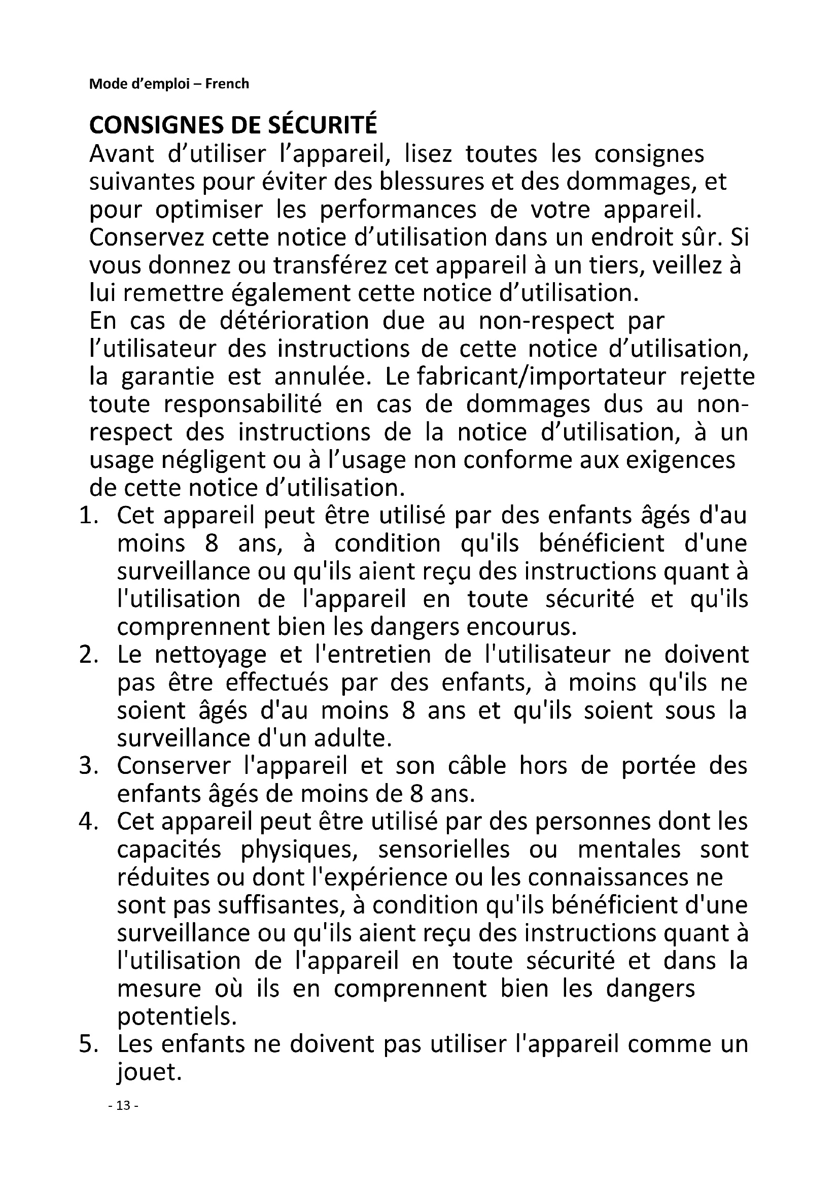 Avant d’utiliser l’appareil, lisez toutes les consignes suivantes pour éviter des blessures et des dommages, et pour optimiser les performances de votre appareil. Conservez cette notice d’utilisation dans un endroit sûr. Si vous donnez ou transférez cet appareil à un tiers, veillez à lui remettre également cette notice d’utilisation. En cas de détérioration due au non-respect par l’utilisateur des instructions de cette notice d’utilisation, la garantie est annulée. Le fabricant/importateur rejette toute responsabilité en cas de dommages dus au non- respect des instructions de la notice d’utilisation, à un usage négligent ou à l’usage non conforme aux exigences de cette notice d’utilisation.