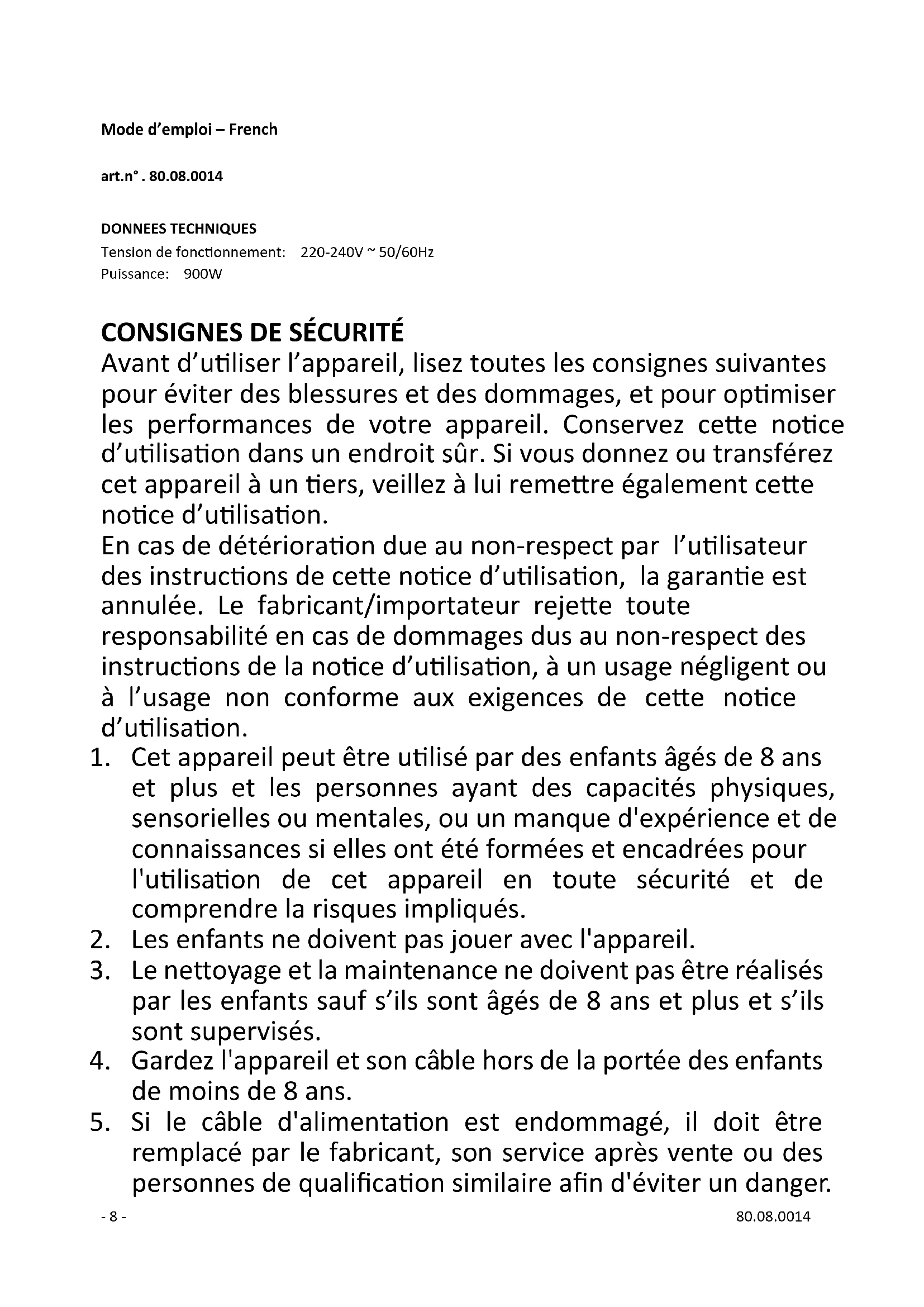 pour le nettoyage. Attention: N'immergez jamais l'appareil dans l'eau ou tout autre liquide. Il y a un danger de choc électrique ! RECYCLAGE Cet appareil est marqué du symbole du tri sélectif relatif aux déchets d’équipements électriques et électroniques. Cela signifie que ce produit doit être pris en charge par un système de collecte sélectif conformément à la directive européenne 2012/19/EU afin de pouvoir soit être recyclé soit démantelé afin de réduire tout impact sur l’environnement. Pour plus de renseignements, vous pouvez contacter votre administration locale ou régionale. Les produits électroniques n’ayant pas fait l’objet d’un tri sélectif sont potentiellement dangereux pour l’environnement et la santé humaine en raison de la présence de substances dangereuses. QUALITÉ HEMA attache une grande importance à la sécurité et à la qualité. Nous disposons de notre propre laboratoire. Ce laboratoire évalue la sécurité électrique et les propriétés d’utilisation de tous les appareils avant leur insertion dans l’assortiment. En outre, HEMA contrôle la qualité du produit en collaboration avec le fabricant. SÉCURITÉ Il est possible que cet article HEMA soit pourvu d’une bande de protection en plastique. Cette bande se trouve en dessous de l’appareil. Elle n’a aucune influence sur la qualité ou le fonctionnement de l'article et peut être enlevée sans problème. RÉPARATION Si une réparation est nécessaire, vous pouvez rapporter l’appareil, bien emballé, dans un magasin HEMA. S’il est toujours sous garantie, il doit être accompagné du bon de garantie et du bon d’achat. Vous pouvez porter votre appareil à réparer dans tous les magasins HEMA. Vérifiez régulièrement si le cordon n’est pas abîmé. Lorsque le cordon est abîmé, faites réparer l’appareil dans un magasin Hema. Ne pas remplacer le cordon soi-même. Pour des raisons de sécurité, il est conseillé de ne pas réparer soi-même des appareils électriques. GARANTIE La période de garantie est de 2 ans à compter de la date d'achat. Gardez toujours votre reçu dans un endroit sûr. C’est pratique de prendre une photo du reçu et de l’enregistrer quelque part. Vous avez alors toujours sur vous un reçu facile à lire.- 13 - 80.08.0014