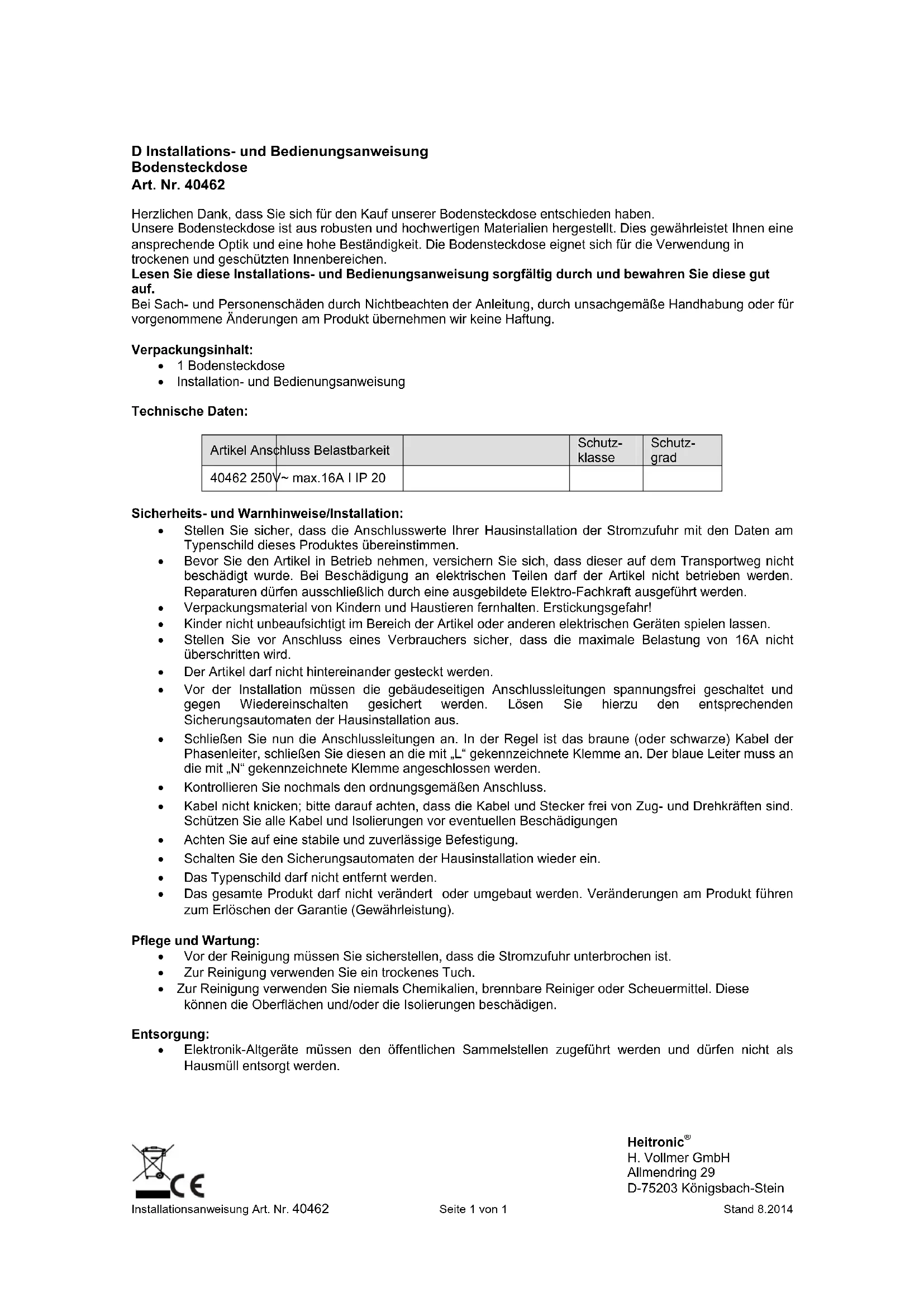art. 40462 Page 1/1 Situation 8.2014 F Mode d’installation et d’emploi Prise de sol No art. 40462 Merci d’avoir opté pour l’achat de notre prise de sol. Notre prise de sol est constituée de matériaux robustes et de haute qualité. Ce produit est donc esthétique tout en se distinguant par une grande résistance. La prise de sol convient pour une utilisation dans des intérieurs secs et protégés. Veuillez lire attentivement cette notice d’installation et d’emploi et conservez-la soigneusement. Nous n’assumerons aucune responsabilité en cas de dommages matériels ou physiques dus au non-respect du mode d’emploi, à une manipulation inadéquate ou à des modifications effectuées sur le produit. Contenu de l’emballage : 1 prise de sol Notice d’installation et d’utilisation Caractéristiques techniques : Article Raccordement Capacité de charge Classe de protection Degré de protection 40462 250V~ max.16A I IP 20 Consignes de sécurité et avertissements/installation : Assurez-vous que les valeurs de raccordement de votre installation domestique d’alimentation en courant électrique sont conformes aux données figurant sur la plaque signalétique de ce produit. Avant de mettre l'article en service, assurez-vous que celui-ci n’a pas été endommagé au cours du transport. L'article ne doit pas fonctionner en cas d’endommagement de pièces électriques. Seul un électricien qualifié est habilité à effectuer les réparations. Tenir le matériau d’emballage éloigné des enfants et animaux domestiques. Risque d’étouffement ! Ne pas laisser les enfants jouer sans surveillance à proximité des articles ou autres appareils électriques. Avant le raccordement d'un consommateur, assurez-vous que la charge maximale de 16A n'est pas dépassée. Les articles ne doivent pas être fixés les uns après les autres. Avant l’installation, les lignes de branchement dans le bâtiment doivent être mises hors tension et protégés contre toute remise en marche. Déclenchez à cet effet le disjoncteur de l’installation domestique. Raccordez à présent les fils de raccordement. En général, le câble marron (ou noir) est le fil de phase. Raccordez celui-ci à la borne marquée par un „L“. Le fil bleu doit être raccordé à la borne marquée par un „N“. Vérifiez encore une fois si le branchement est correct. Ne pas plier les câbles ; veiller SVP à ce que les câbles et connecteurs soient libres de forces de traction et de rotation. Protégez tous les câbles et isolations contre tout risque d'endommagement. Veillez à une fixation solide et fiable. Réenclenchez le disjoncteur de l’installation domestique. Il n’est pas permis d’enlever la plaque signalétique. L’ensemble du produit ne doit être ni modifié ni transformé. Les modifications du produit entraînent l’extinction de la garantie. Entretien et maintenance : Avant le nettoyage, assurez-vous que l’alimentation en courant est coupée. Utilisez un chiffon sec pour le nettoyage. N’utilisez jamais de produits chimiques, de nettoyeurs inflammables ou d’agents abrasifs pour le nettoyage. Ceux-ci peuvent endommager les surfaces et/ou les isolations. Elimination : Les appareils électroniques usagés doivent être acheminés à des centres de collecte publics et ne doivent pas être éliminés comme ordures ménagères. Heitronic