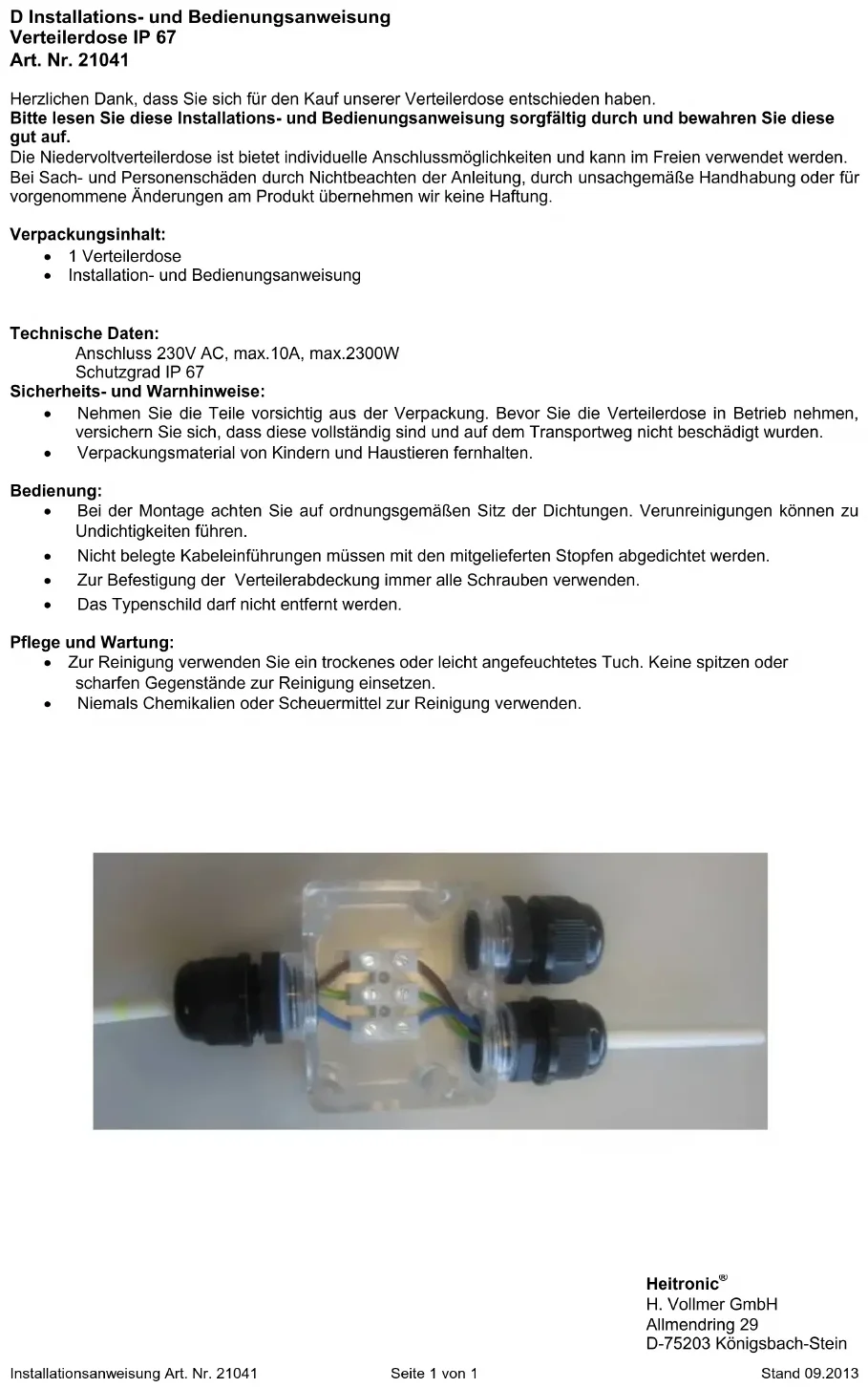 H. Vollmer GmbH Allmendring 29 D-75203 Königsbach-SteinInstruction d'installation n° d'art. 21041 Page 1 de 1 Actualisation 09.2013 F Instruction d'installation et de maniement Module de jonction IP 67 N° d'article : 21041 Merci d'avoir fait l'acquisition de l'un de nos modules de jonction. Lisez attentivement cette instruction d'installation et de maniement et conservez-la précieusement. Le module de jonction à basse tension vous offre des possibilités individuelles de branchement et peut être utilisé à l'extérieur. Nous ne sommes en aucun cas responsables des dommages sur des objets et des personnes résultant d'un maniement non conforme ou de modifications effectuées sur le produit. Contenu de l'emballage : 1 module de jonction Instruction d'installation et de maniement Caractéristiques techniques : Branchement 230V, max. 10A, max. 2300W Degré de protection IP 67 Indications de sécurité et d'avertissement : Sortez avec précaution les éléments hors de leur emballage. Avant de mettre le module de jonction en service, assurez-vous que celui-ci n'a pas été abîmé lors de son transport. Gardez le matériau d'emballage hors de portée des enfants et des animaux domestiques. Utilisation : Assurez-vous lors du montage à une bonne assise des joints. Des impuretés peuvent conduire à une mauvaise étanchéité. Les introductions de câble non attribuées doivent être rendues étanches au moyen des bouchons fournis. Toujours utiliser toutes les vis pour la fixation du recouvrement de module. La plaque signalétique ne doit pas être retirée. Entretien et maintenance : Utilisez pour le nettoyage un linge sec ou légèrement humide. Ne pas utiliser d'objets pointus ou coupants lors du nettoyage. Ne jamais utiliser de produits chimiques ou abrasifs. Heitronic