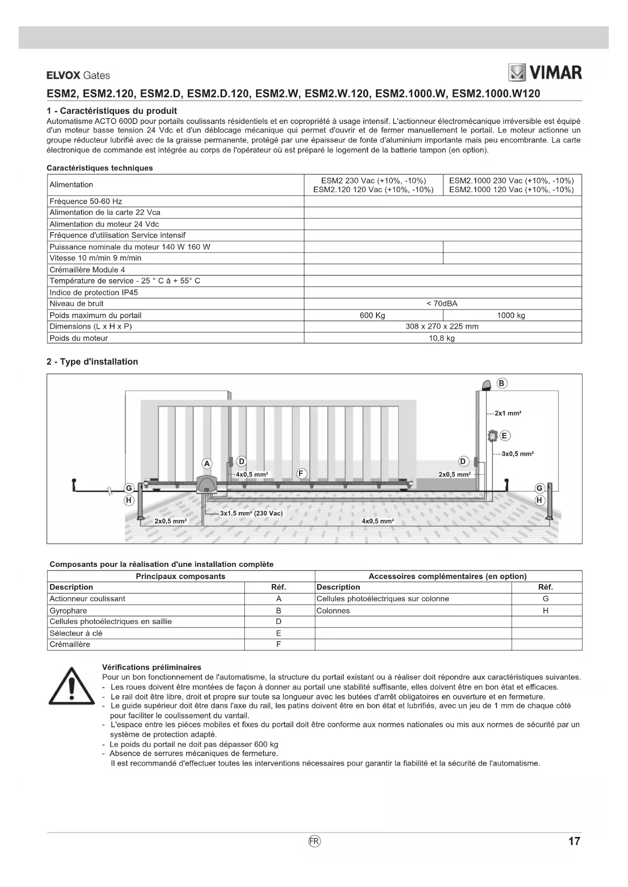 - 10 - Branchements électriques à la centrale FR17 ESM2, ESM2.120, ESM2.D, ESM2.D.120, ESM2.W, ESM2.W.120, ESM2.1000.W, ESM2.1000.W120 Vérifications préliminaires Pour un bon fonctionnement de l'automatisme, la structure du portail existant ou à réaliser doit répondre aux caractéristiques suivantes. - Les roues doivent être montées de façon à donner au portail une stabilité suffisante, elles doivent être en bon état et efficaces. - Le rail doit être libre, droit et propre sur toute sa longueur avec les butées d'arrêt obligatoires en ouverture et en fermeture. - Le guide supérieur doit être dans l'axe du rail, les patins doivent être en bon état et lubrifiés, avec un jeu de 1 mm de chaque côté pour faciliter le coulissement du vantail. - L'espace entre les pièces mobiles et fixes du portail doit être conforme aux normes nationales ou mis aux normes de sécurité par un système de protection adapté. - Le poids du portail ne doit pas dépasser 600 kg - Absence de serrures mécaniques de fermeture. Il est recommandé d'effectuer toutes les interventions nécessaires pour garantir la fiabilité et la sécurité de l'automatisme. p. 22