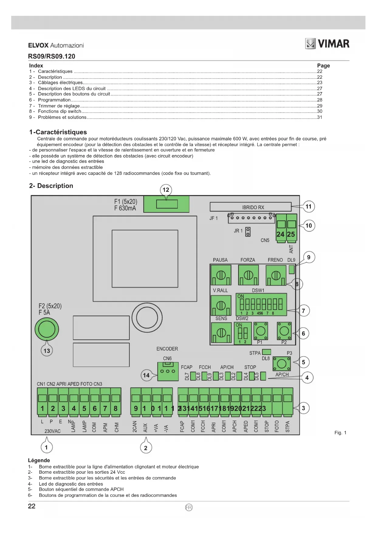 Légende1- Borne extractible pour la ligne d'alimentation clignotant et moteur électrique2- Borne extractible pour les sorties 24 Vcc3- Borne extractible pour les sécurités et les entrées de commande4- Led de diagnostic des entrées5- Bouton séquentiel de commande APCH6- Boutons de programmation de la course et des radiocommandes FR23 RS09/RS09.120 Fig. 2 230 V~