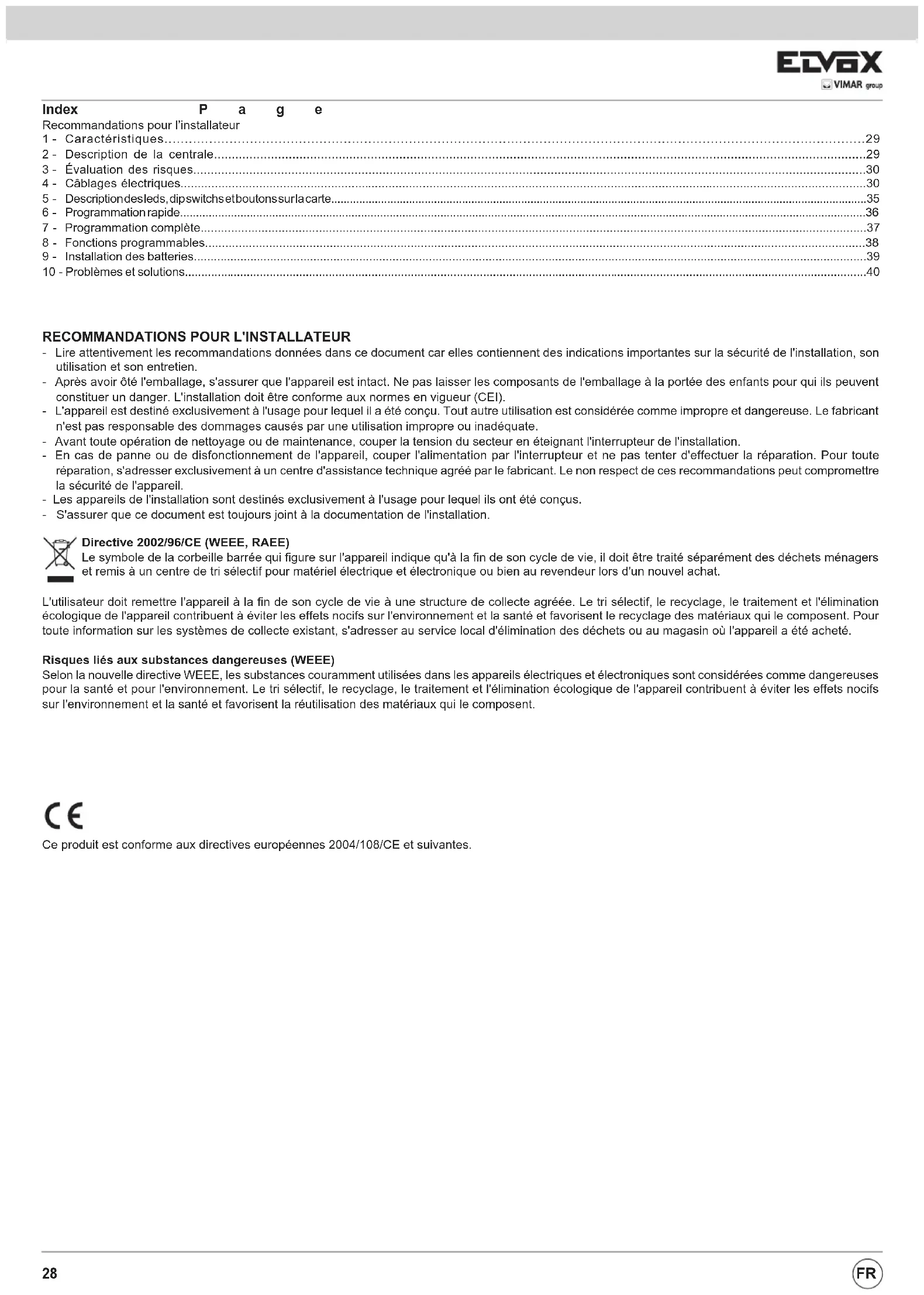 - Lire attentivement les recommandations données dans ce document car elles contiennent des indications importantes sur la sécurité de l'installation, son utilisation et son entretien. - Après avoir ôté l'emballage, s'assurer que l'appareil est intact. Ne pas laisser les composants de l'emballage à la portée des enfants pour qui ils peuvent constituer un danger. L'installation doit être conforme aux normes en vigueur (CEI). - L'appareil est destiné exclusivement à l'usage pour lequel il a été conçu. Tout autre utilisation est considérée comme impropre et dangereuse. Le fabricant n'est pas responsable des dommages causés par une utilisation impropre ou inadéquate. - Avant toute opération de nettoyage ou de maintenance, couper la tension du secteur en éteignant l'interrupteur de l'installation. - En cas de panne ou de disfonctionnement de l'appareil, couper l'alimentation par l'interrupteur et ne pas tenter d'effectuer la réparation. Pour toute réparation, s'adresser exclusivement à un centre d'assistance technique agréé par le fabricant. Le non respect de ces recommandations peut compromettre la sécurité de l'appareil. - Les appareils de l'installation sont destinés exclusivement à l'usage pour lequel ils ont été conçus. - S'assurer que ce document est toujours joint à la documentation de l'installation. Directive 2002/96/CE (WEEE, RAEE) Le symbole de la corbeille barrée qui figure sur l'appareil indique qu'à la fin de son cycle de vie, il doit être traité séparément des déchets ménagers et remis à un centre de tri sélectif pour matériel électrique et électronique ou bien au revendeur lors d'un nouvel achat. L'utilisateur doit remettre l'appareil à la fin de son cycle de vie à une structure de collecte agréée. Le tri sélectif, le recyclage, le traitement et l'élimination écologique de l'appareil contribuent à éviter les effets nocifs sur l'environnement et la santé et favorisent le recyclage des matériaux qui le composent. Pour toute information sur les systèmes de collecte existant, s'adresser au service local d'élimination des déchets ou au magasin où l'appareil a été acheté. Risques liés aux substances dangereuses (WEEE) Selon la nouvelle directive WEEE, les substances couramment utilisées dans les appareils électriques et électroniques sont considérées comme dangereuses pour la santé et pour l'environnement. Le tri sélectif, le recyclage, le traitement et l'élimination écologique de l'appareil contribuent à éviter les effets nocifs sur l'environnement et la santé et favorisent la réutilisation des matériaux qui le composent. Ce produit est conforme aux directives européennes 2004/108/CE et suivantes. FR29