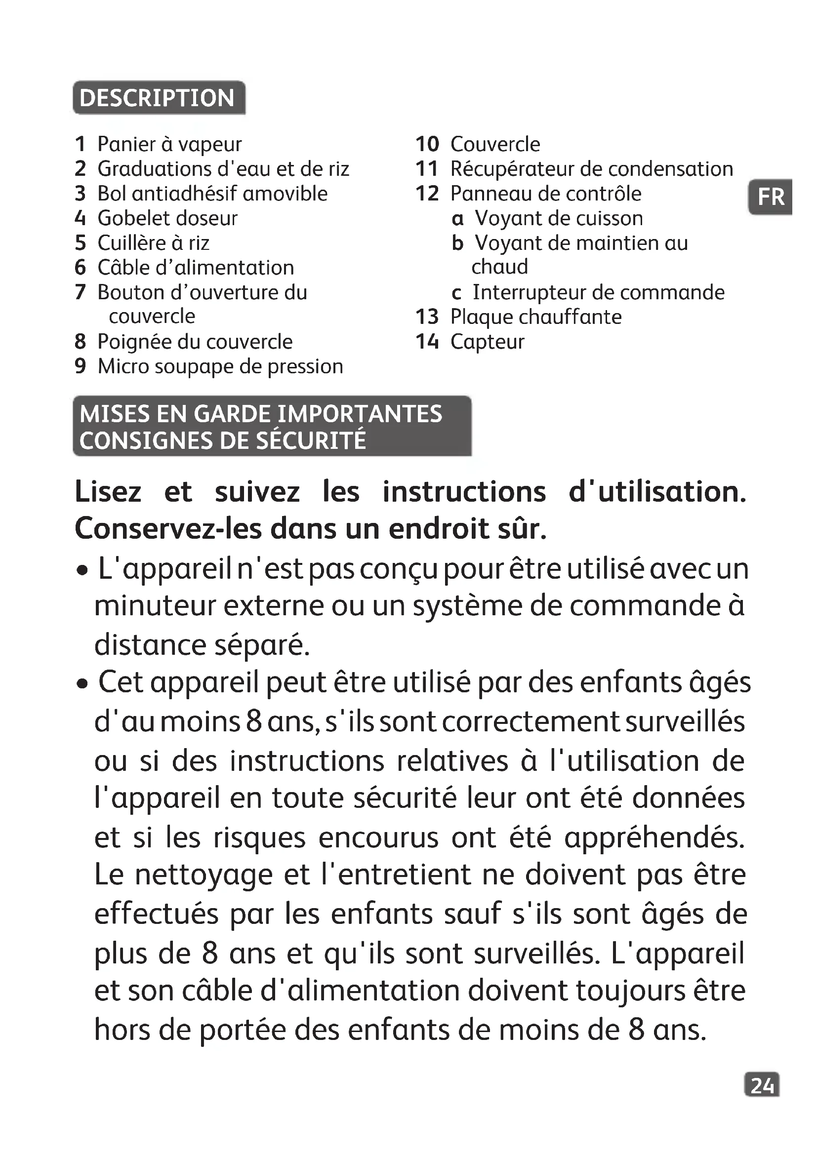 - Cet appareil peut être utilisé par des enfants âgés d'au moins 8 ans, s'ils sont correctement surveillés ou si des instructions relatives à l'utilisation de l'appareil en toute sécurité leur ont été données et si les risques encourus ont été appréhendés. Le nettoyage et l'entretient ne doivent pas être effectués par les enfants sauf s'ils sont âgés de plus de 8 ans et qu'ils sont surveillés. L'appareil et son câble d'alimentation doivent toujours être hors de portée des enfants de moins de 8 ans.25