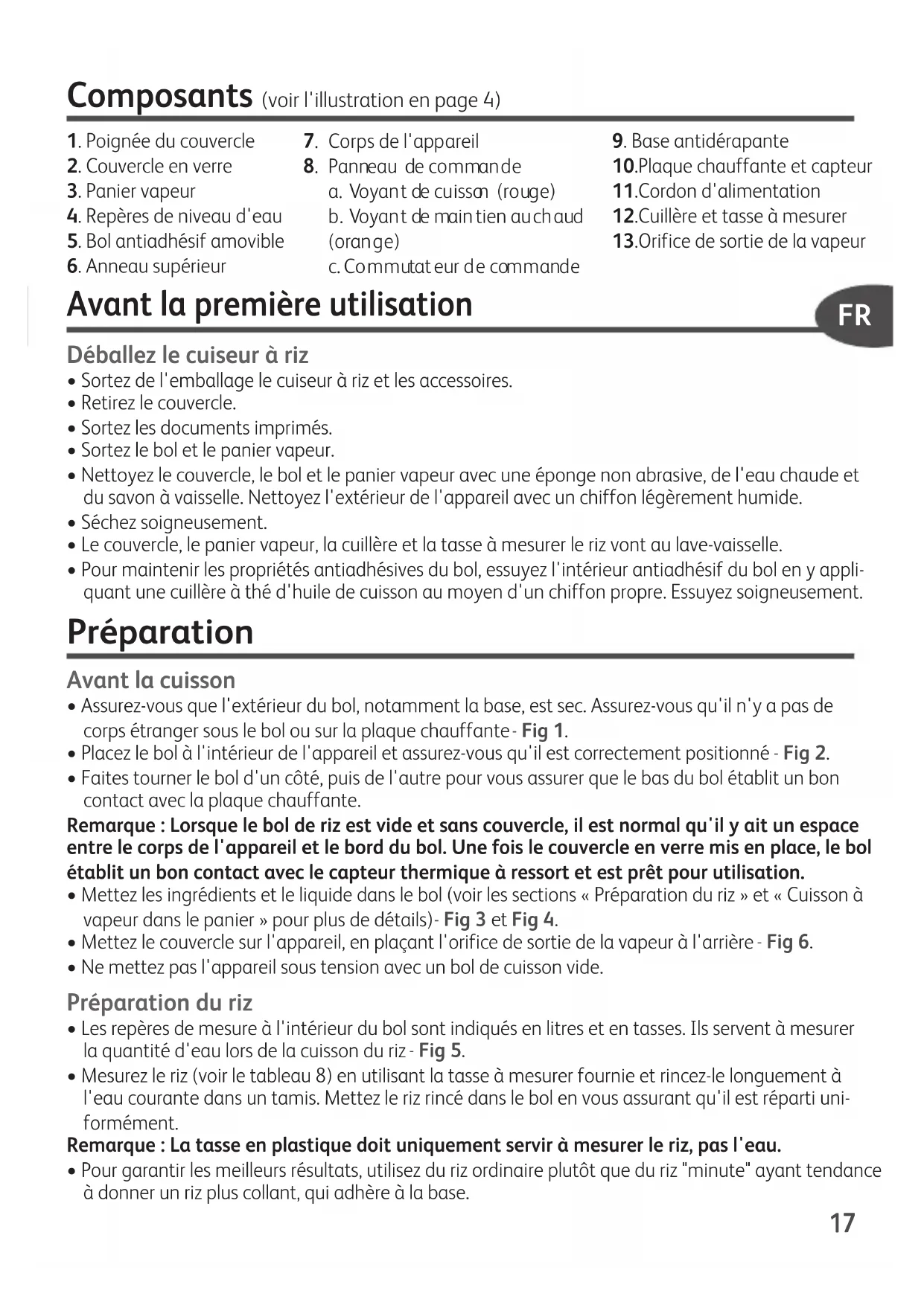 T-FAL-COLTUCH-NC00027923-02 23/08/12 17:41 Page16Composants (voir l'illustration en page 4) 1. Poignée du couvercle2. Couvercle en verre3. Panier vapeur4. Repères de niveau d'eau5. Bol antiadhésif amovible6. Anneau supérieur