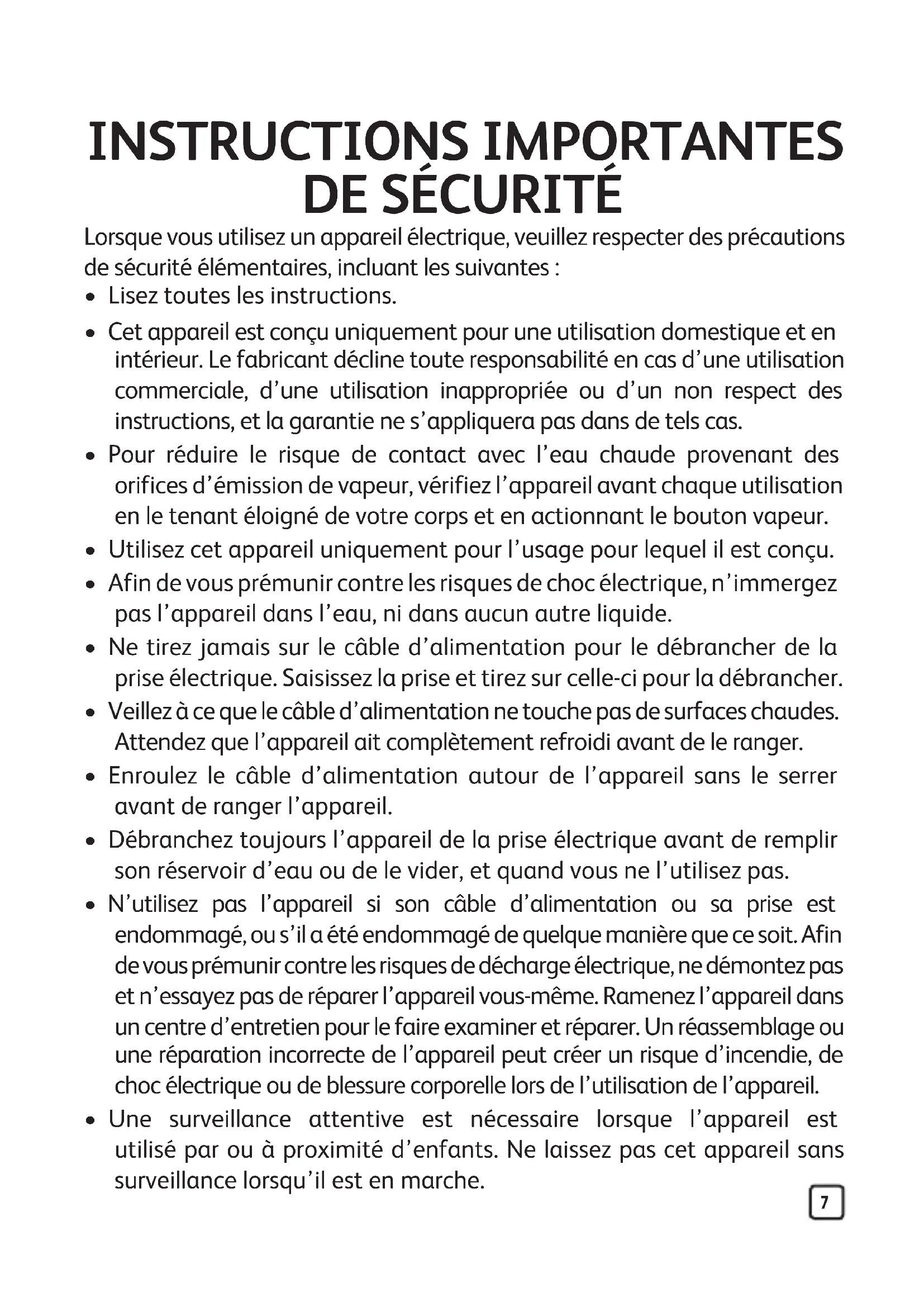 - Votre appareil a été conçu pour fonctionner avec de l’eau du robinet. Il est cependant nécessaire de procéder régulièrement à l’auto- nettoyage de la chambre de vaporisation, afin d’éliminer le calcaire libre. Si votre eau est très calcaire, mélanger 50% d’eau du robinet et 50% d’eau déminéralisée du commerce. N’utilisez jamais d’eau contenant des additifs (amidon, parfum, substances aromatiques, adoucissant, etc.), ni de l’eau de condensation (par exemple l’eau des séchoirs à linge, l’eau de réfrigérateurs, l’eau des climatiseurs, l’eau de pluie). Elles contiennent des déchets organiques ou des minéraux qui se concentrent sous l’effet de la chaleur et provoquent des crachements, des coulures brunes ou un vieillissement prématuré de votre appareil CONSERVEZ CES INSTRUCTIONS10 INSTRUCCIONES DE SEGURIDAD IMPORTANTES Cuando utilice el aparato, deberá respetar unas medidas de seguridad básicas, incluyendo las que se describen a continuación: