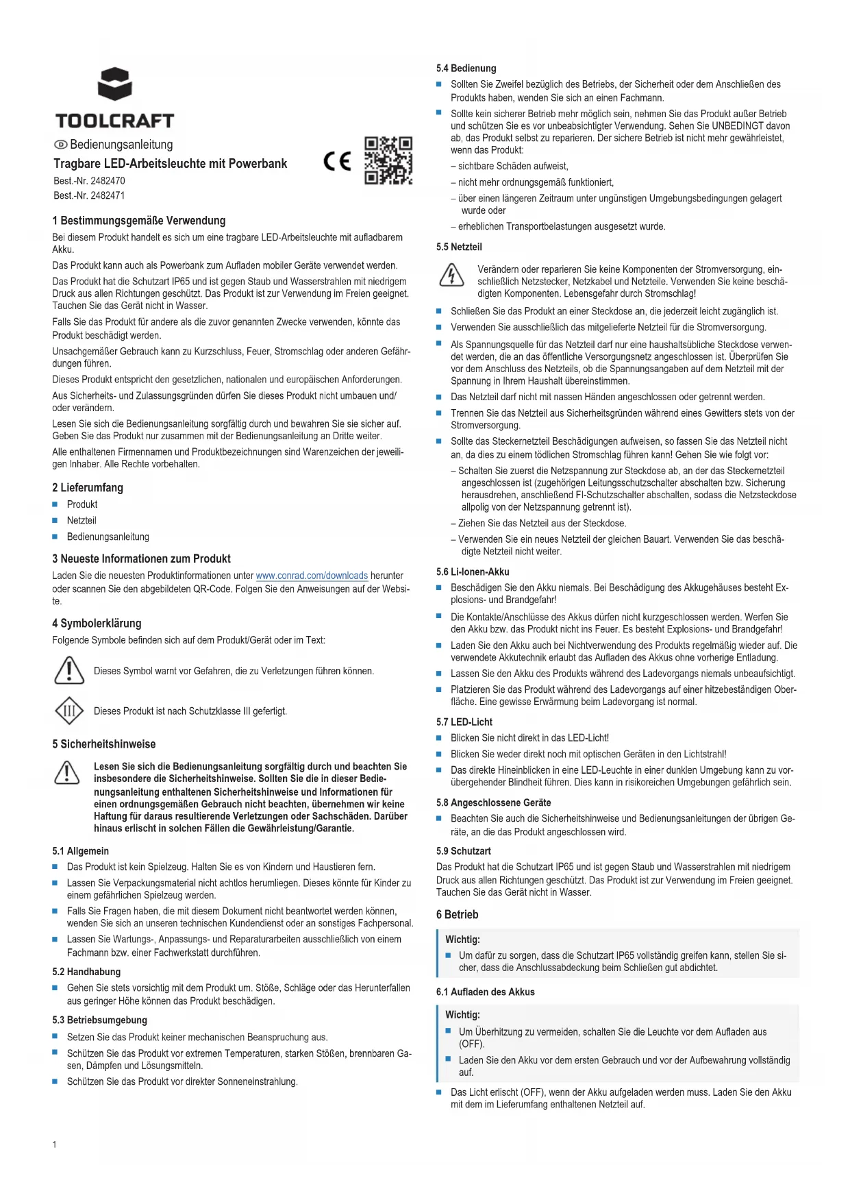 - - 240 V/AC, 50/60 Hz Output V/DC, 1.5 A This is a publication by Conrad Electronic SE, Klaus-Conrad-Str. 1, D-92240 Hirschau (www.conrad.com). All rights including translation reserved. Reproduction by any method (e.g. photocopying, microfilming or the capture in electronic data processing systems) requires prior written approval from the editor. Reprinting, also in part, is prohibited. This publication reflects the technical status at the time of printing. Copyright by Conrad Electronic SE. *2482470-1_V3_1022_dh_mh_en 18014399037298699-2 I3/O3 en5 Mode d’emploi Lampe de travail LED portable avec batterie externe N° de commande 2482470 N° de commande 2482471 1 Utilisation prévue Le produit est une lampe de travail LED portable avec une batterie rechargeable. Le produit peut également fonctionner comme une batterie externe pour charger les appa- reils mobiles. Le produit a un indice de protection IP65 et est protégé contre la poussière et les projections d'eau à basse pression provenant de toutes les directions. Le produit est adapté à une utili- sation en extérieur. Ne plongez pas le produit dans l’eau. Toute utilisation à des fins autres que celles décrites pourrait endommager le produit. Une mauvaise utilisation peut entraîner des risques tels que des courts-circuits, des incen- dies, des chocs électriques, etc. Ce produit est conforme aux exigences nationales et européennes en vigueur. Pour des raisons de sécurité et d’homologation, toute restructuration et/ou modification du produit est interdite. Lisez attentivement les instructions du mode d’emploi et conservez-le dans un endroit sûr. Ne mettez ce produit à la disposition de tiers qu’avec son mode d’emploi. Tous les noms d’entreprises et appellations de produits sont des marques commerciales de leurs propriétaires respectifs. Tous droits réservés. 2 Contenu de l'emballage p. 15