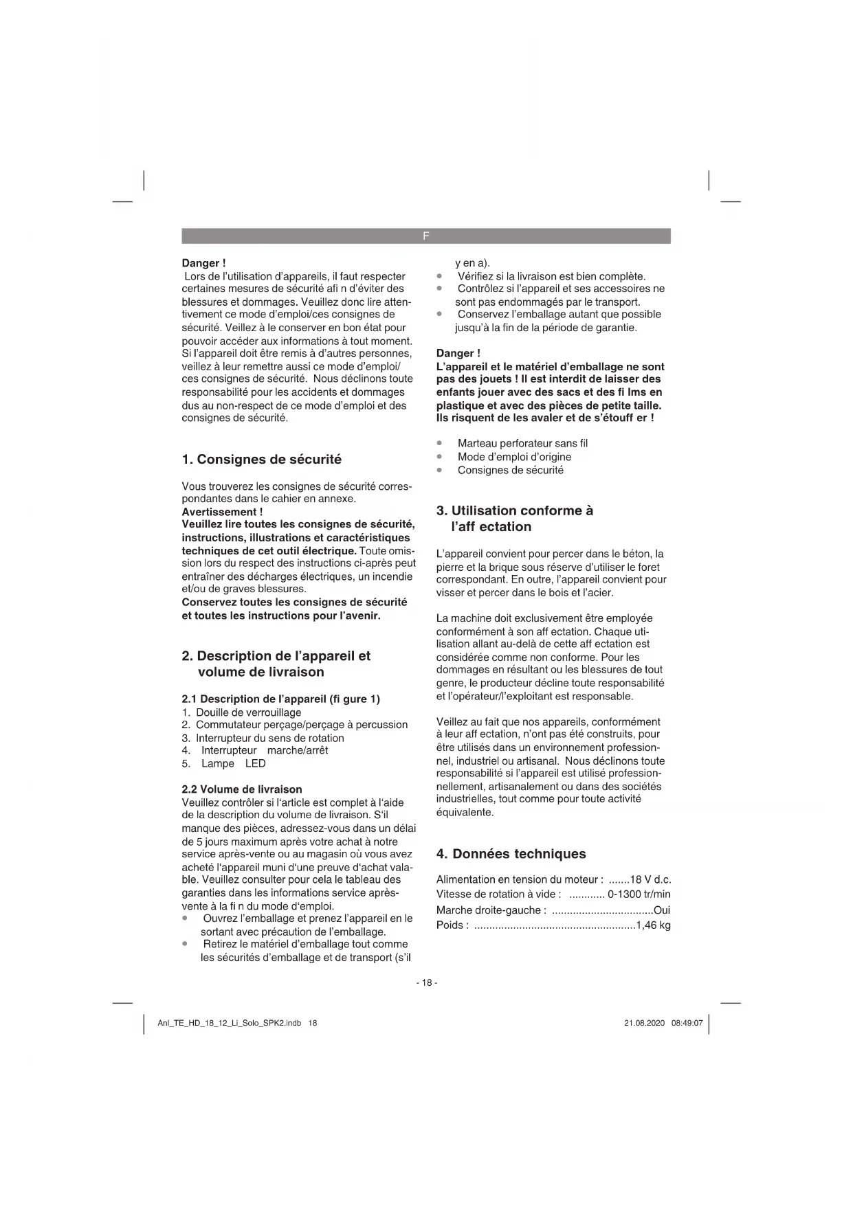 (fi g. 6/pos. e) Appuyez sur l’interrupteur pour l’indicateur de charge de l’accumulateur (d). L’indicateur de charge de l’accumulateur (e) vous indique l’état de charge de l’accumulateur à l’aide de trois vo- yants LED. Les 3 voyants LED sont allumés : L’accumulateur est complètement rechargé. 2 ou 1 voyant LED est (sont) allumé(s) L‘accumulateur dispose encore d‘un résidu de charge suffi sant. Anl_TE_HD_18_12_Li_Solo_SPK2.indb 20Anl_TE_HD_18_12_Li_Solo_SPK2.indb 20 21.08.2020 08:49:0721.08.2020 08:49:07F