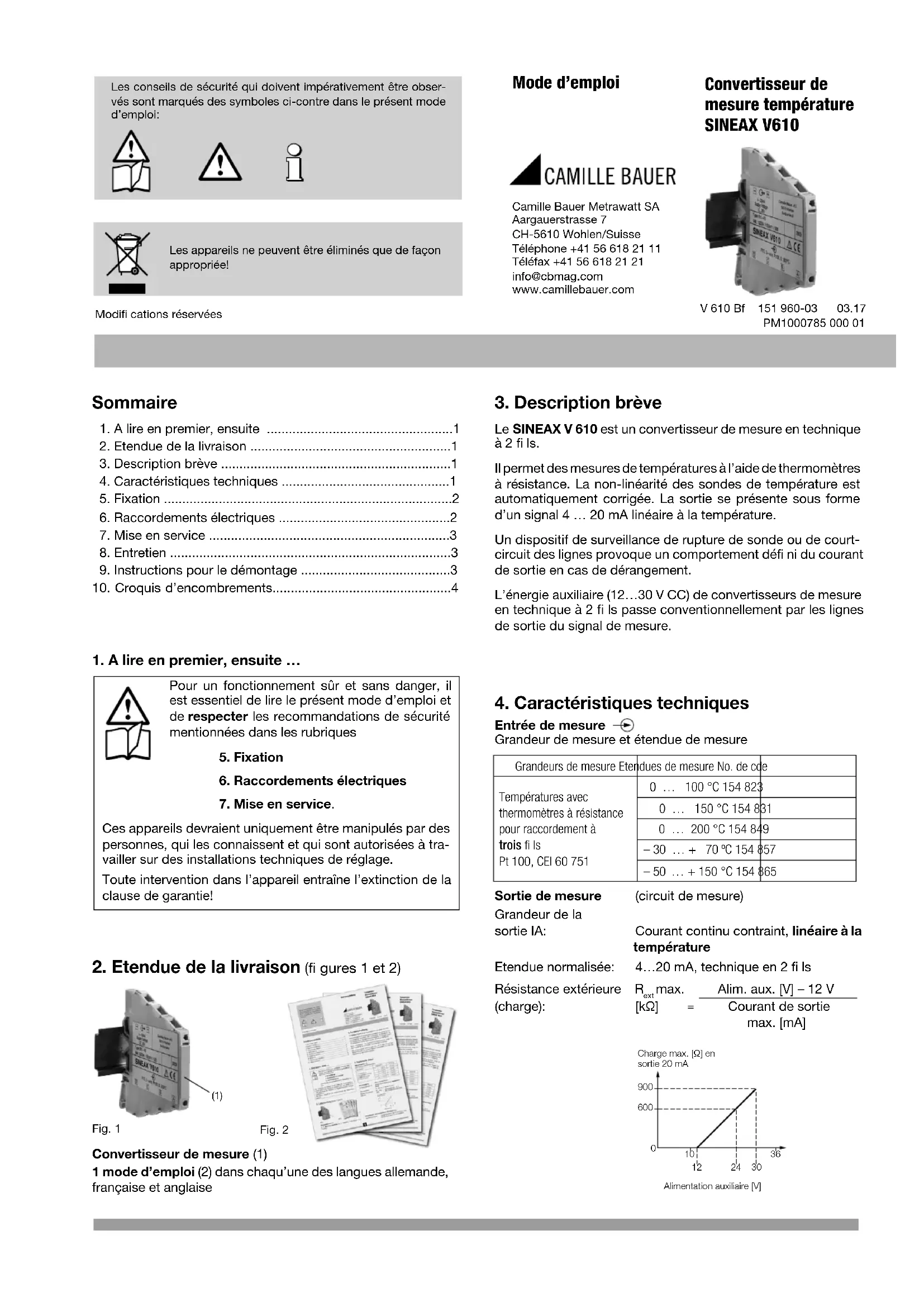 Sineax V610 - Convertisseur de mesure Camille Bauer - Notice d'utilisation et mode d'emploi gratuit