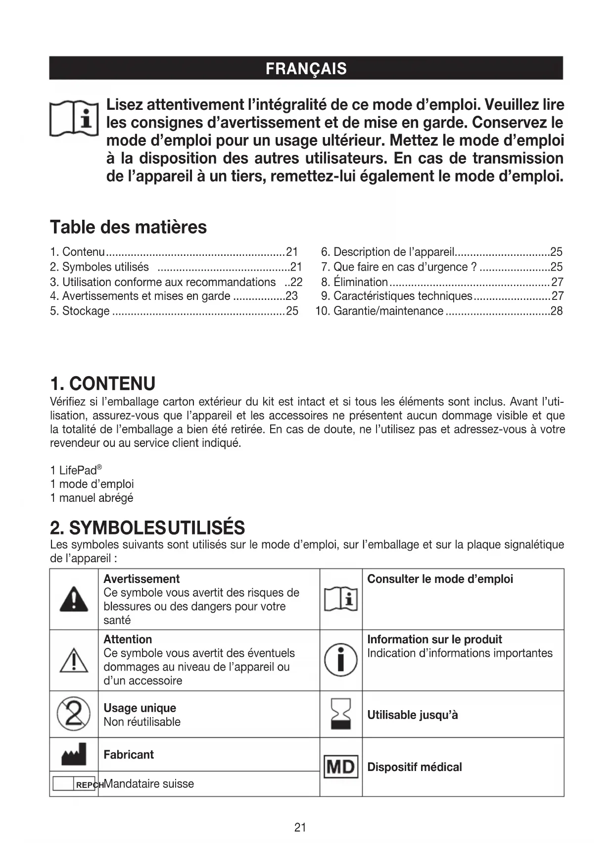 Les symboles suivants sont utilisés sur le mode d’emploi, sur l’emballage et sur la plaque signalétique de l’appareil: Avertissement Ce symbole vous avertit des risques de blessures ou des dangers pour votre santé Consulter le mode d’emploi Attention Ce symbole vous avertit des éventuels dommages au niveau de l’appareil ou d’un accessoire Information sur le produit Indication d’informations importantes Usage unique Non réutilisable Utilisable jusqu’à Fabricant Dispositif médical REPCH Mandataire suisse22 UDI Unique Device Identifier (UDI) Identifiant unique du produit Référence de l’article Numéro de série Désignation du lot Classe de sécurité Protection contre les corps solides, diamètre 1mm ou plus, et contre les pro
