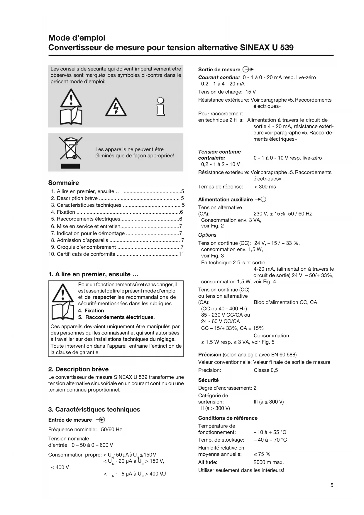 Bild 8. Gehäuse P8/35 auf Hutschiene (35 ×15 mm oder 35 ×7,5 mm) nach EN 50 022.5 Mode d’emploi Convertisseur de mesure pour tension alternative SINEAX U 539 Les conseils de sécurité qui doivent impérativement être observés sont marqués des symboles ci-contre dans le présent mode d’emploi: Les appareils ne peuvent être éliminés que de façon appropriée! Sommaire