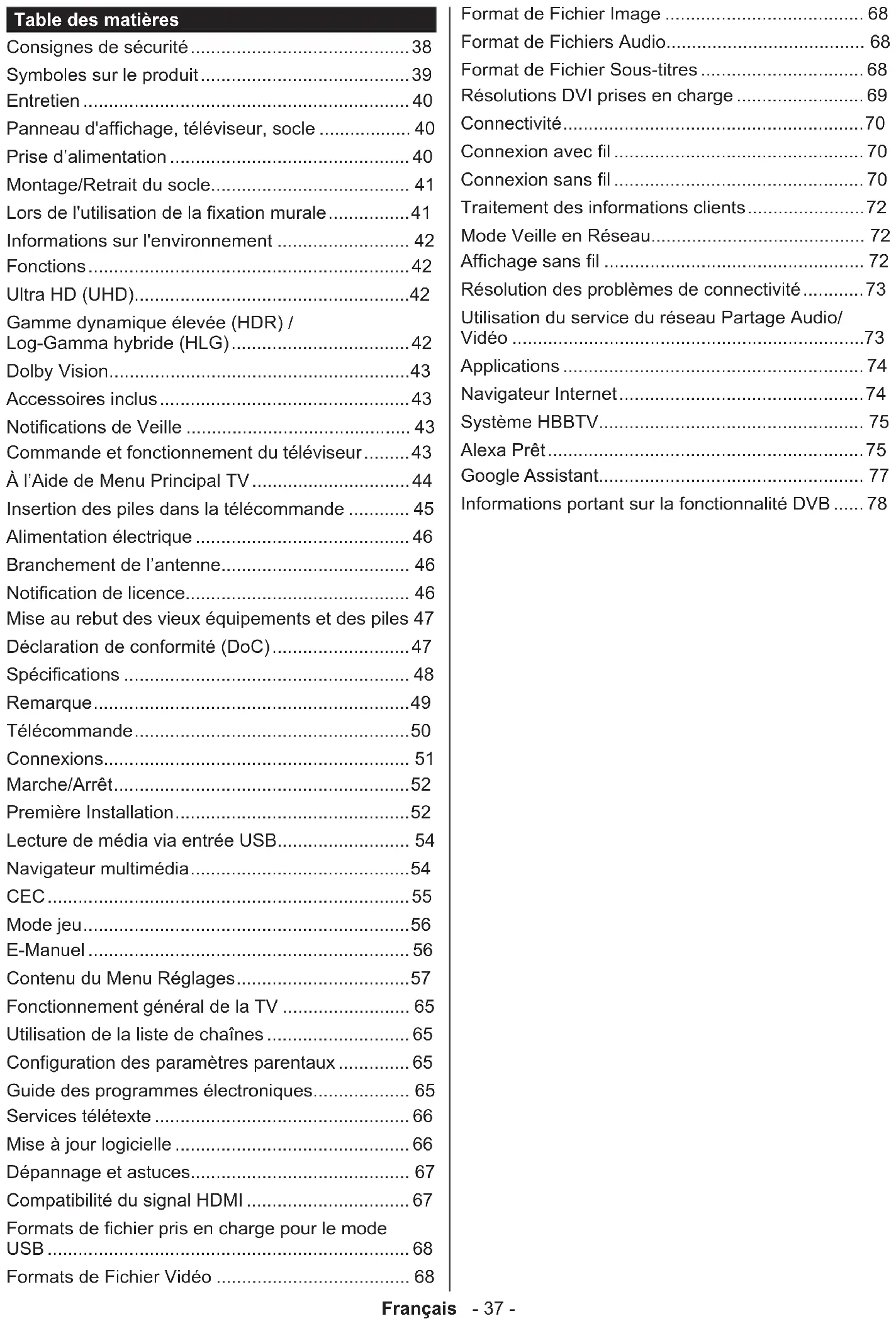 MPEG Layer 1/2/3, AAC, AC3 .flv Sorenson Spark, MPEG4, H.264 MPEG Layer 3, ADPCM, AAC LC .asf/.wmv MPEG4, WMV3, VC1 WMA, AMR-NB .webm VP9, VP8, AV1 OPUS, Vorbis Format de Fichier Image Extension du fichier Formater .jpg/.jpeg JPEG, PJPEG .bmp BMP .png PNG Format de Fichiers Audio Extension du fichier Formater Code vidéo Audio .mp3 mp3 .aac AAC .wma WMA .wav MPEG Layer 1/2/3, AAC, PCM .m4a TV, M4A : AAC Format de Fichier Sous-titres Sous-titres externes Extension Spécifications .ssa Sous-station Alpha .ass Sous-station Alpha avancée .srt Subripper .sub Micro DVD / SubViewer .txt Micro DVD / TMPlayer / MPL2 .smi Sami Sous-titrages internes Extension Spécifications .mkv VOBSub .mkv ASS / SSA / TEXTE dat, mpg, mpeg, vob Sous-titrage DVD .mp4 Sous-titrage DVD, TEXTEFrançais - 69 - Résolutions DVI prises en charge Reportez-vous aux résolutions suivantes au moment de connecter des périphériques à votre téléviseur à l’aide des câbles convertisseurs DVI (DVI à HDMI - non fournis). 56Hz 60Hz 66Hz 70Hz 72Hz 75Hz 640x480 x x 800x600 x x x 1024x768 x x x 1280x768 x x 1280x960 x 1360x768 x 1366x768 x 1280x1024 x x x 1400x1050 x 1600x900 x 1920x1080 xFrançais - 70 - Connectivité Connexion avec fil Connexion à un réseau câblé