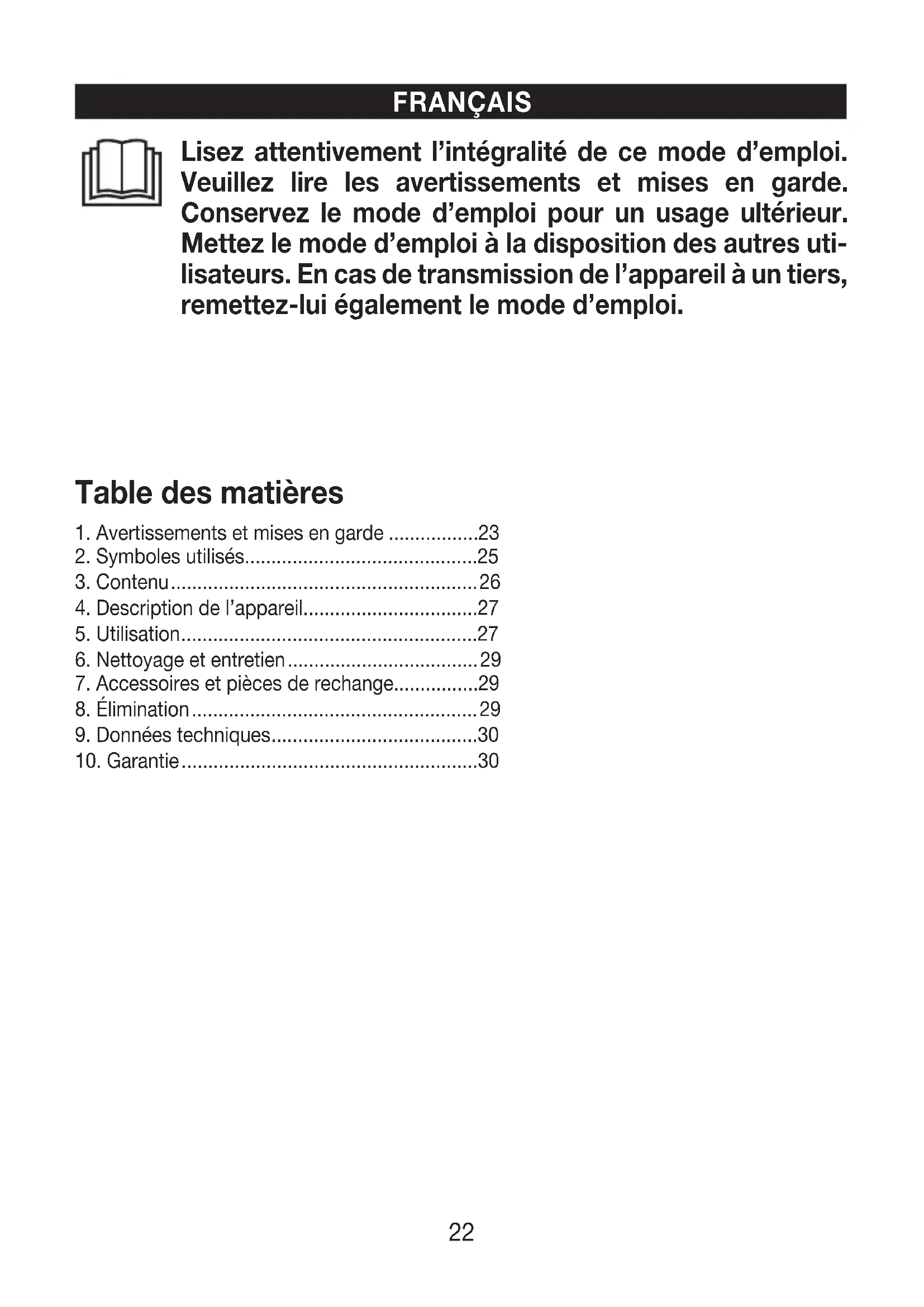 Further information on the warranty and warranty conditions can be found in the warranty leaflet supplied. Subject to errors and changes22 Lisez attentivement l’intégralité de ce mode d’emploi. Veuillez lire les avertissements et mises en garde. Conservez le mode d’emploi pour un usage ultérieur. Mettez le mode d’emploi à la disposition des autres uti